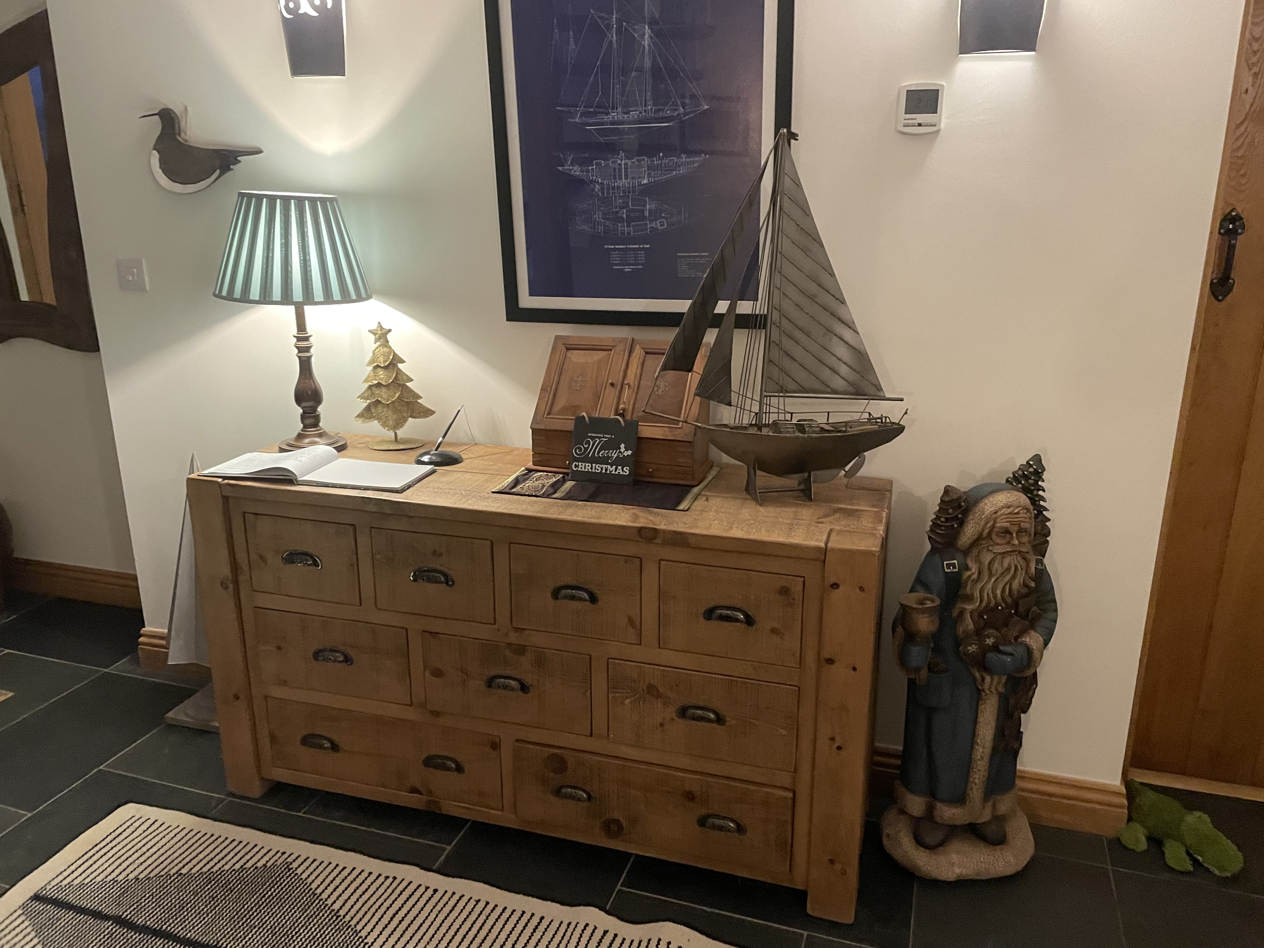 Wow! "Wow what a location and what a house! We are so thrilled to have this fabulous holiday house. It really has the feel-good factor. From almost every window you can see Criccieth castle - and of course the sea! If you are looking for privacy and inspirational views, this is the house for you. This picture-postcard cottage is only a short walk from the small seaside town of Criccieth. With a footpath leading down to the beach. and so peaceful and serene - you will feel relaxed and at one with the world! Inside, the owners have created a truly stunning home from home, carefully thought out and with no expense spared. Part original, part new, it is joined together by an amazing slate-floored room with rocking chairs looking out to sea through a glass wall and featuring a beautifully constructed staircase, Cae'r Dyni is furnished throughout with original and hand-crafted pieces. 1 x Twin Bedroom downstairs, The cosy sitting room has the most incredible views out across the ever changing seascape. Comfy sofas are set around a wood burner. There are chairs which you can turn to face looking out of the windows, too. There’s a flat screen TV, DVD player and hi-fi. The kitchen is open plan with a dining space to one end of the room, too. There’s a log burning Esse cooker, an electric cooker and gas hob as well as an American-style fridge with freezer, a microwave and a dishwasher. The large utility room with sink houses the washing machine and dryer. The dining area has a table lovingly made by the Owners. There are eight leather chairs, a wood burning stove and oak floors with underfloor heating making a great space for family meals. Ground floor twin bedroom. The ground floor also has a cloakroom with loo and wash hand basin. On the first floor are three bedrooms, all furnished to a good standard. The master room has a solid wooden ‘stocks' bed. It also has an ensuite with a sumptuous roll-top bath, a separate corner shower and an incredible wash basin which started it’s life in Marrakesh and is now in a holiday cottage in North Wales! There are two further double bedrooms, one of which has an ensuite shower room. All bedrooms have TVs and DVD players. A fab family bathroom with slipper bath, separate shower, loo and wash hand basin. Head outside and you’ll find a gravel area with seating that boasts some of the best views from a holiday house in Criccieth! Just soak up the sea views and the sea air from here with a glass of wine come sunset. There is off-road parking next to the property.
