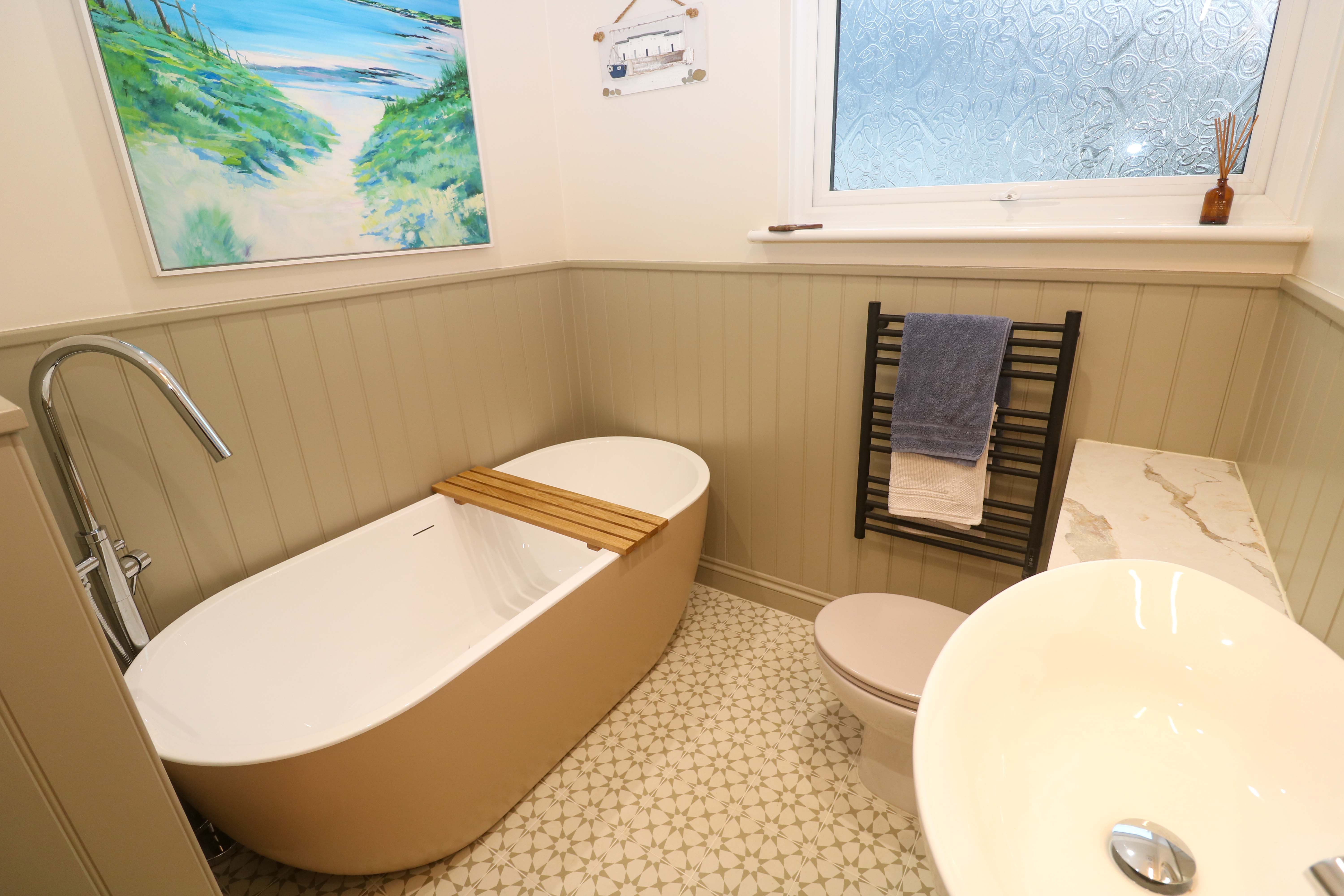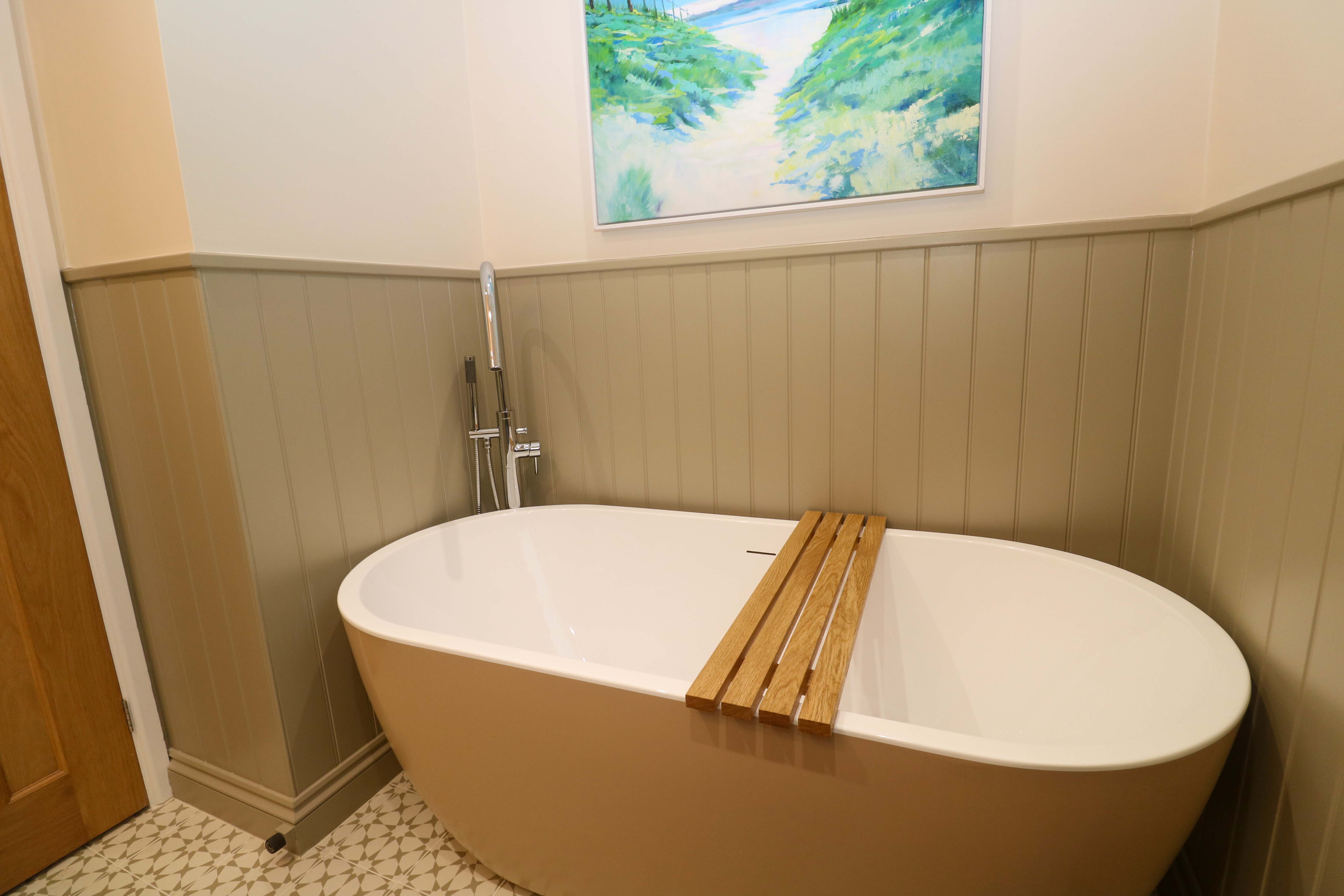 Electric central heating. Electric oven and hob, fridge/freezer, dishwasher, washing machine, tumble dryer, microwave, Nespresso coffee machine, smart TV with Freeview, Netflix and WiFi. Fuel and power inc. in rent. Bed linen and towels inc. in rent, please bring your own beach towels. Travel cot and highchair available. Off-road parking for two medium-sized cars. Lawn and patio garden area with bench seating, fire pit and barbecue grill. Balcony. Two well-behaved dogs welcome. Sorry, no smoking. Shop 0.3 miles, pub 0.3 miles.