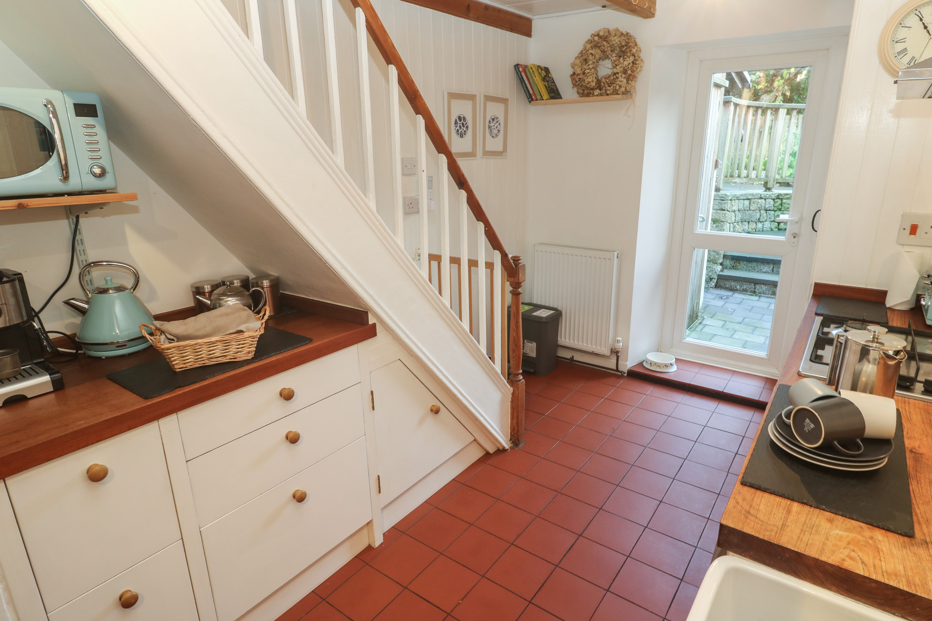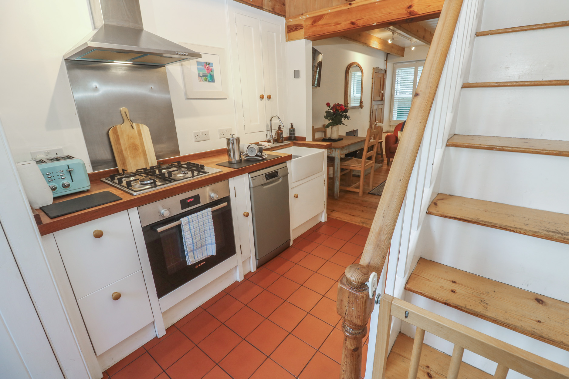 Gas central heating. Electric oven and gas hob, microwave, fridge with ice box, external washer/dryer, dishwasher. TV and WiFi. Fuel, power and starter pack for woodburning stove inc. in rent. Bed linen and towels inc. in rent. Travel cot, highchair and stairgate available. Roadside parking on a first-come, first-served basis or public car park within 100yds. Rear, enclosed multi-level courtyard with furniture and storage. Two well-behaved pets welcome. Sorry, no smoking. Shop 0.3 miles, pub 0.1 miles, beach 0.2 miles. Note: Narrow, steep stairs leading to the first floor, please take care. Note: Due to the layout of the landing, there is a small step down from the bedrooms at the top of the stairs. Note: Other pets can be arranged by prior arrangement. Note: There are steps in the garden