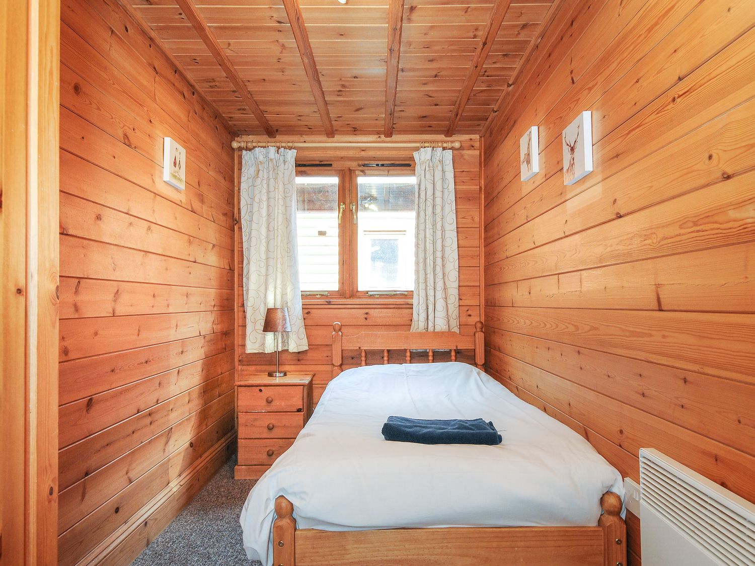 Electric storage heating with woodburning stove. Electric oven, electric hob, microwave, fridge/freezer, washing machine, dishwasher, kettle, toaster, TV and Wifi. Fuel and power inc. in rent. Bed linen and towels inc. in rent. Highchair, stairgate and travel cot available. Off-road parking for 2 cars. Enclosed front decking with furniture and communal grass area. Two well-behaved dogs welcome at a charge of £30 per dog. Sorry, no smoking. Shop 1.2 miles, pub 1.5 miles.