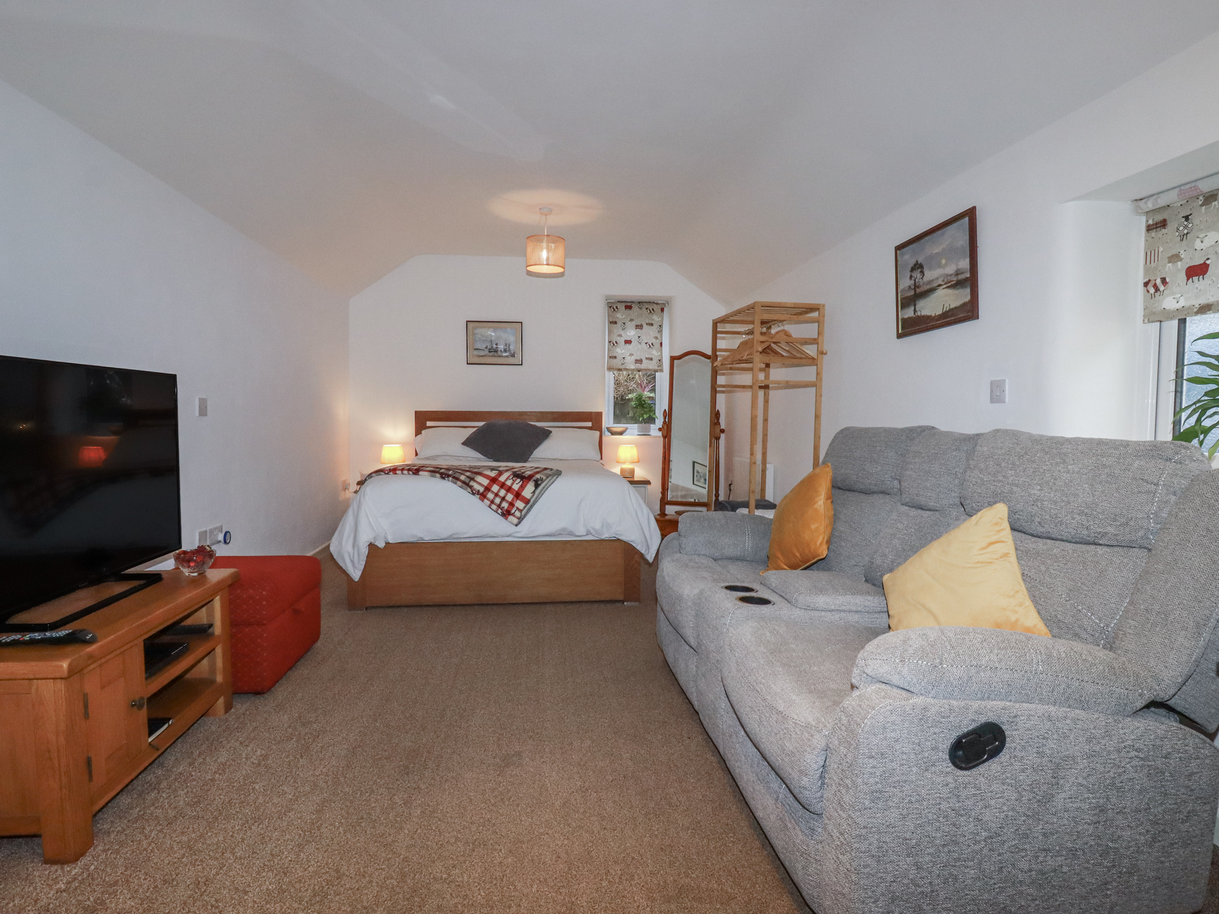 Bramble Barn is a lovely and cosy open plan studio cottage situated in the grounds of the owner's home, on their farm, in a hamlet location, near the village of Lanivet and town of Wadebridge. This single-storey cottage sleeps two people and has an open plan living/sleeping area with a king-size bed, kitchen, dining area and sitting area, along with a shower room. Outside there's off road parking for one car, a patio with furniture and use of a lawned garden with patio and furniture. Bramble Barn is a charming base with the whole of Cornwall just waiting to be explored. Please Note - This property has a Good housekeeping bond of £100.00. Please Note - From 1st October - 28th February a £40.00 supplement will be added to your booking for fuel & power. Please note: 2 x dogs allowed. Please note: New, Double reclining sofa, new carpets and Fibre broadband added, pictures to follow. Please note: 2 night minimum stays only accepted.
