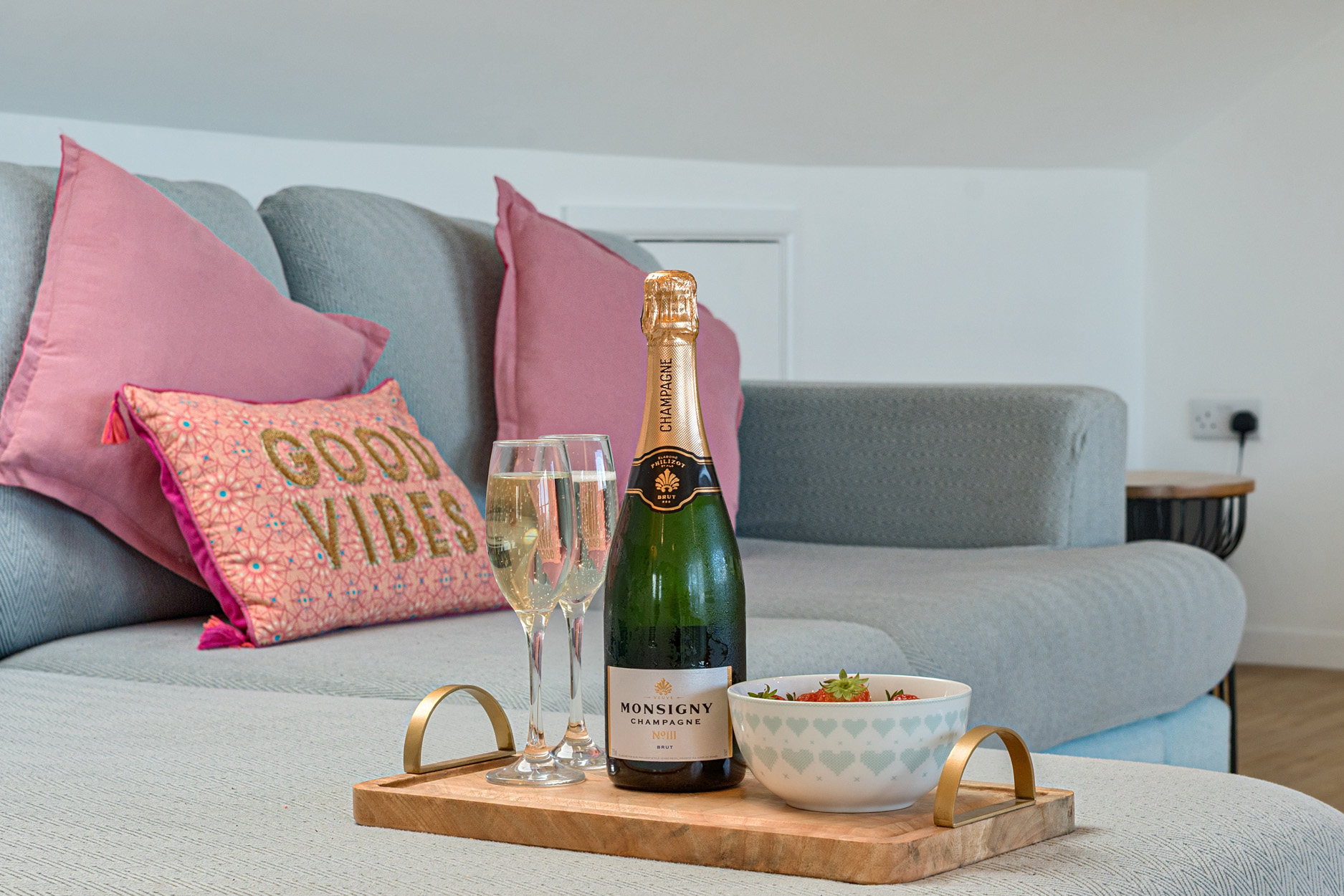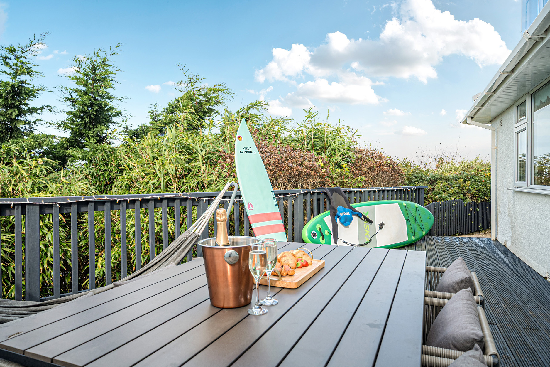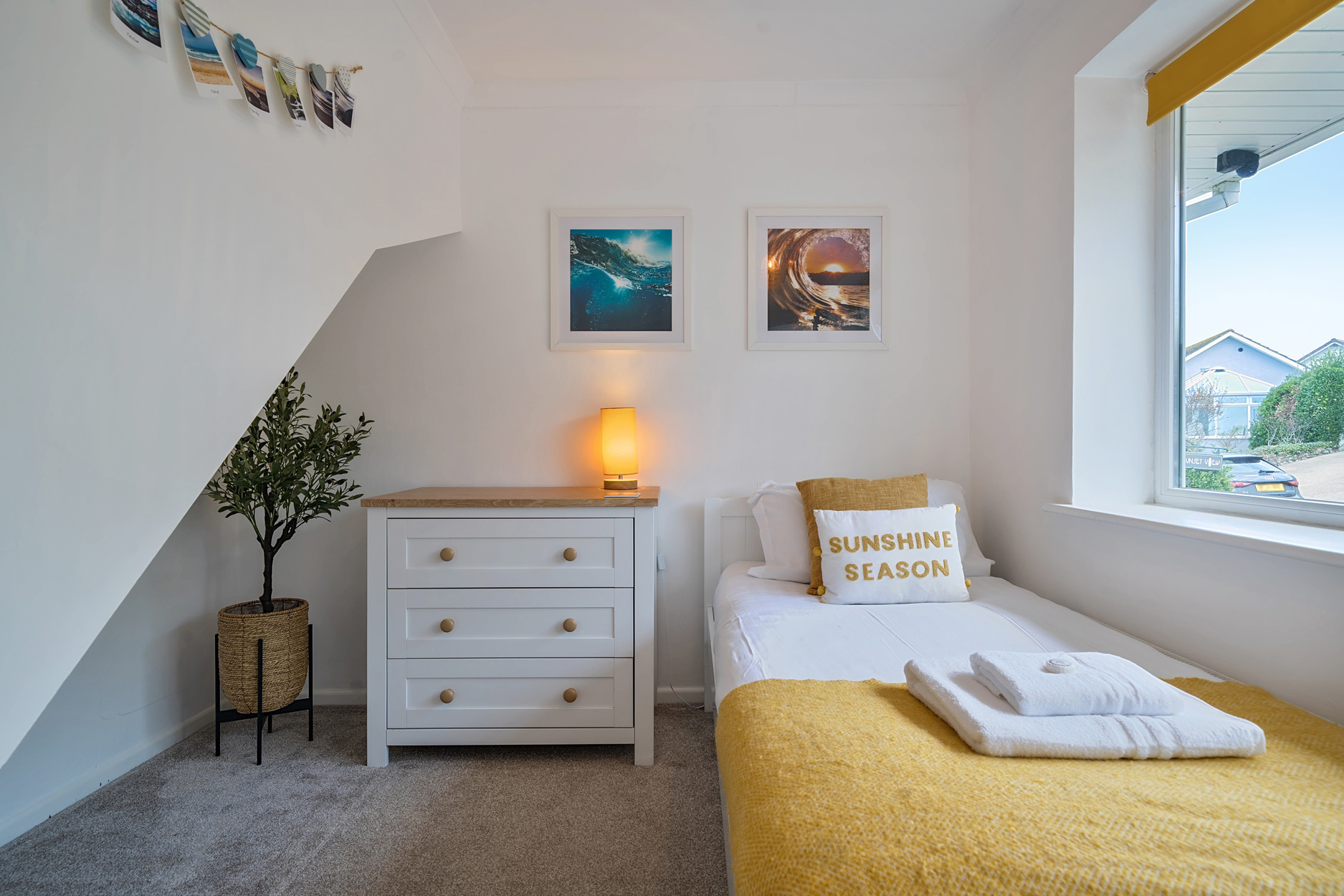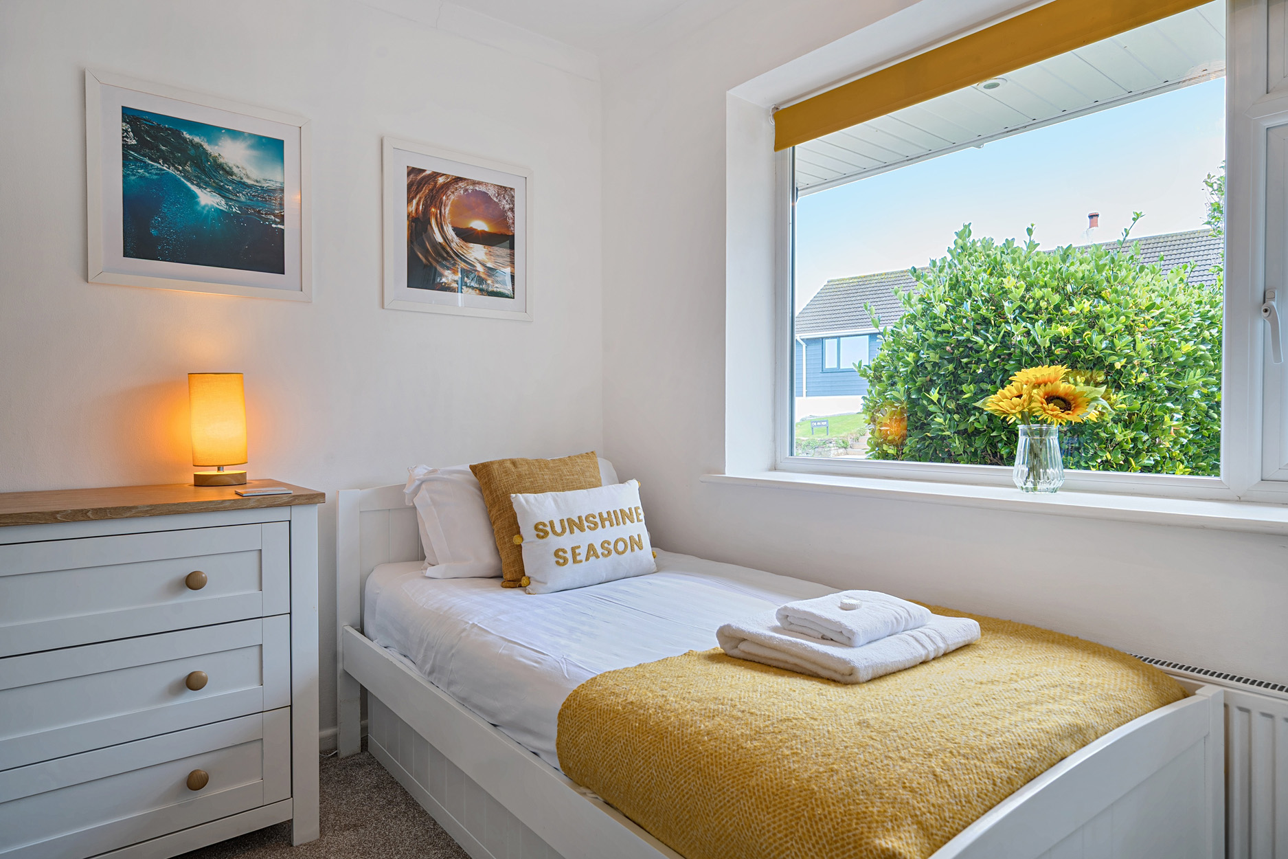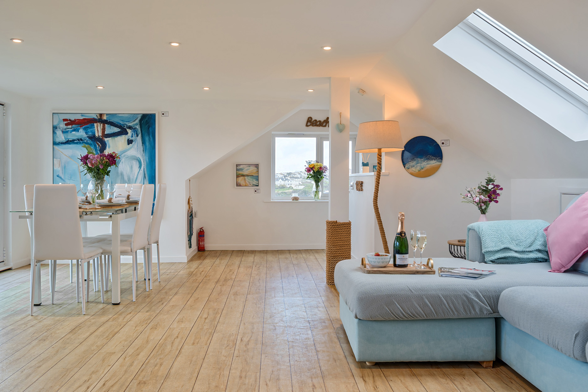 This charming contemporary holiday home rests in Porth, on the outskirts of Newquay, in Cornwall and can sleep five people in three bedrooms.