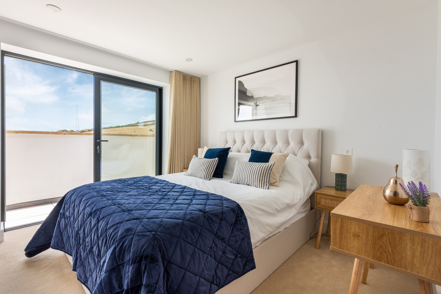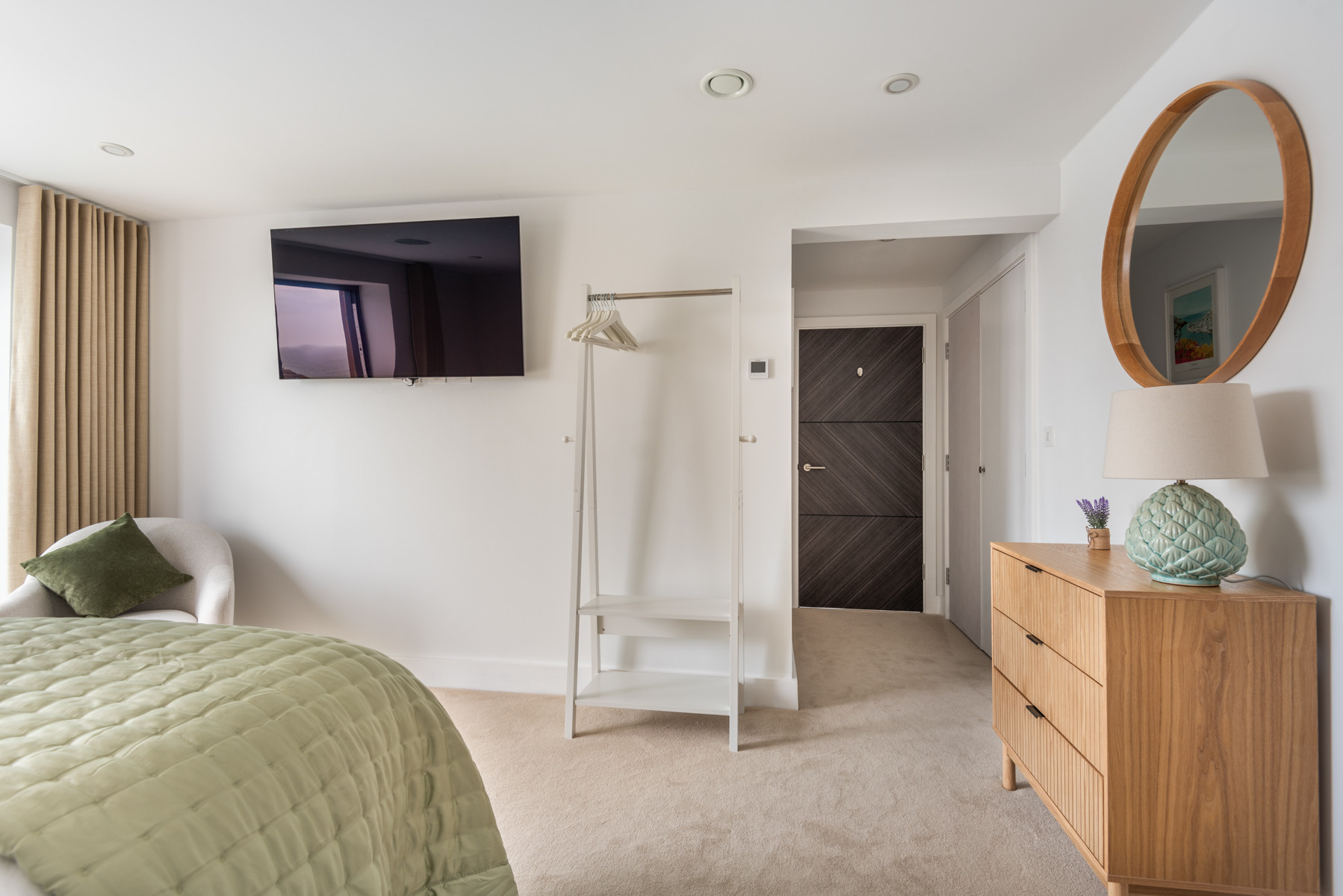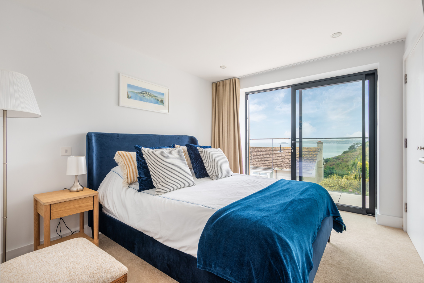 Bedroom 2 with 5' king size bed, smart TV, and sliding doors to balcony with sea view