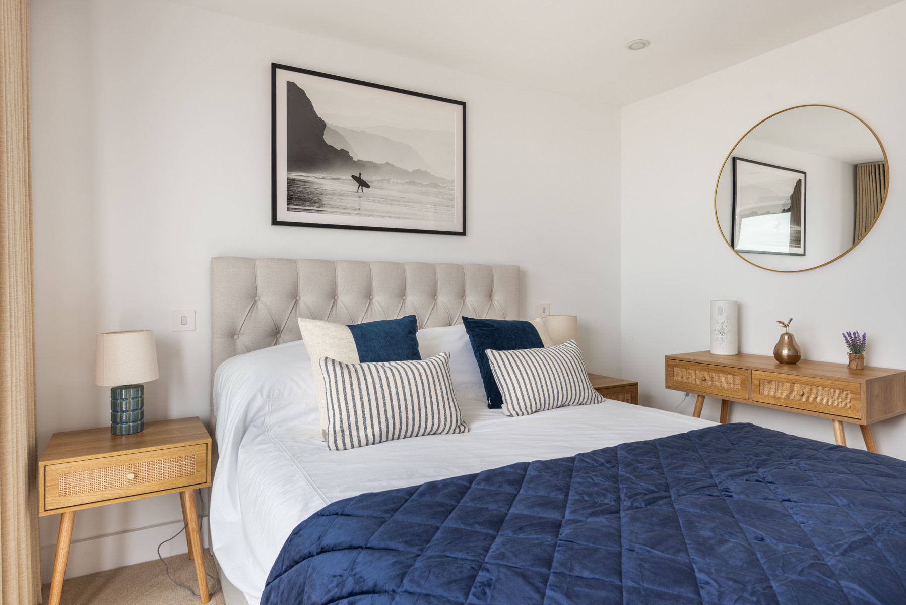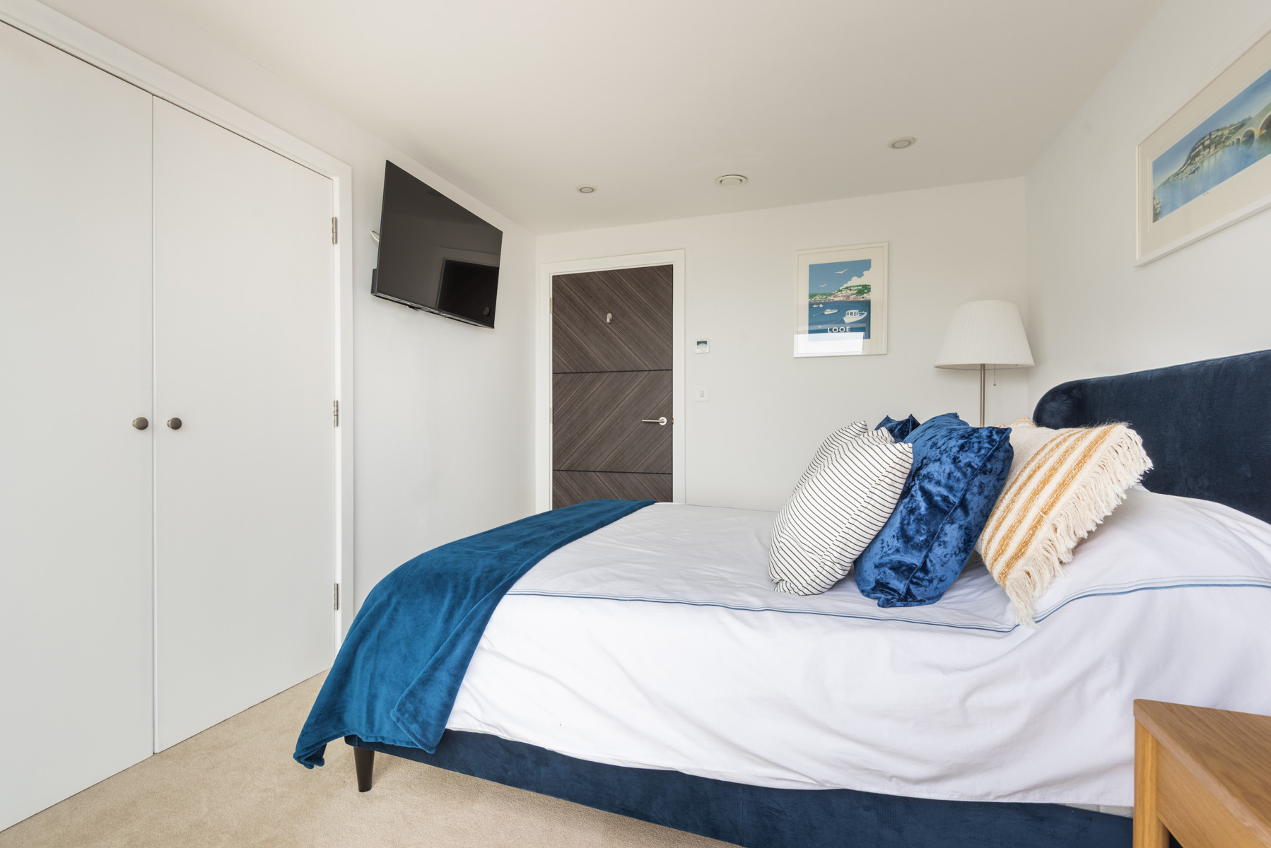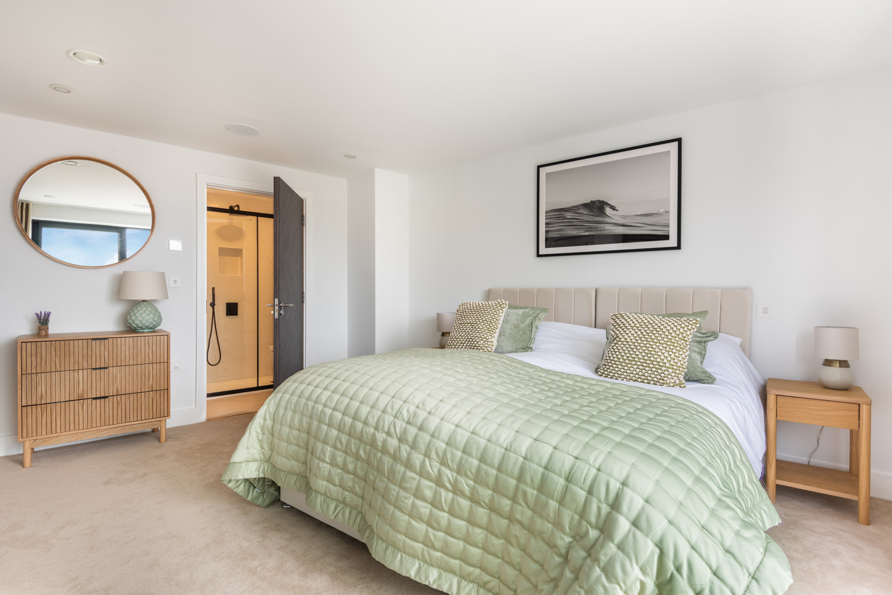 Bedroom 1 with 6' super king size bed, sea view, smart TV. Leading to en-suite with bath and shower over, WC and wash basin.
