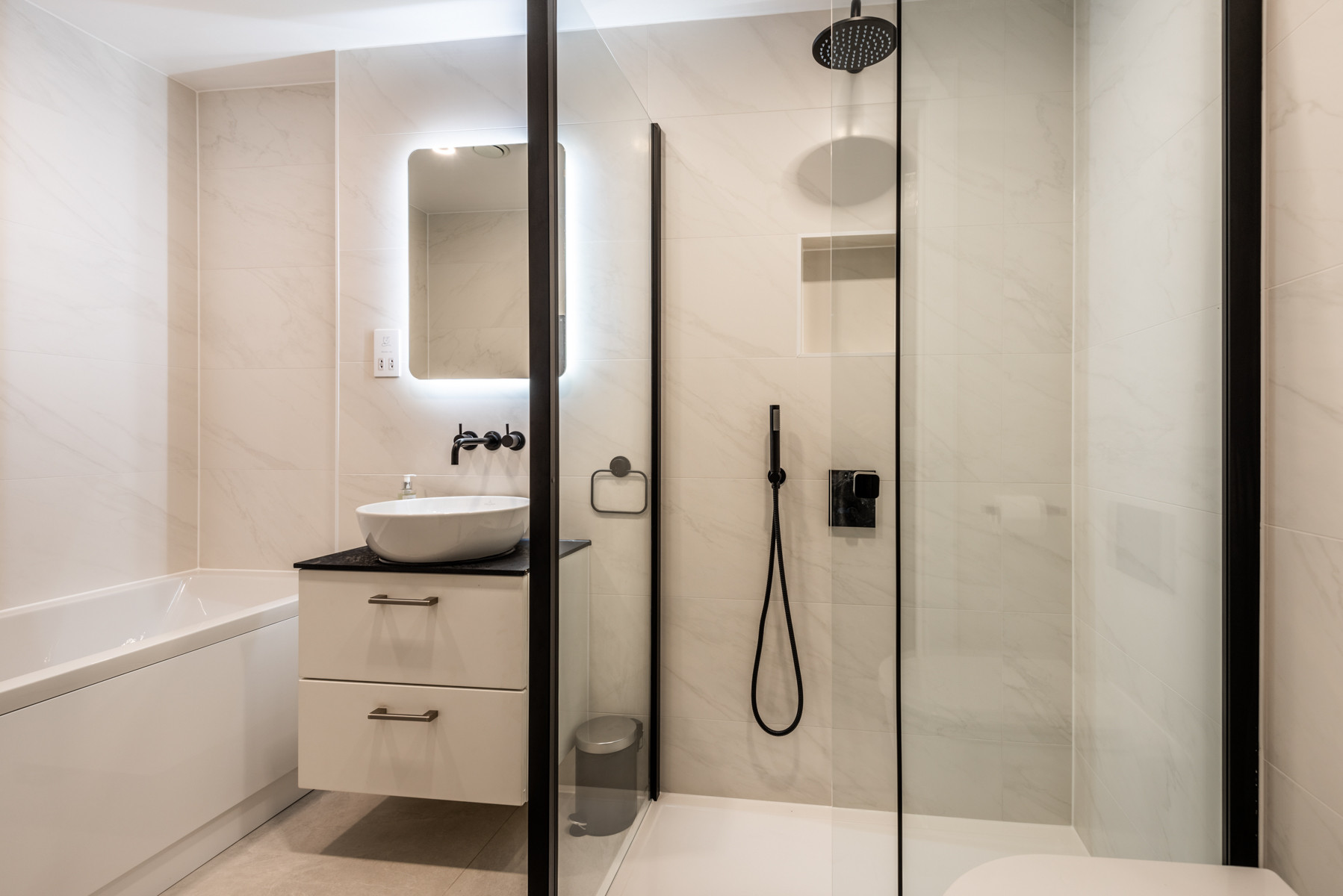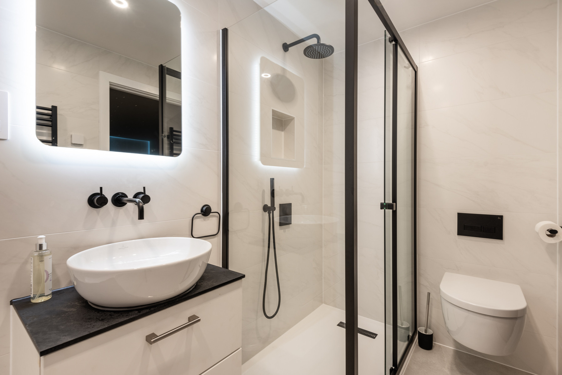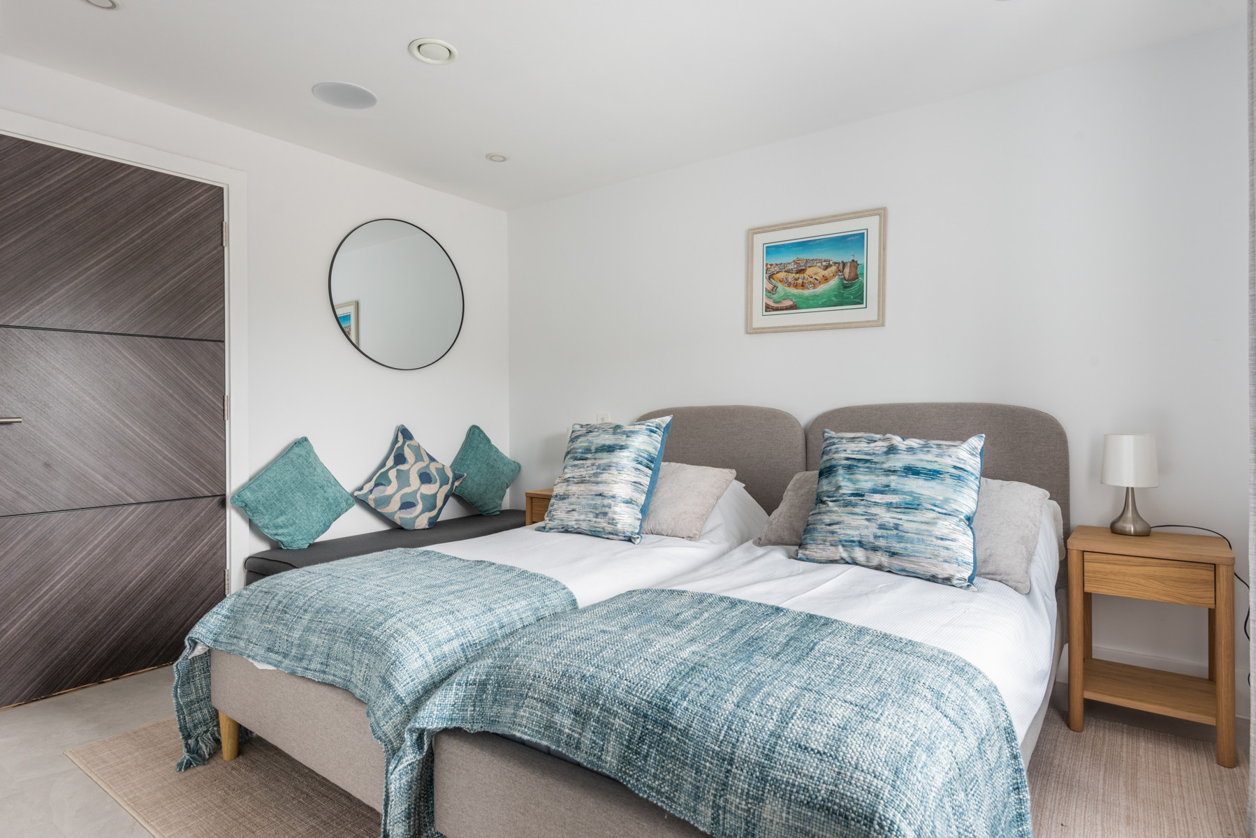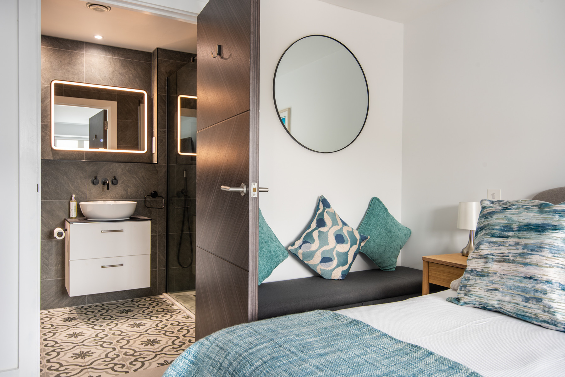 Bedroom 1 with 6' super king size bed, sea view, smart TV. Leading to en-suite with bath and shower over, WC and wash basin.