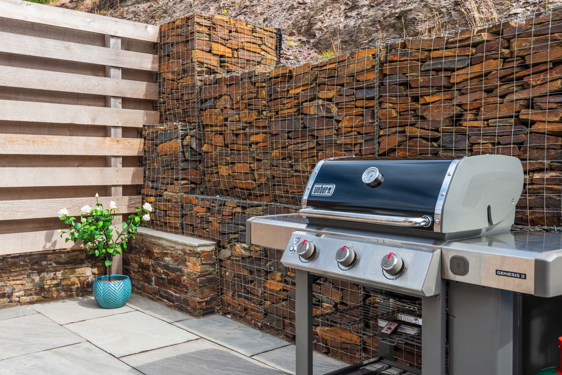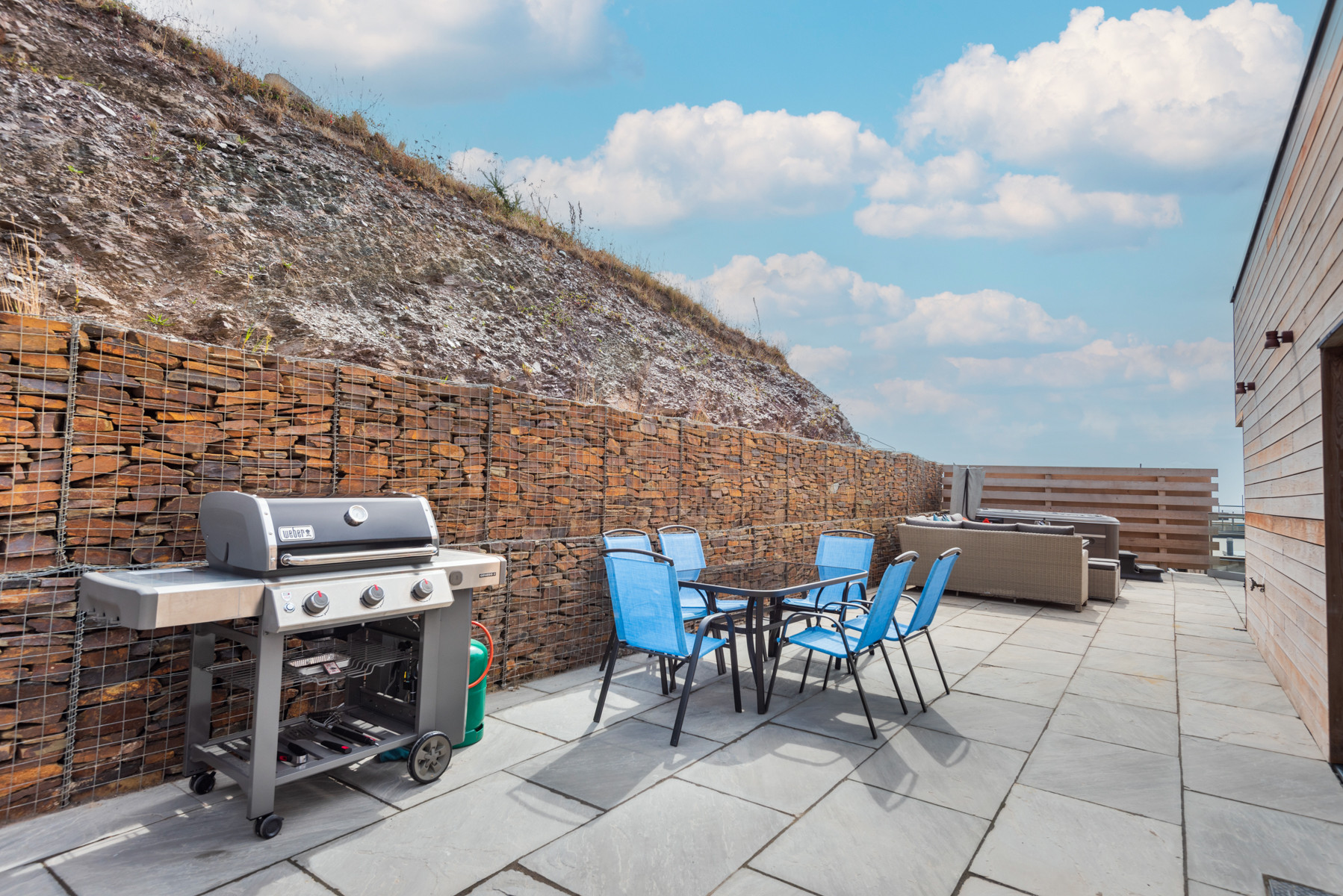 Terrace with outdoor furniture, gas barbecue, and hot tub with sea view.