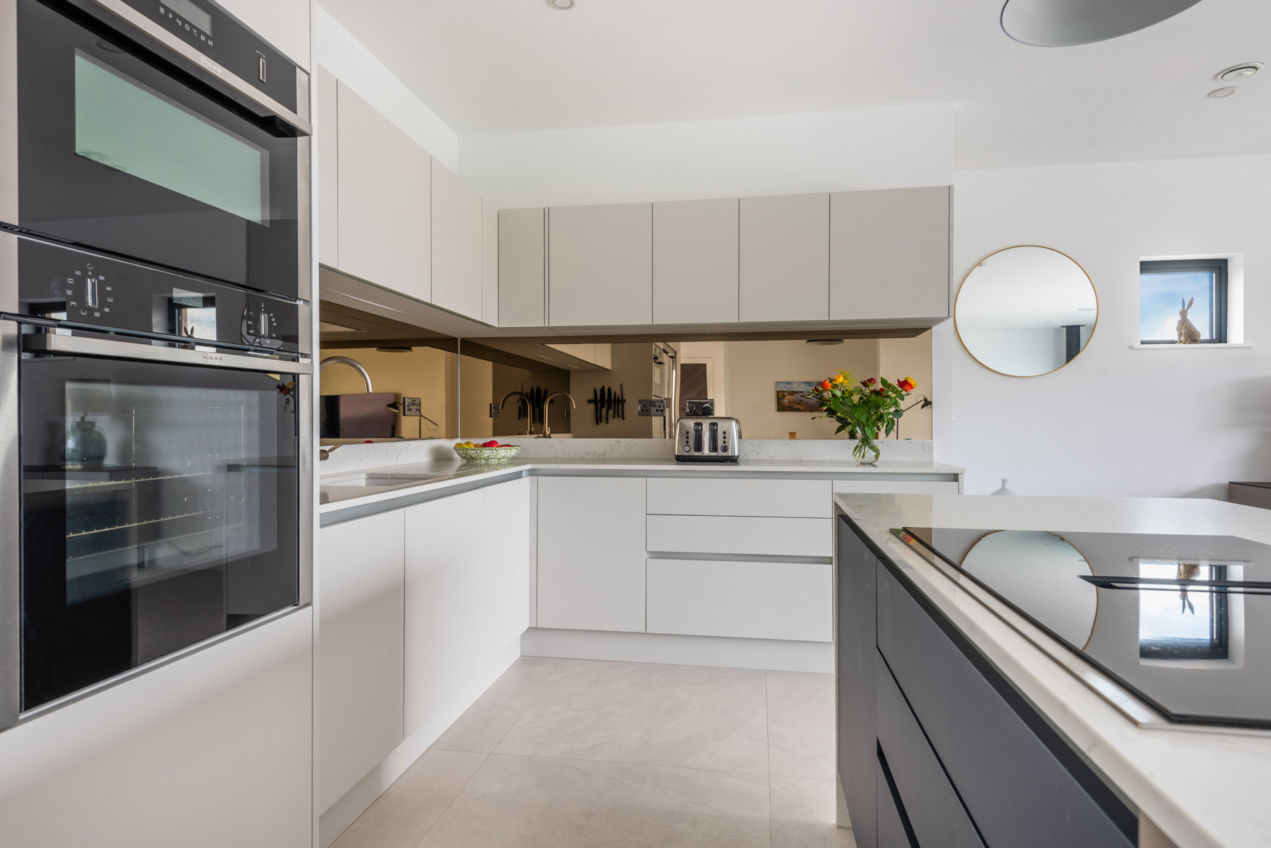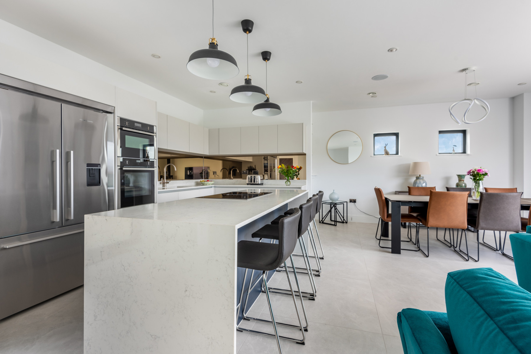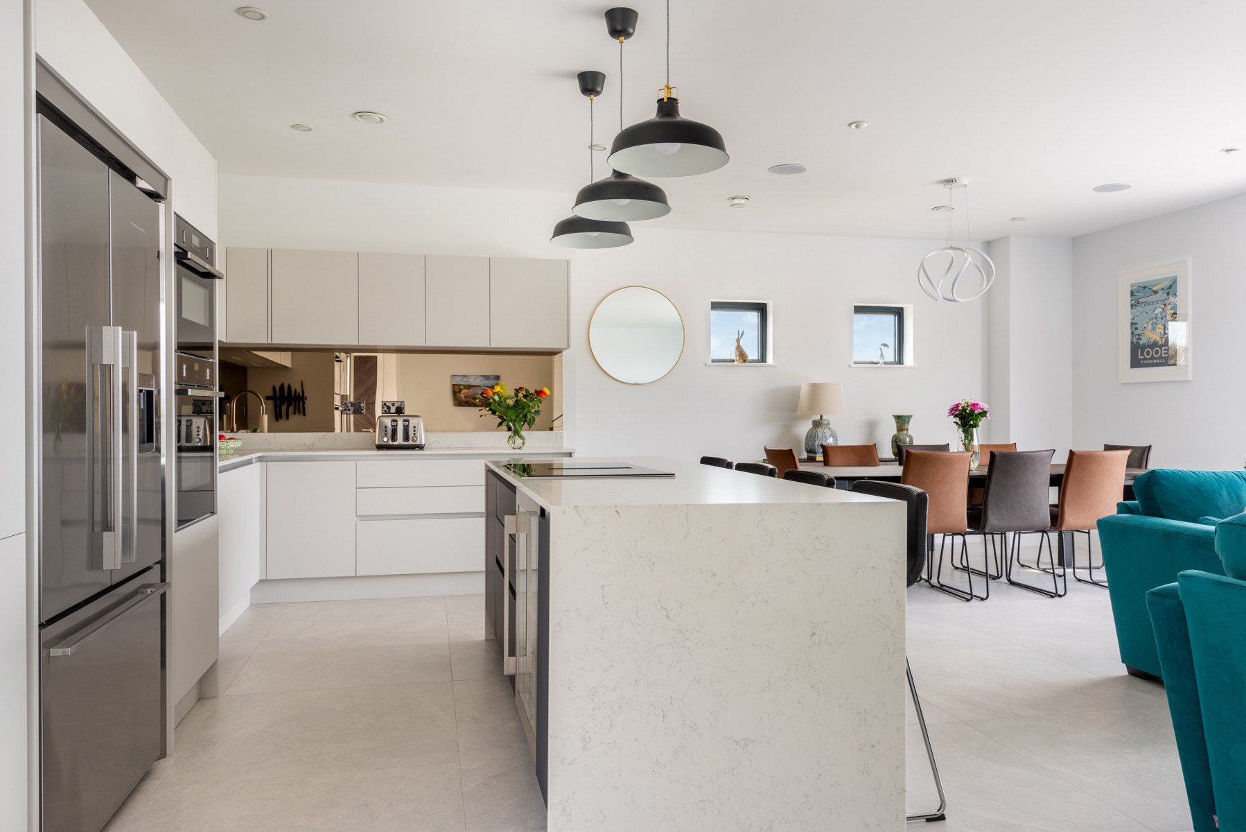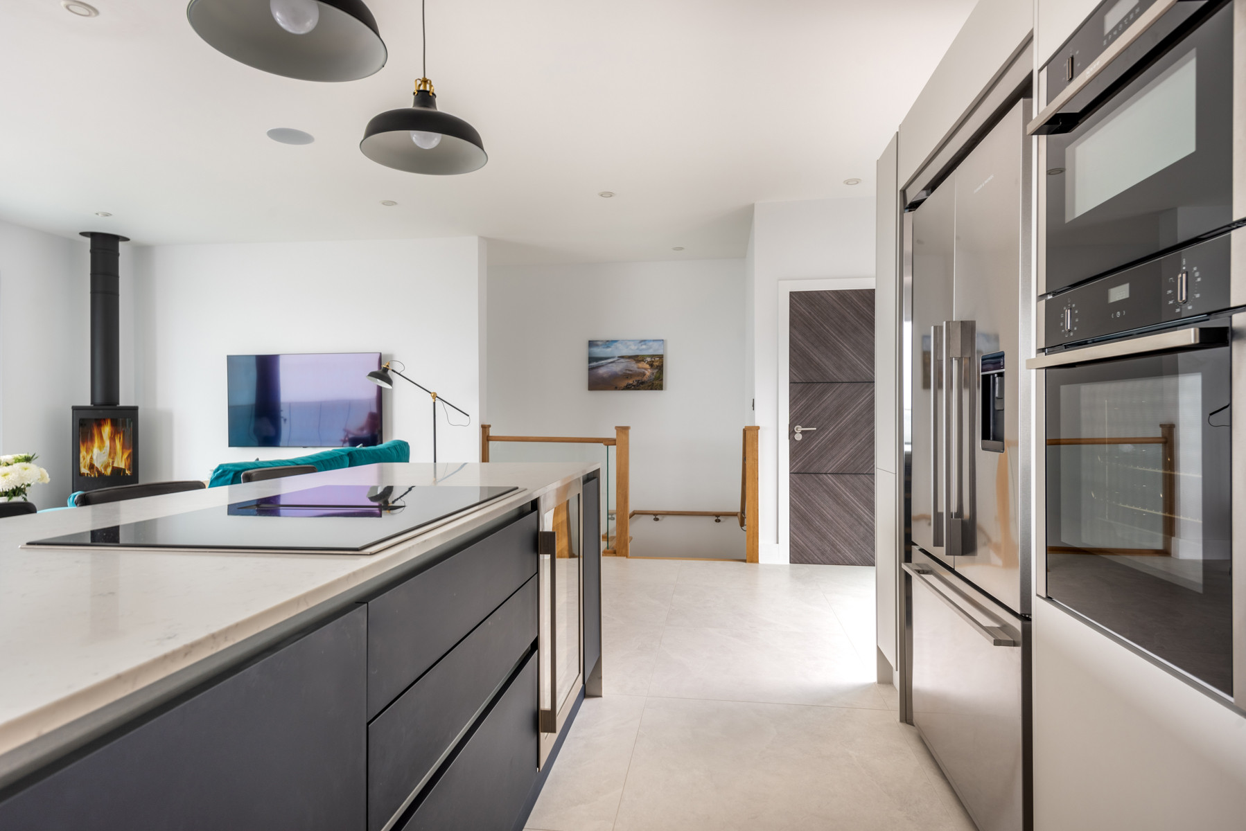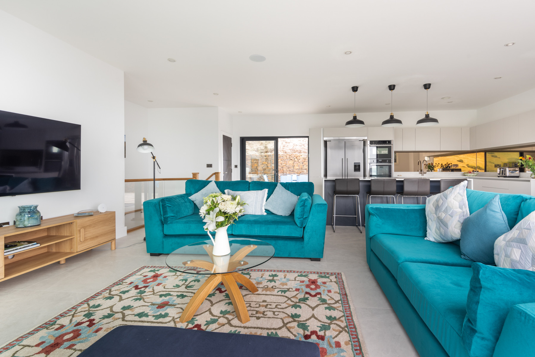 Large open plan living / dining / kitchen space with huge sliding doors to terrace. Two sofas, a wood burner and smart TV complete the lounge section, and dining table seating 8 guests sits behind. The kitchen has NEFF appliances, American style fridge / freezer, wine fridge and breakfast bar.