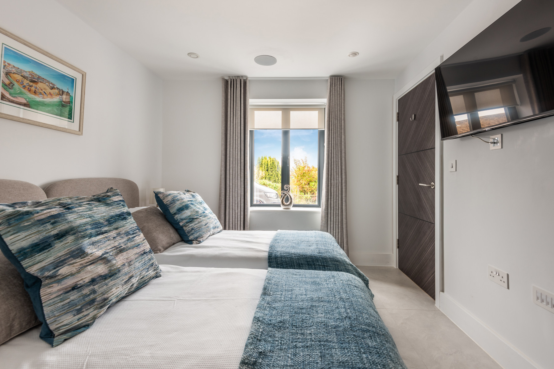 Bedroom 4 with two 3' single beds, and en-suite shower room with WC and wash basin.