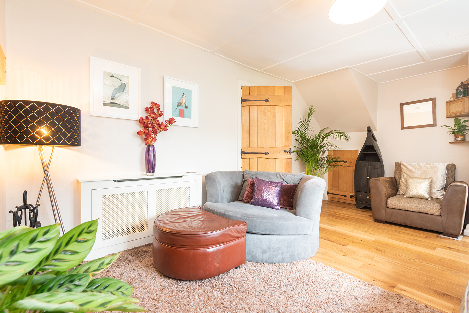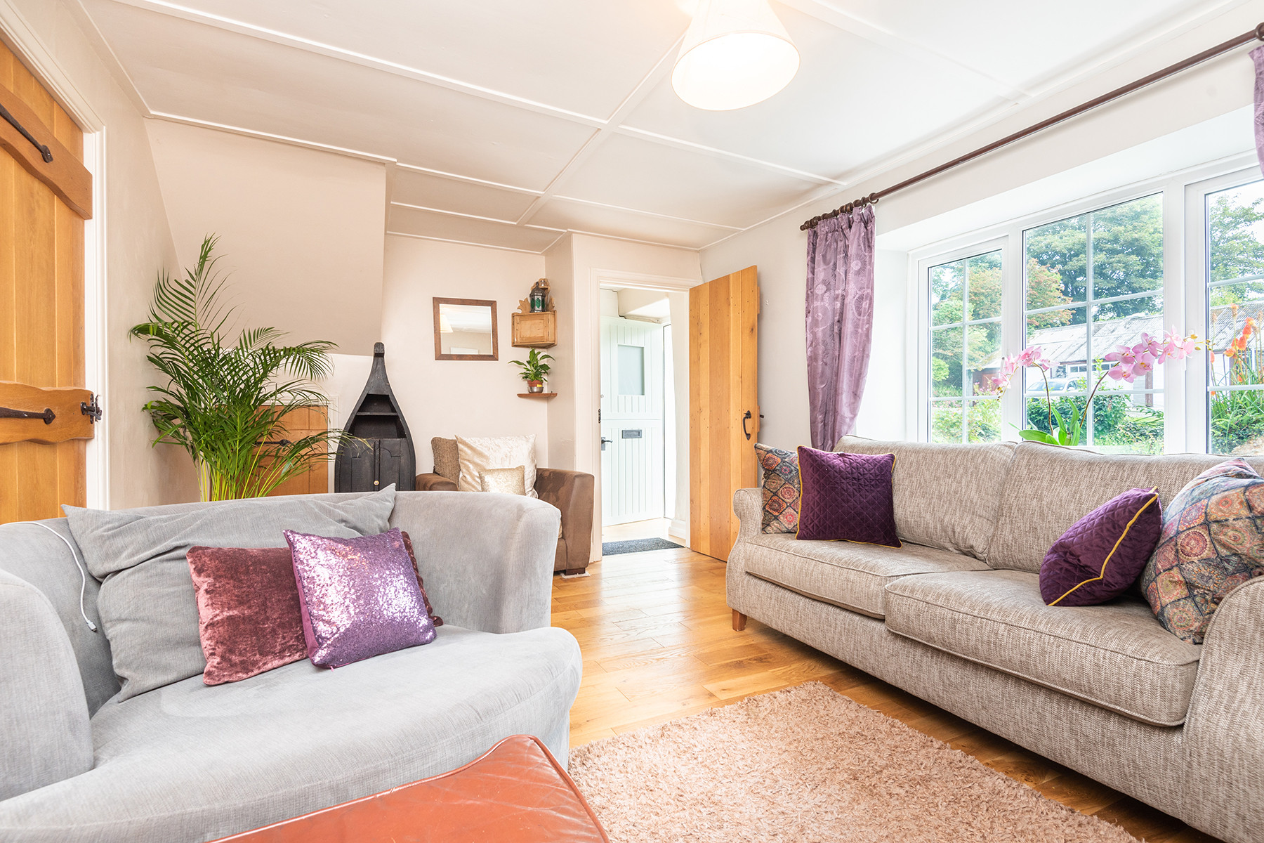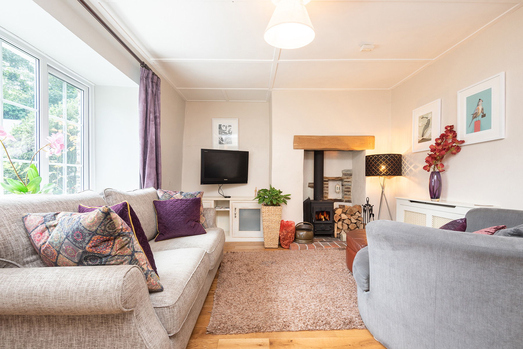 Lounge: wood flooring, 3 seater sofa, snuggle chair for 2, arm chair, Freeview TV, DVD player and a few DVD's.