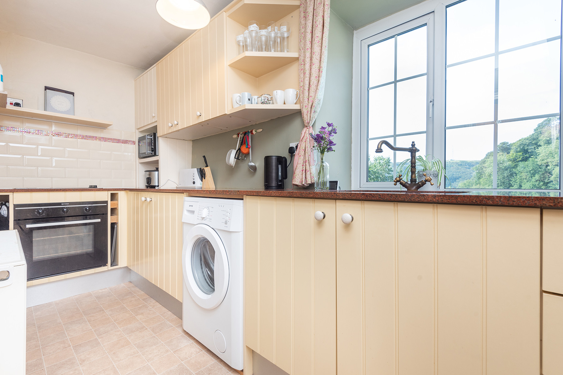 Kitchen/dining room: Galley kitchen with electric hob and electric oven under, microwave, washing machine, fridge with small freezer compartment, cafetiere, toaster, cordless iron and ironing board.