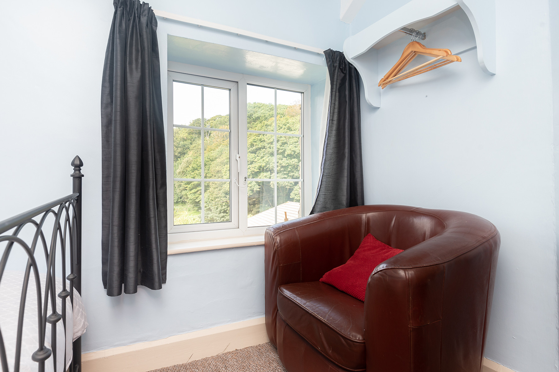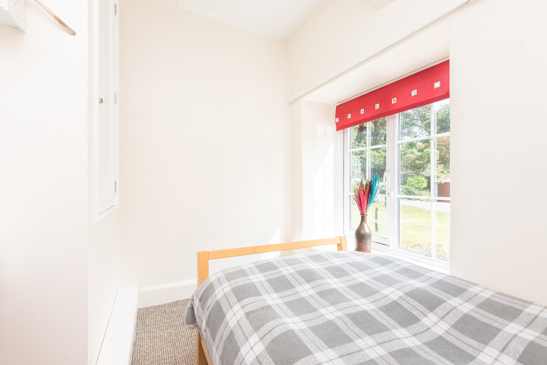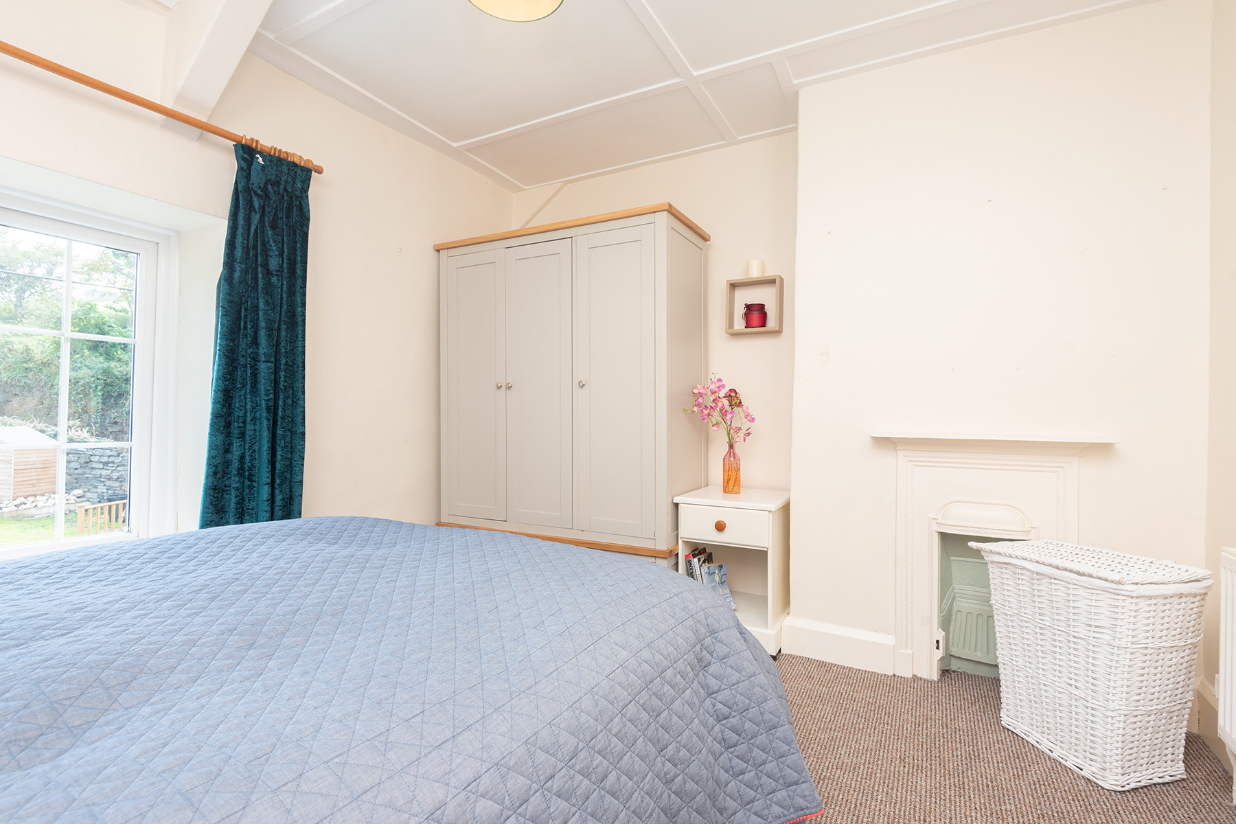 2nd bedroom: Double bed 4ft 6in, bedside table and lamp, small chest of drawers, arm chair.