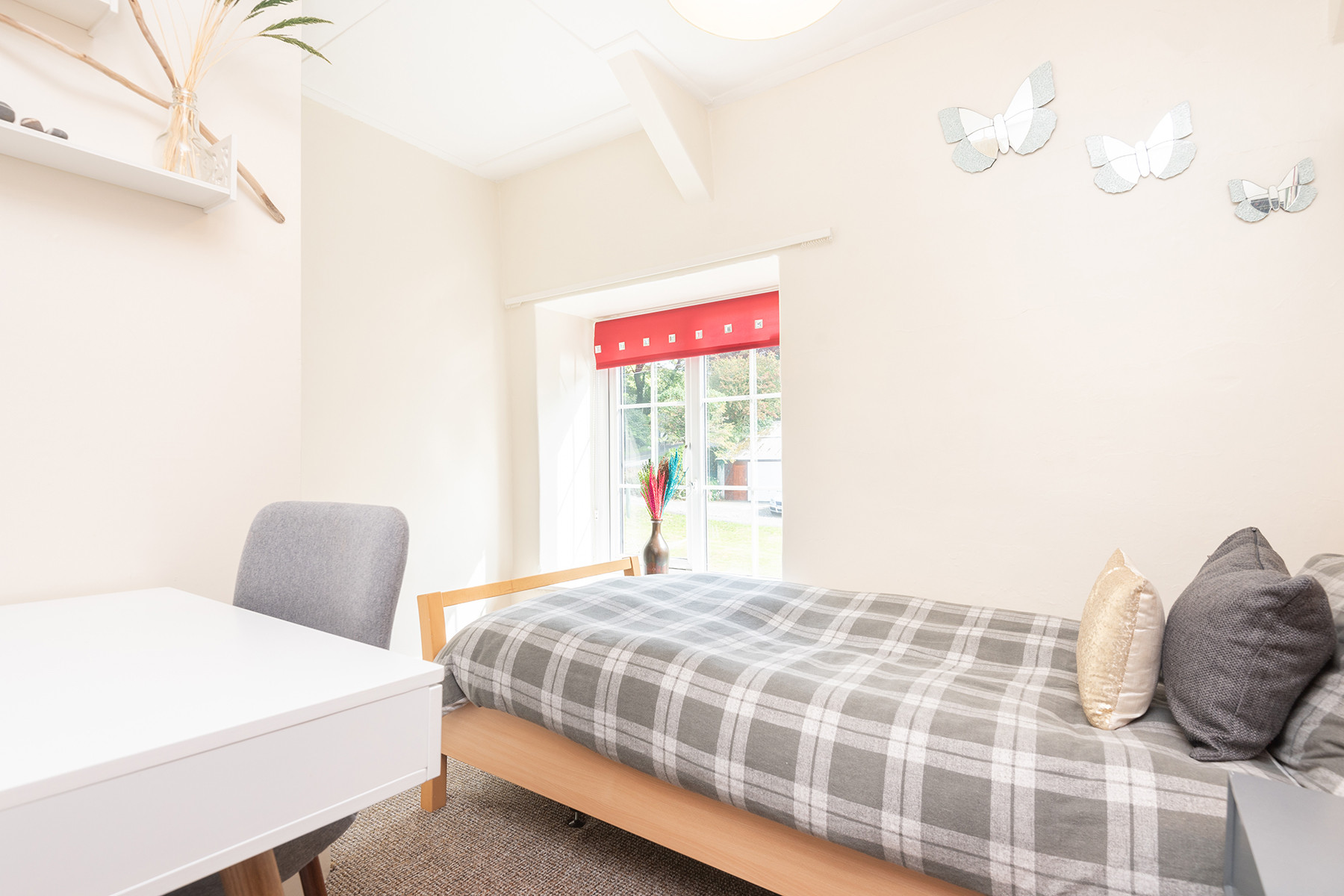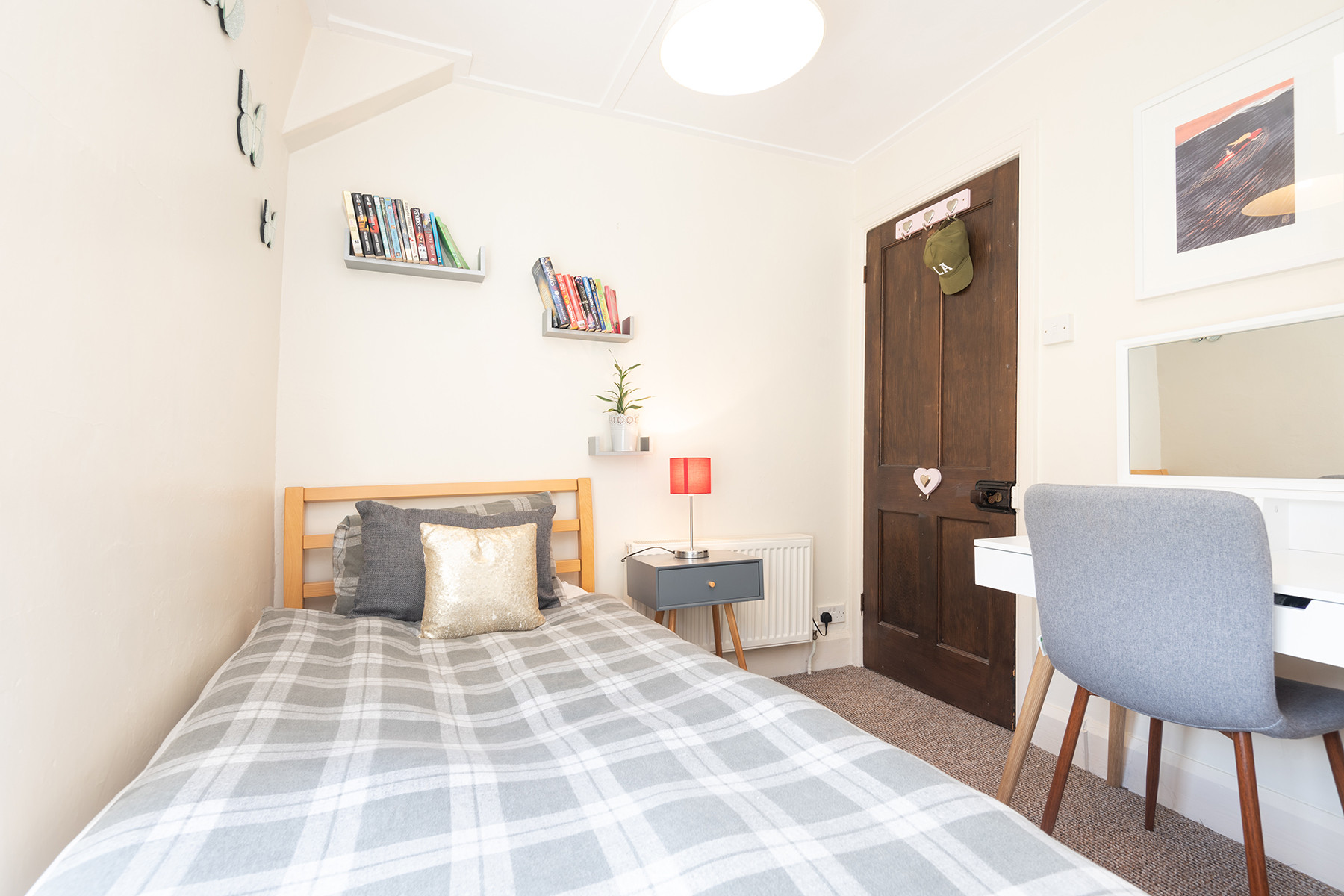 Single bedroom: Single 3ft bed, short wardrobe and shelf, dressing table with mirror.