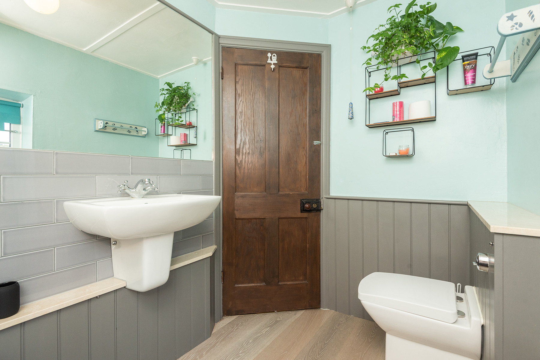 Family bathroom: 'L' shape bath with large shower head over, WC and wash hand basin.