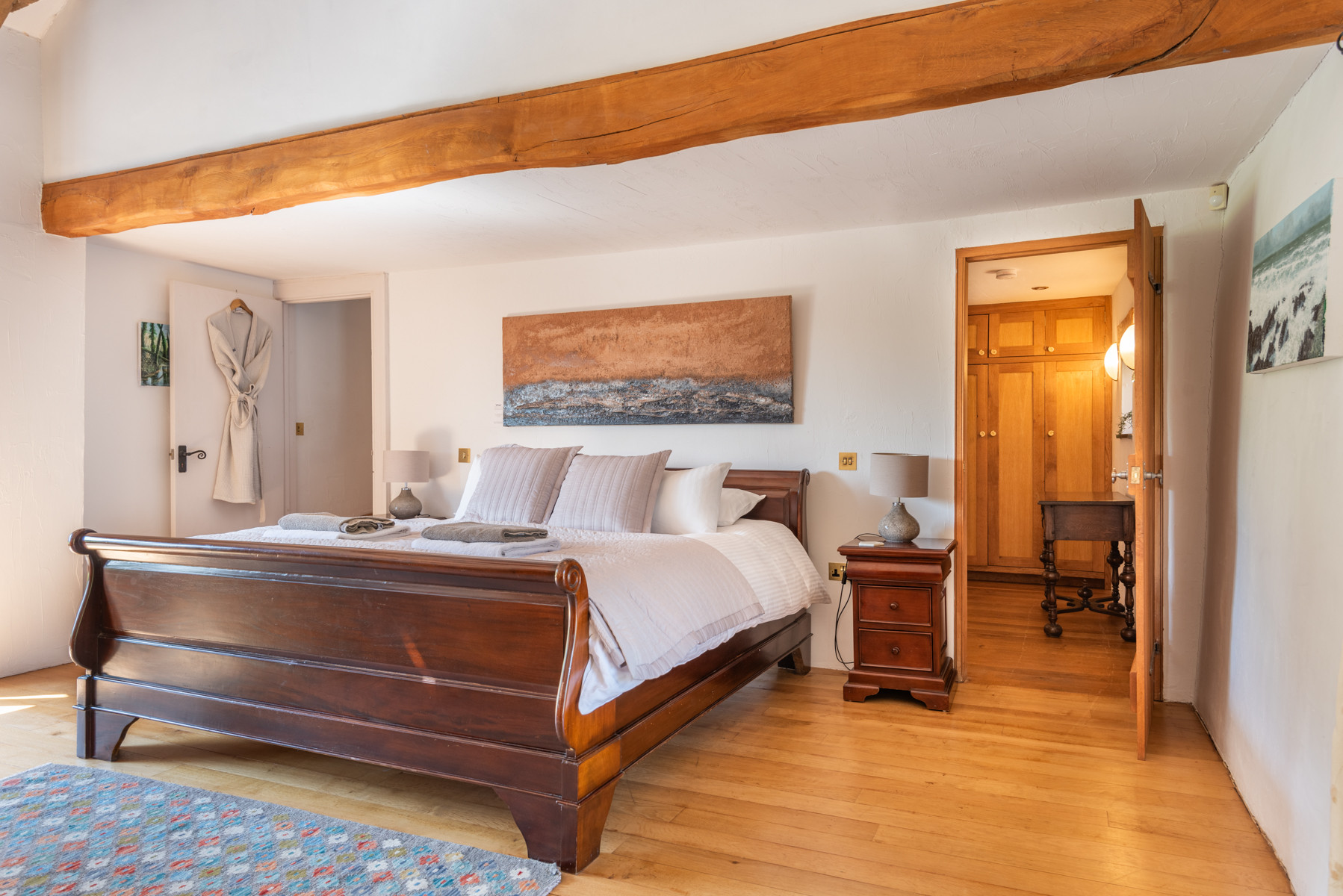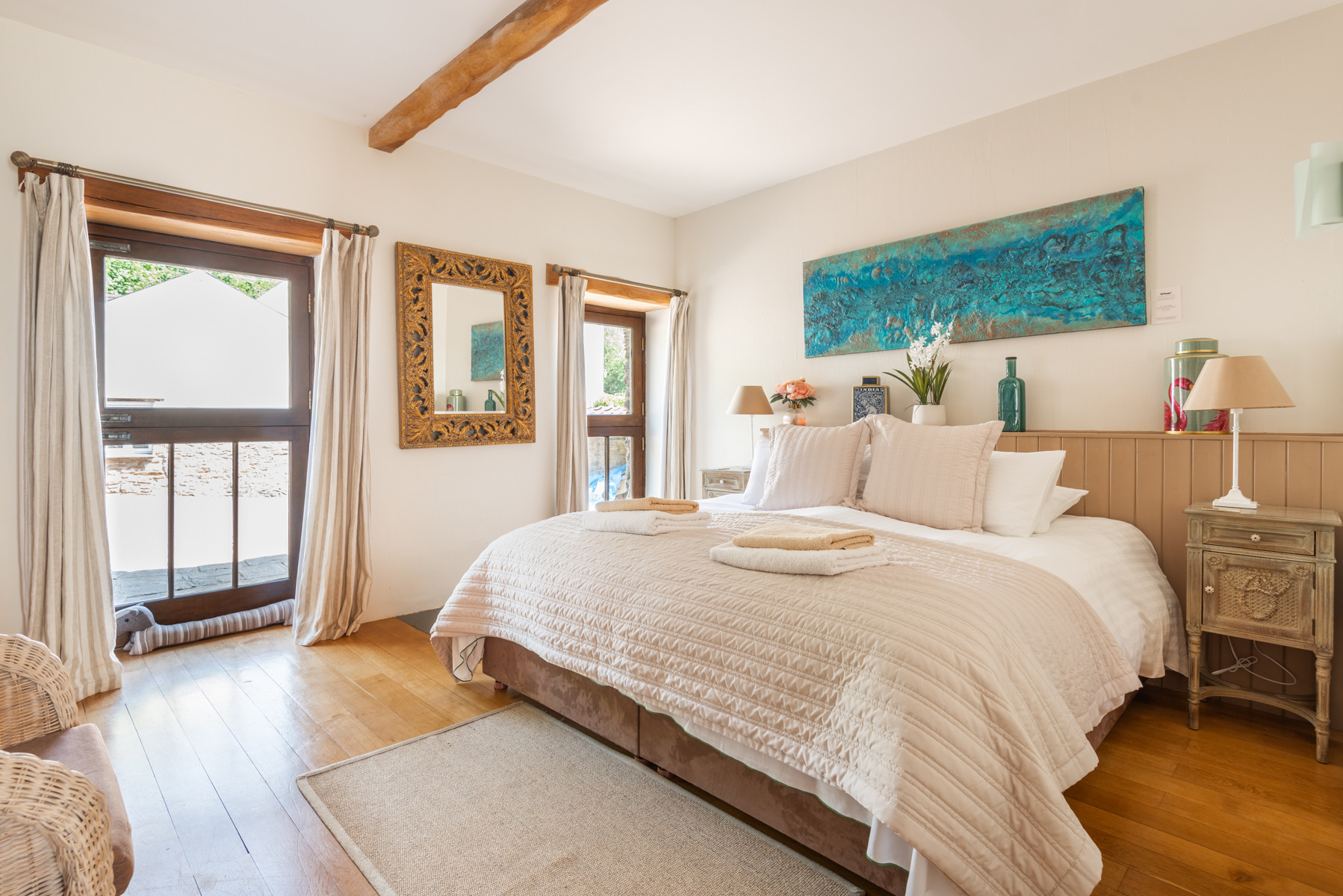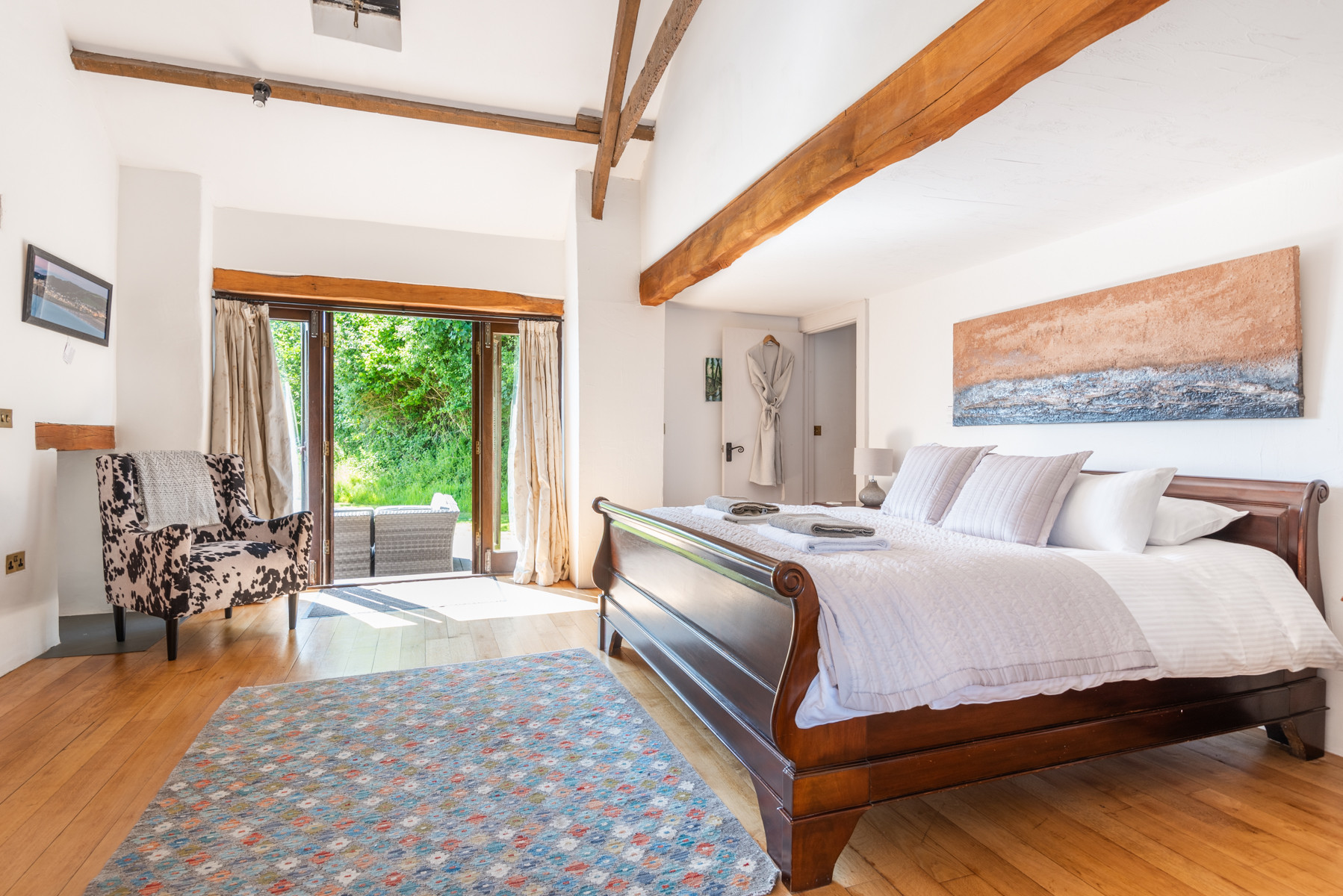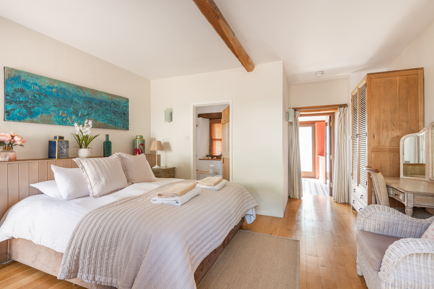 Master suite with super king-size bed, dressing room, and Juliet balcony with direct access to deck