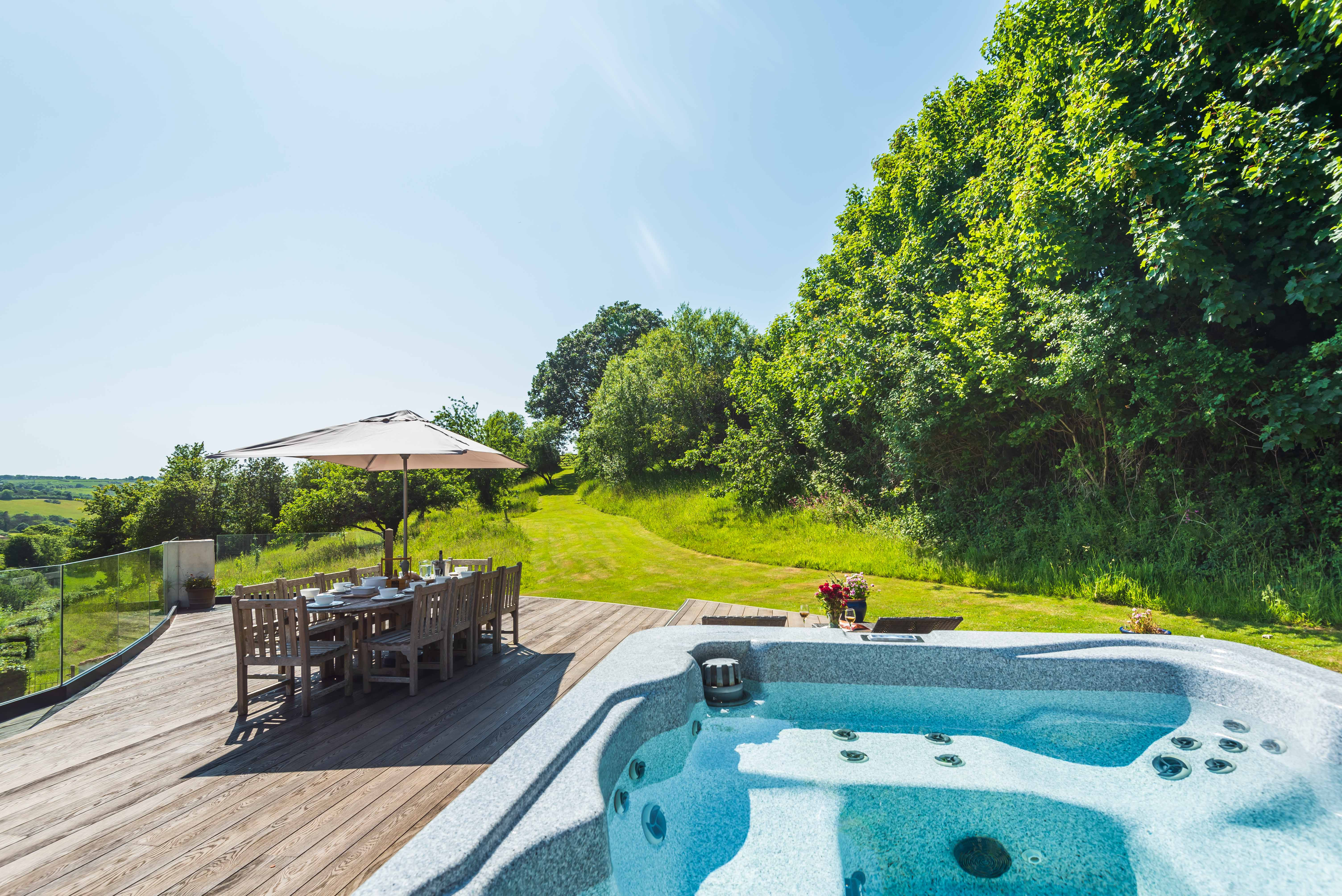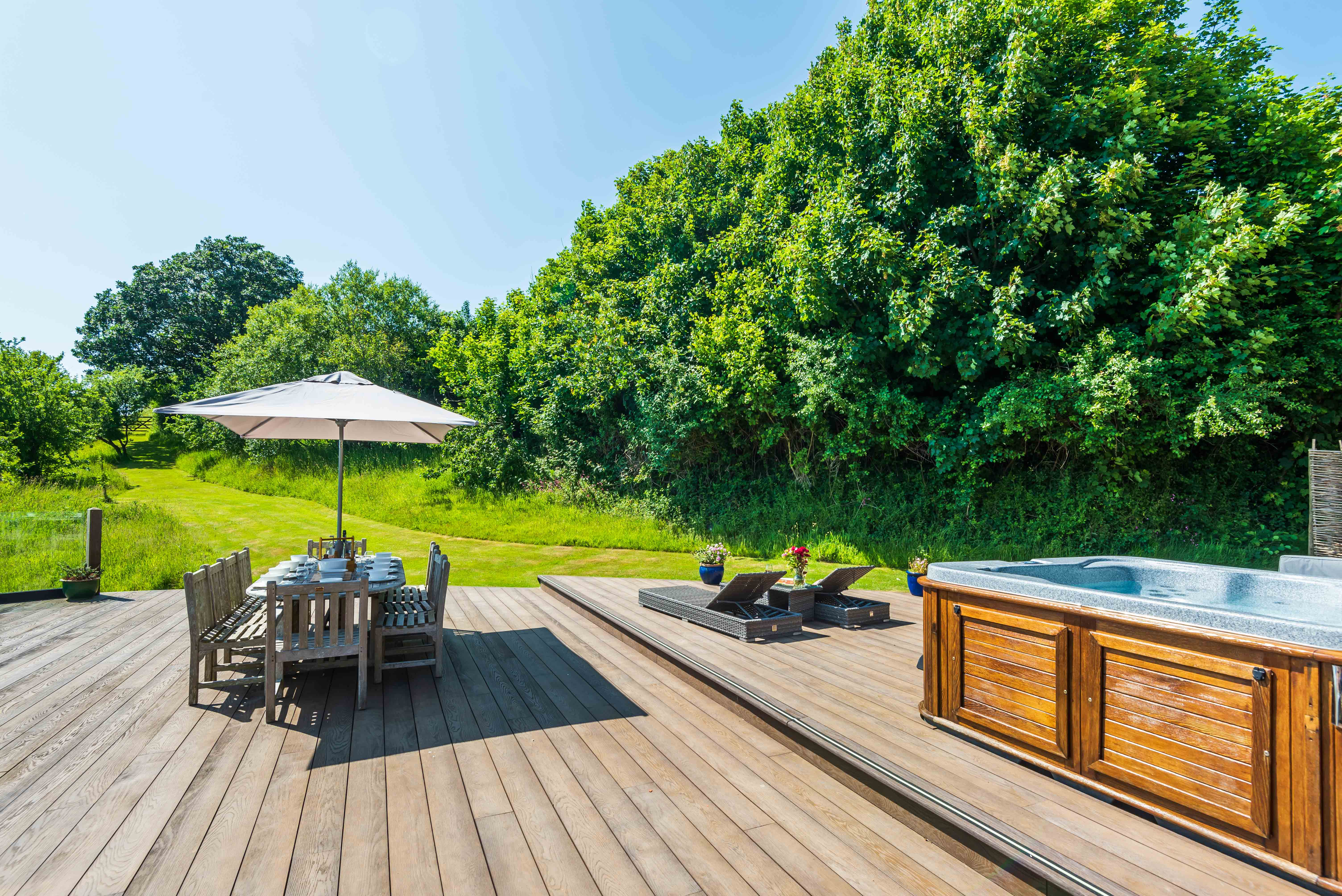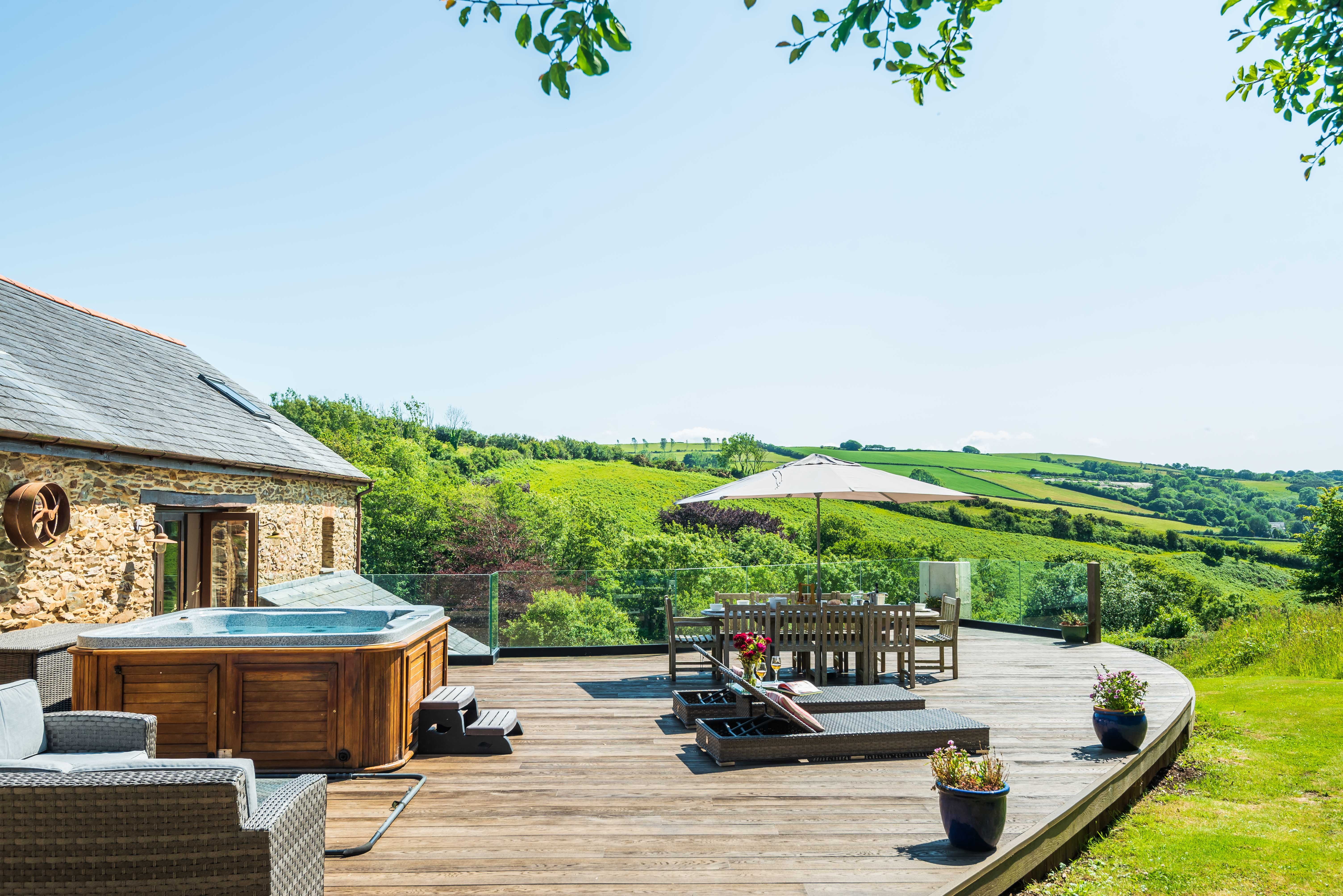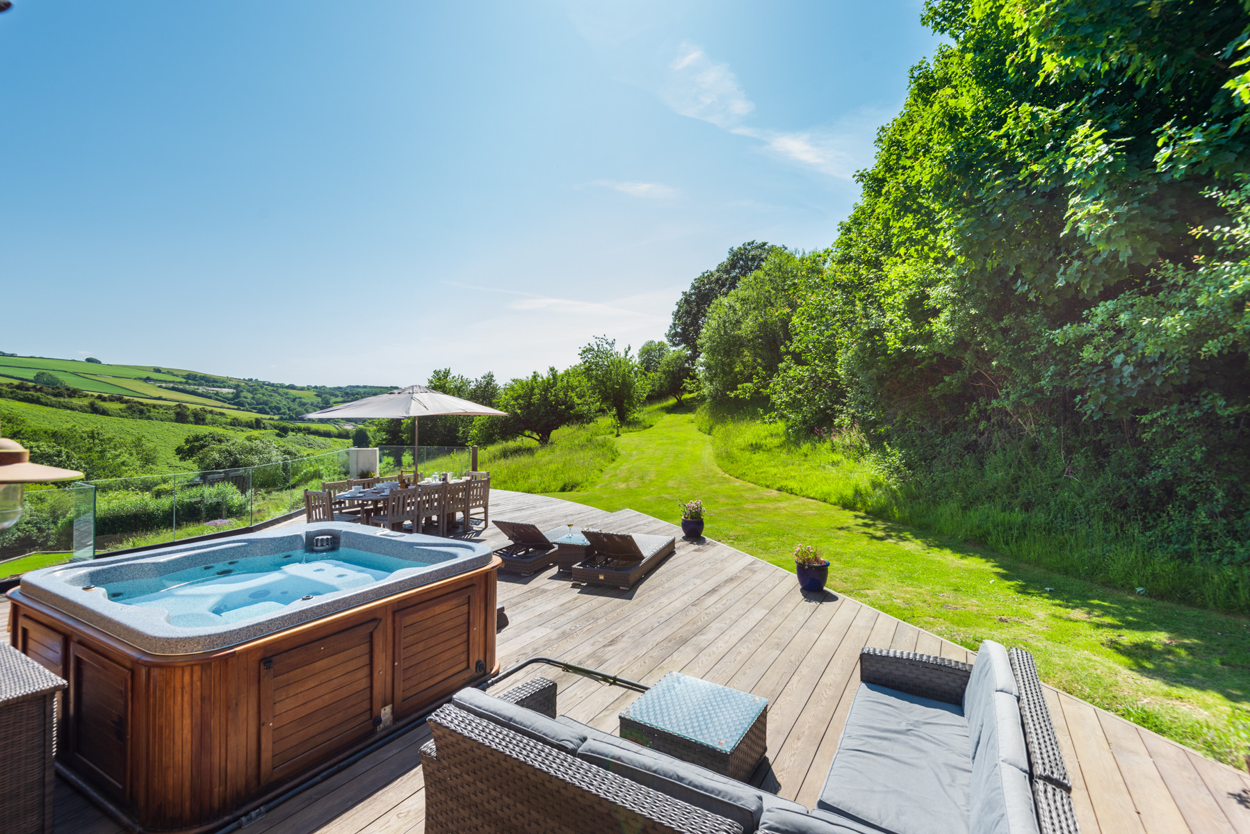 Large decked terrace with luxury hot tub and breathtaking viewing point looking down the valley.
