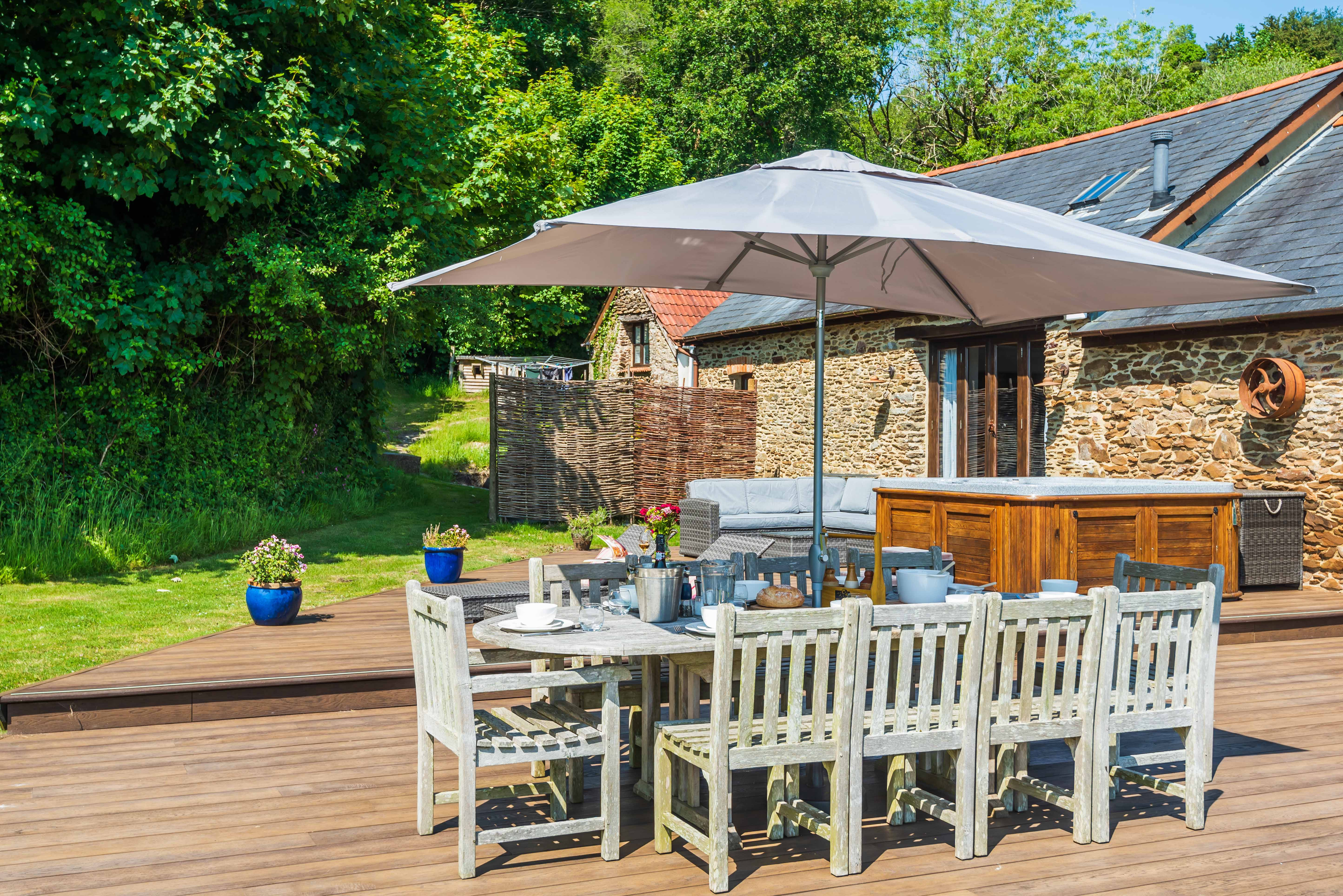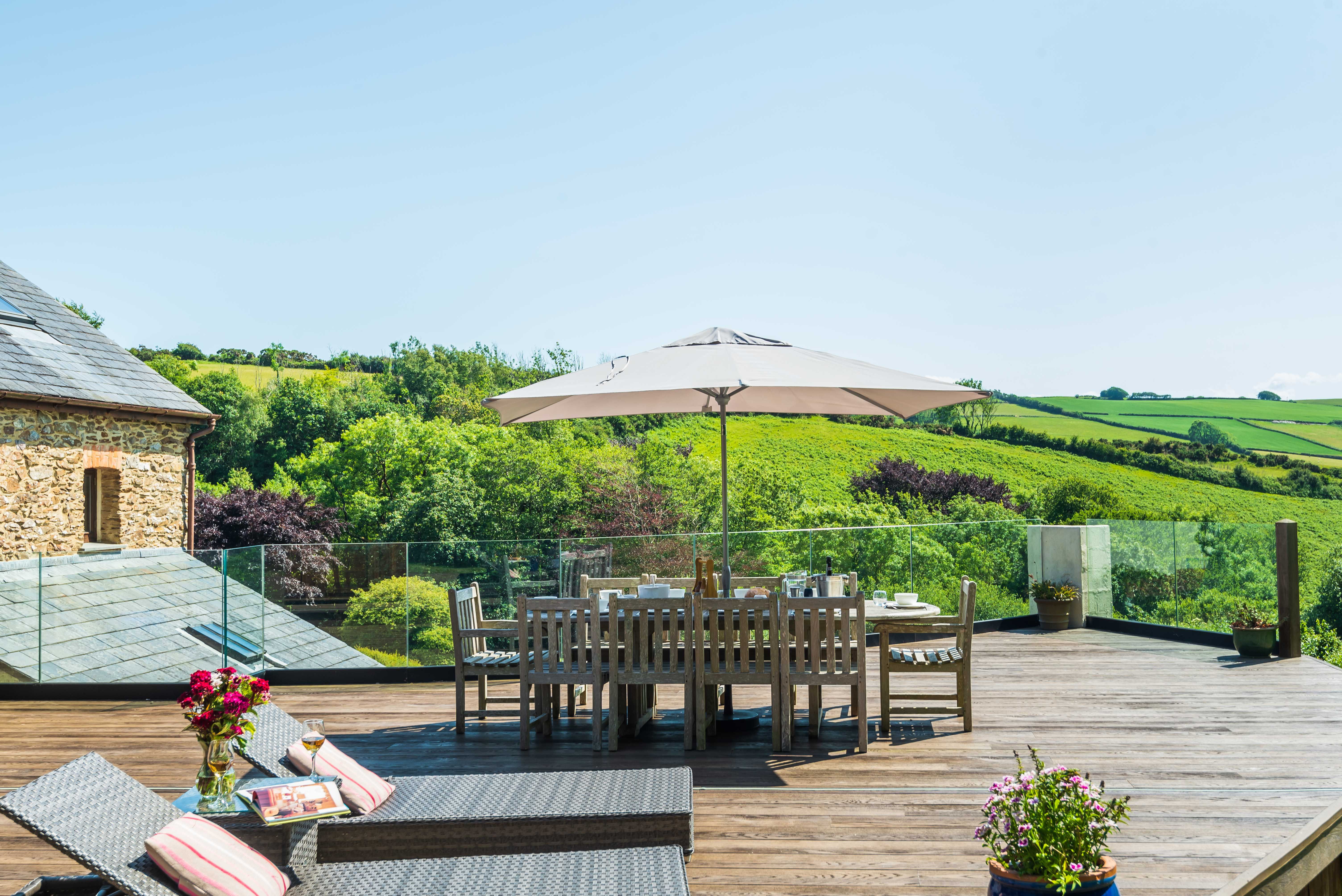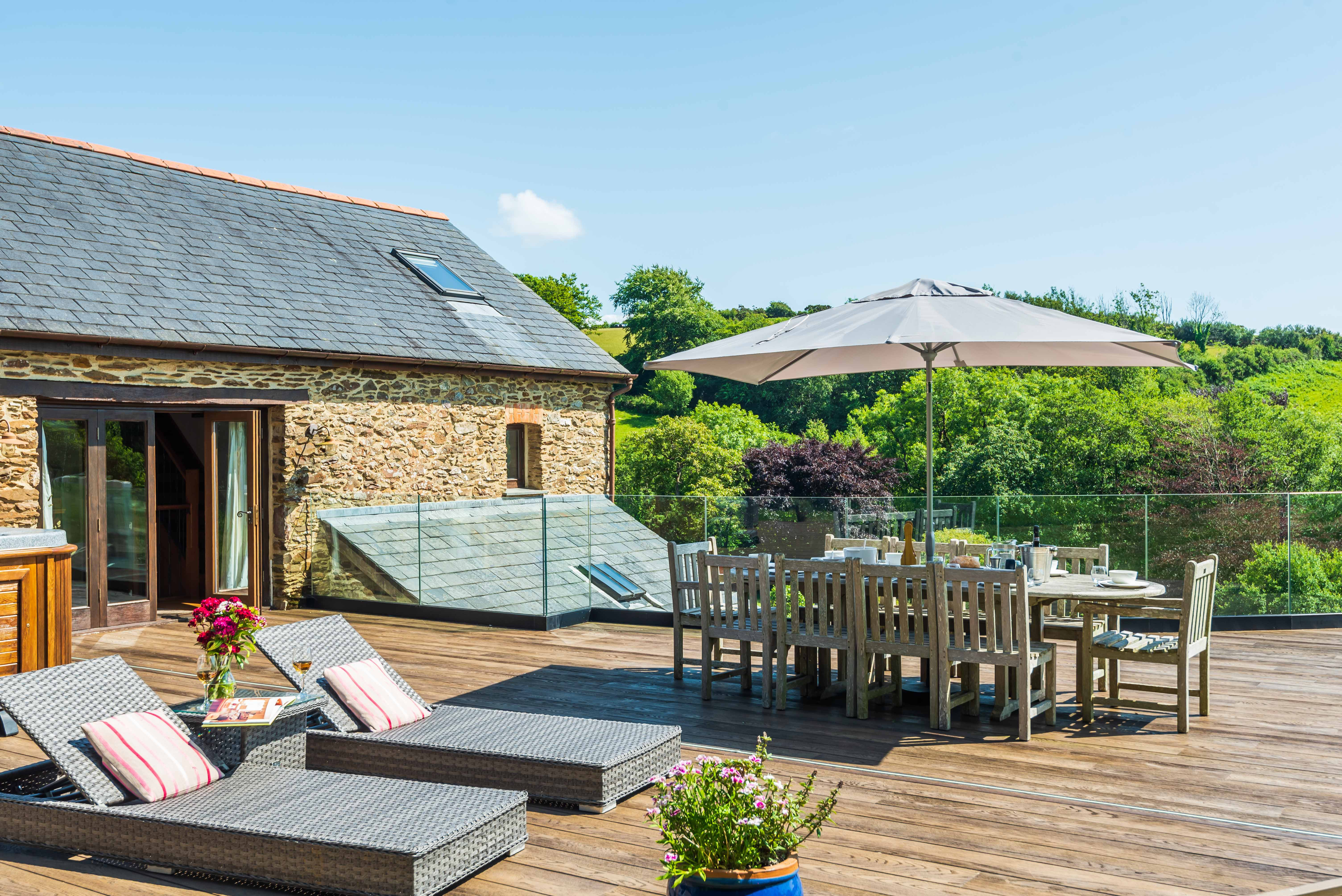 Large decked terrace with luxury hot tub and breathtaking viewing point looking down the valley.