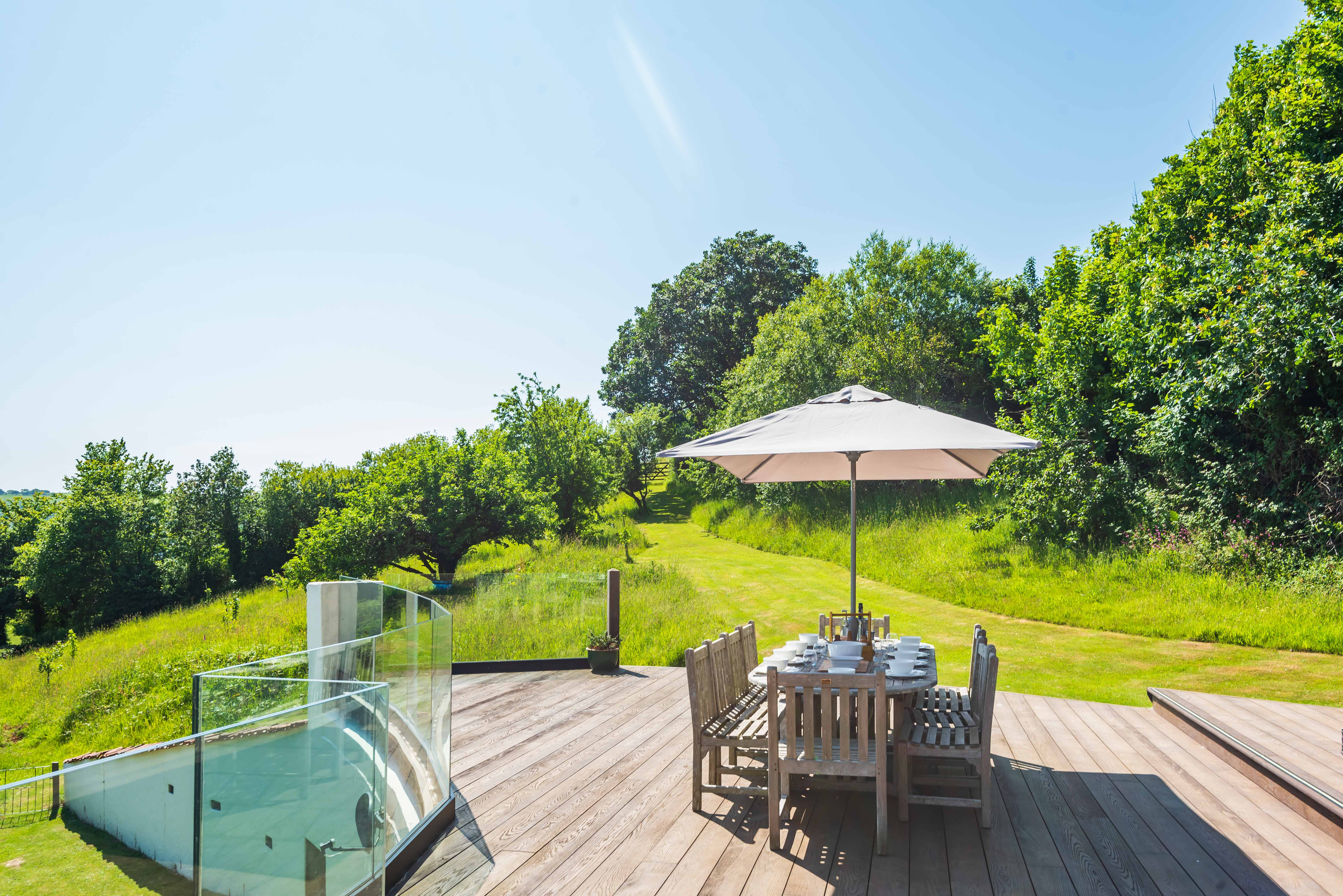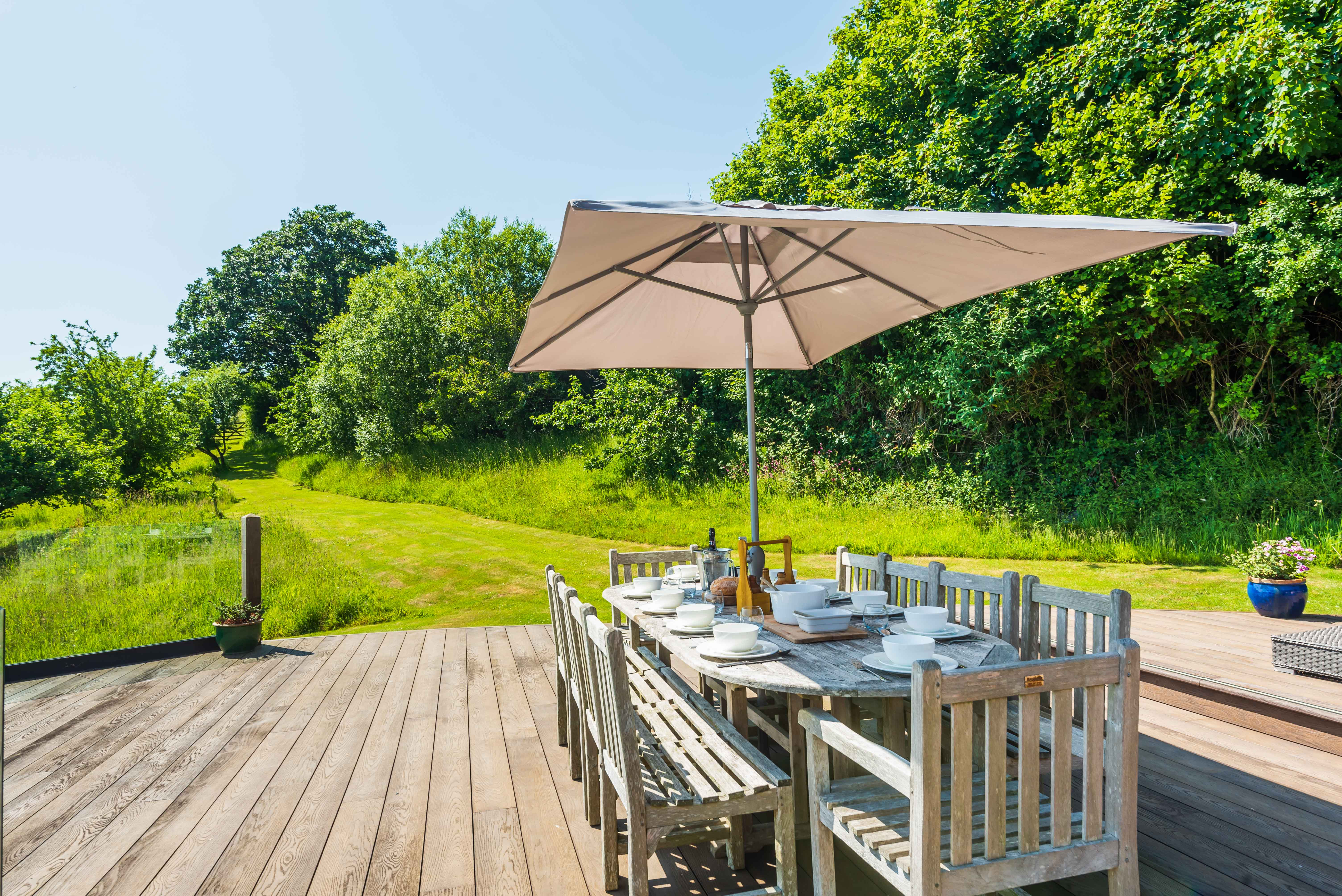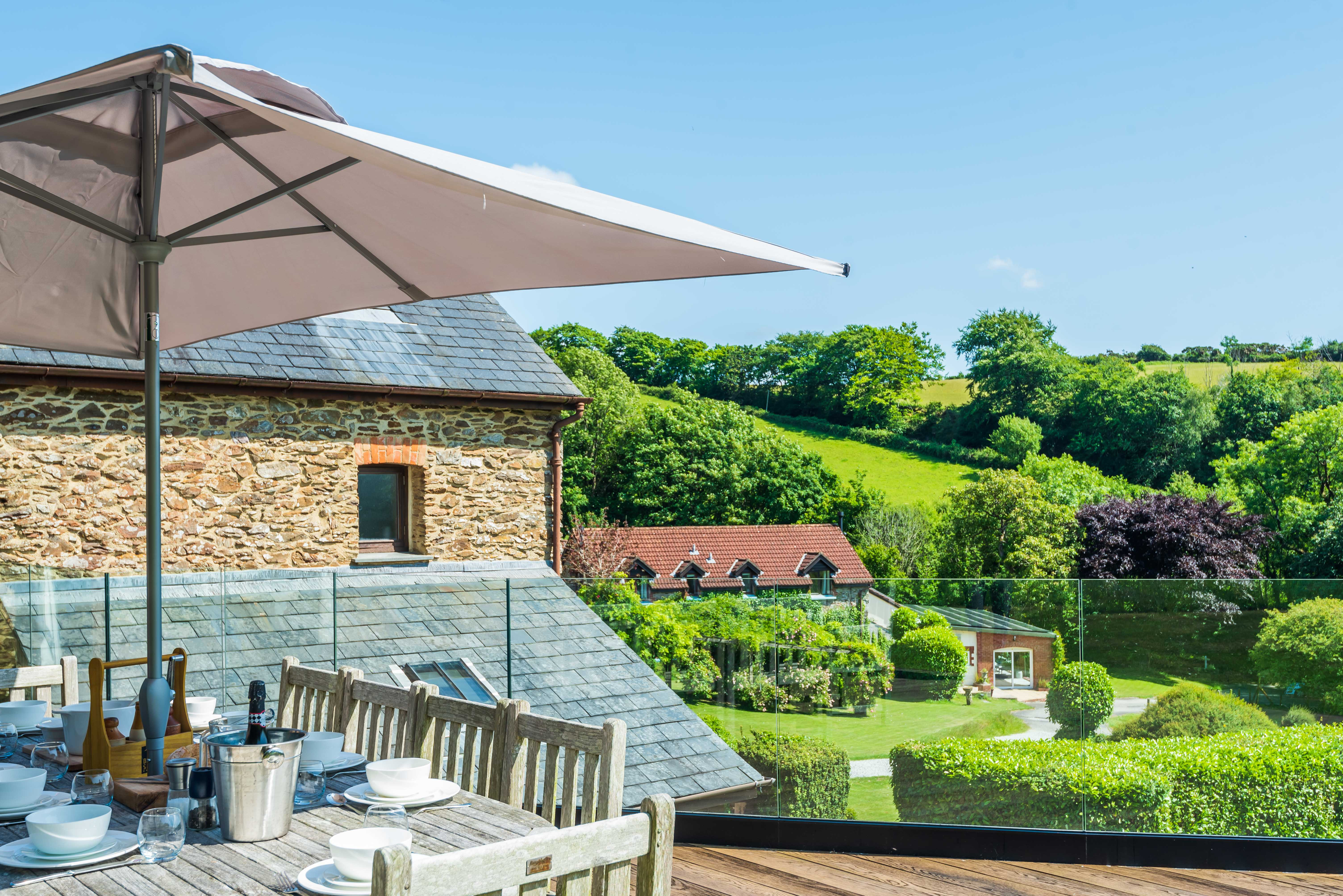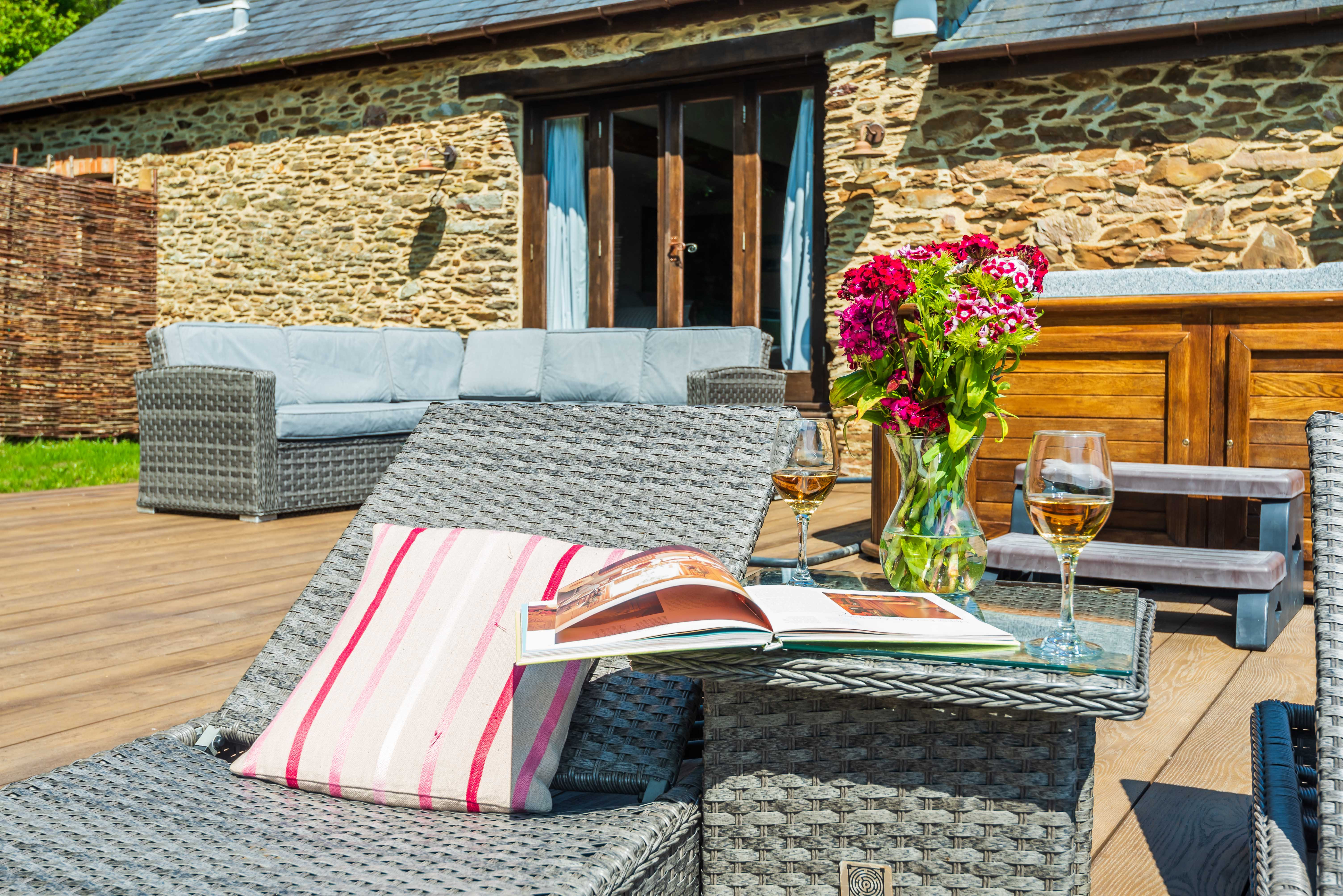 Large decked terrace with luxury hot tub and breathtaking viewing point looking down the valley.