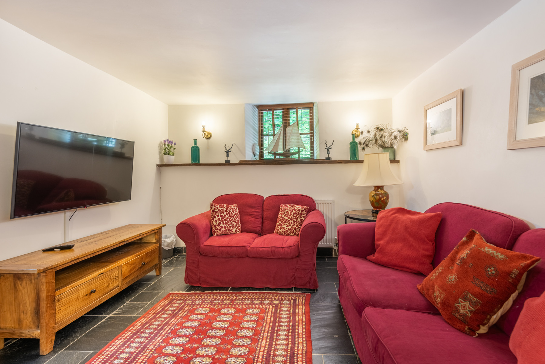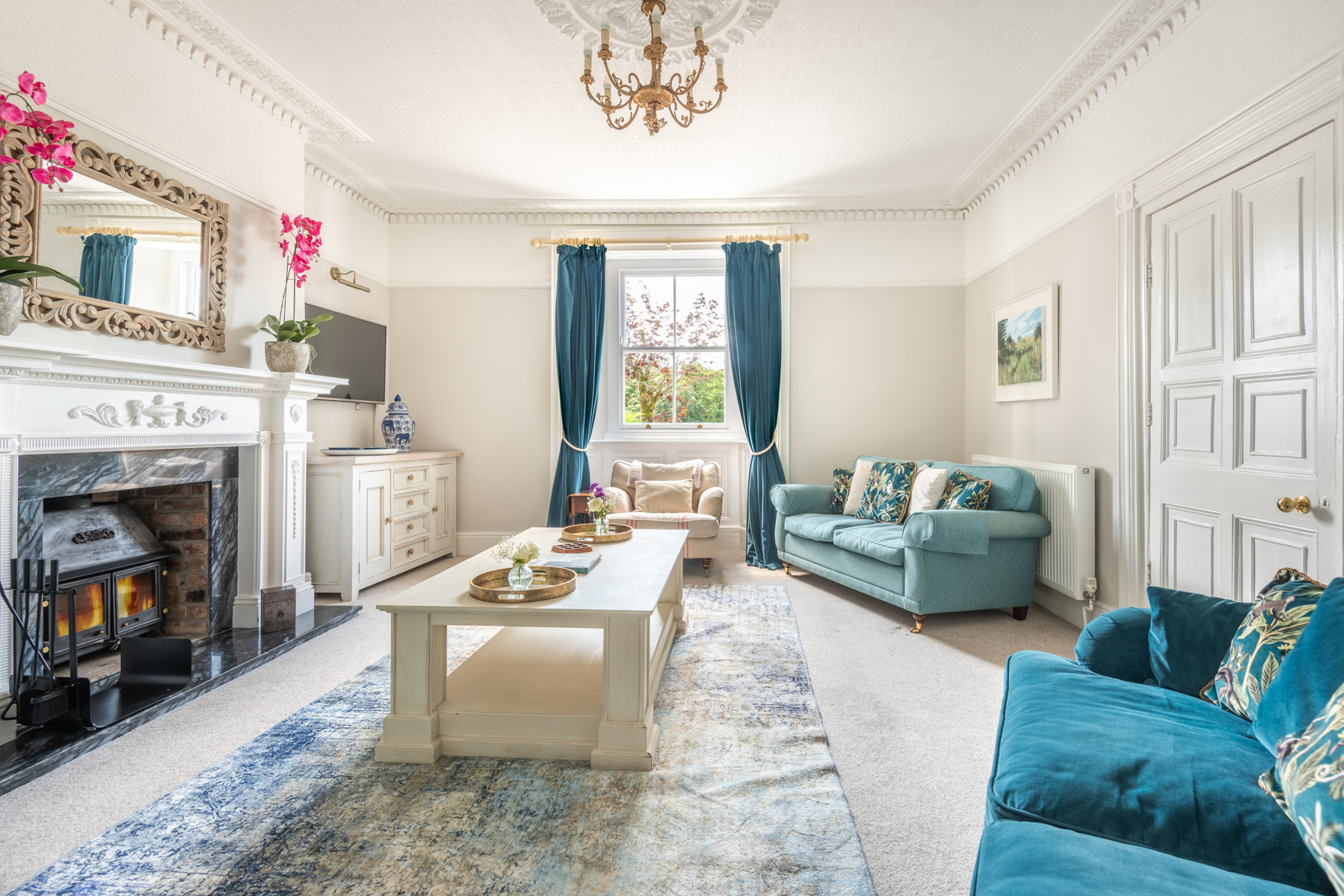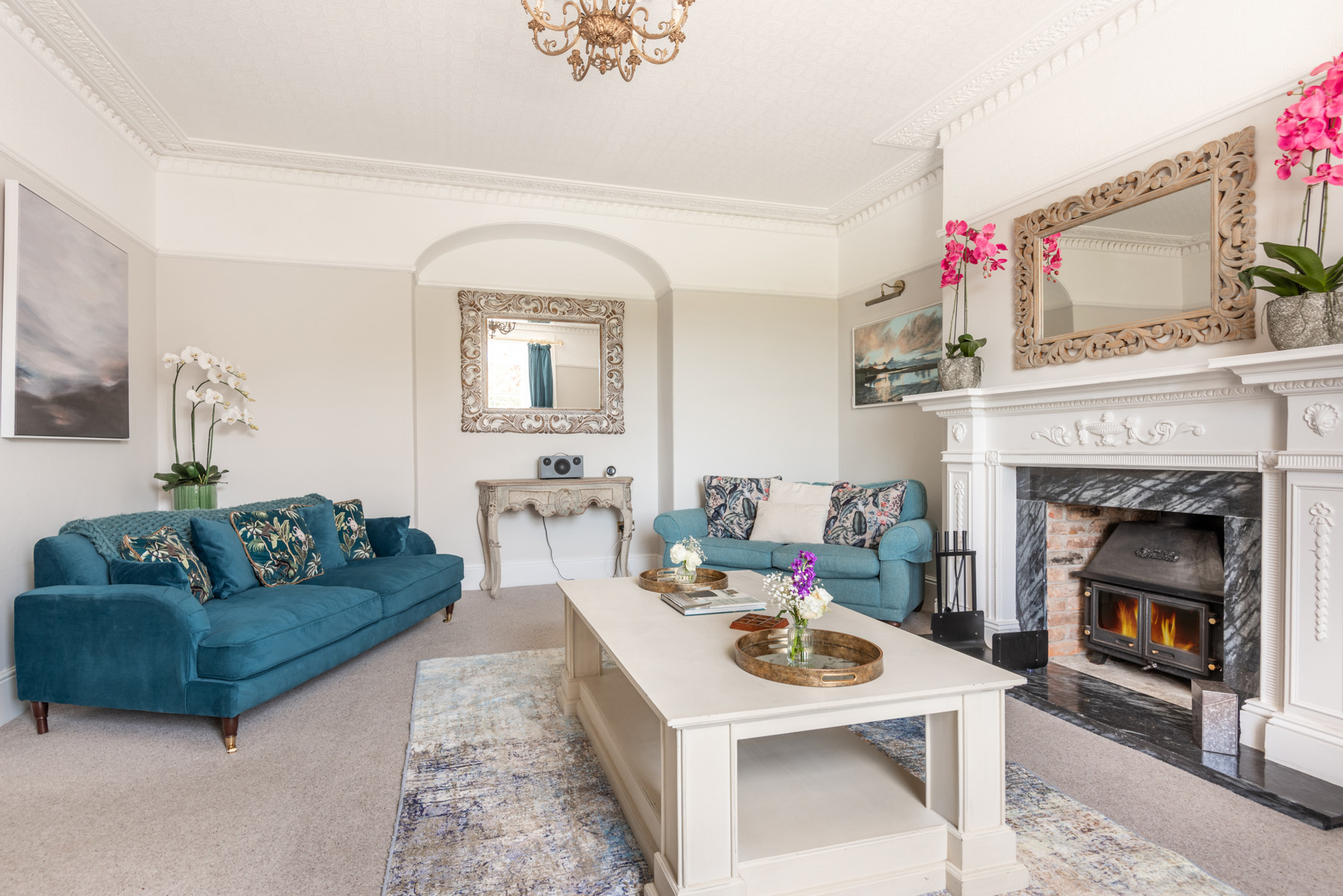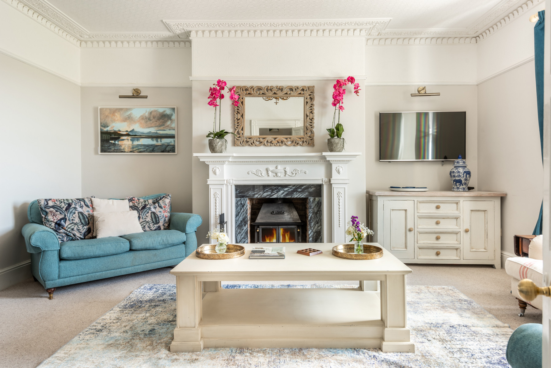 Large drawing room with deep sofas, 50” Smart TV with streaming services (Netflix, Prime Video & live sports) log burning stove.