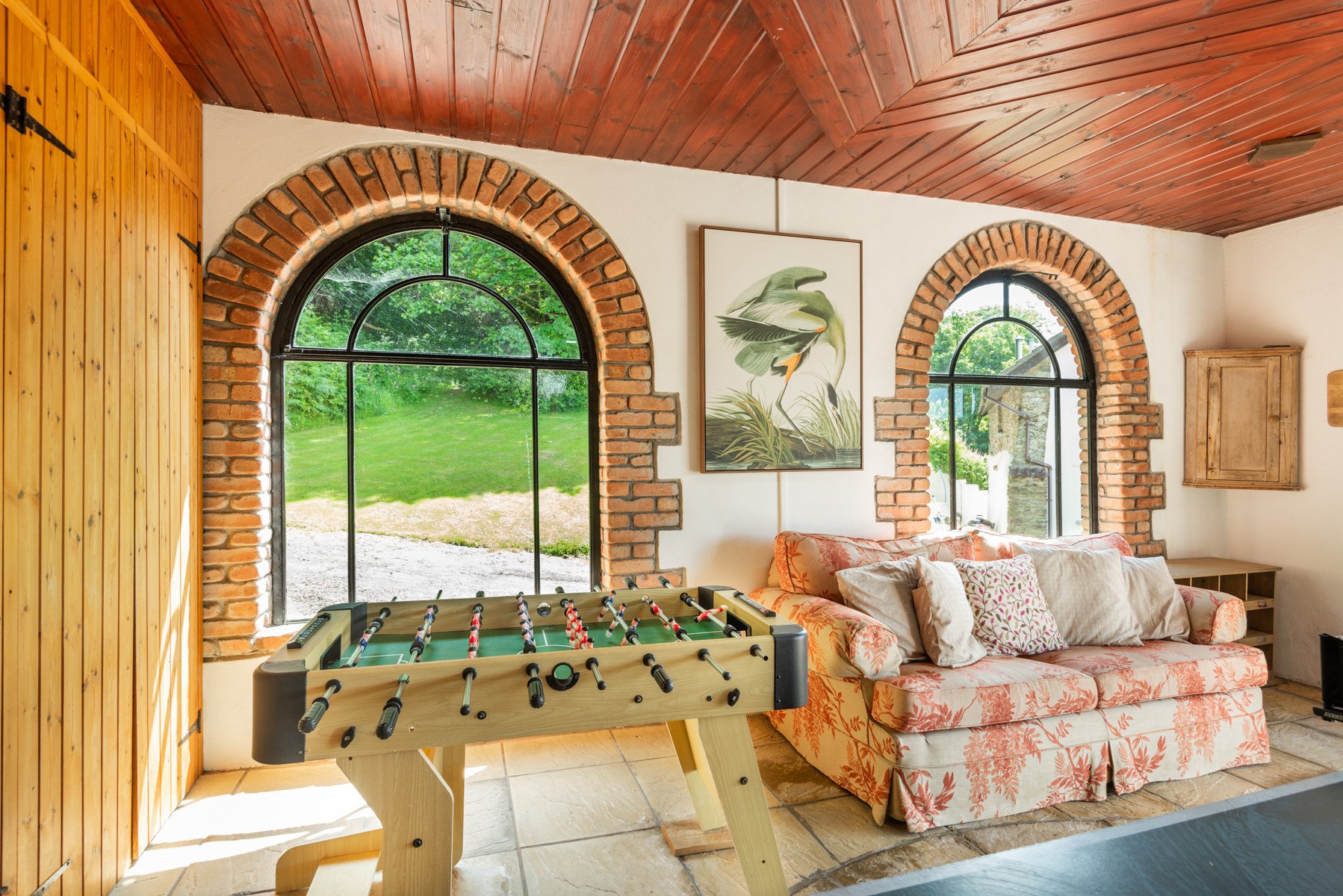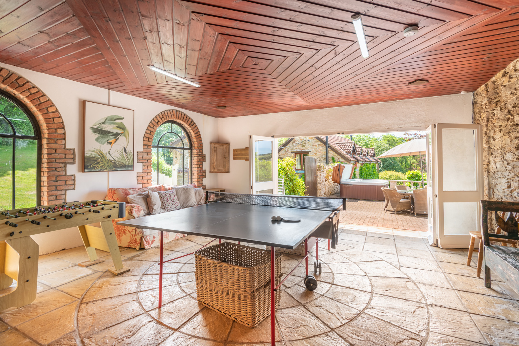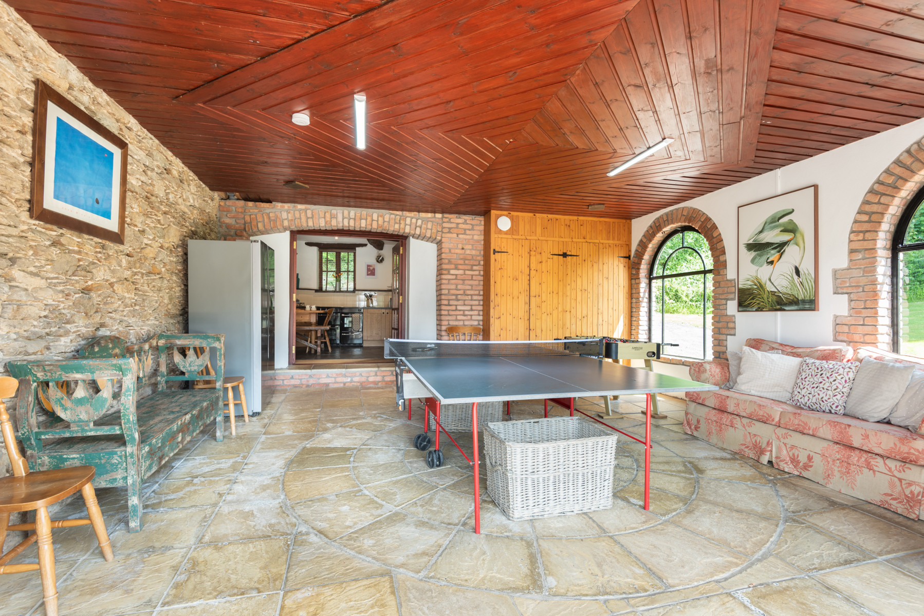 Stylish kitchen with range cooker, induction hob, dual ovens, dishwasher, American fridge freezer, washing machine, microwave, breakfast island with stools. The kitchen opens to the Garden room, providing a private games room with table tennis and table football. This space extends to a private south facing terrace with hot tub.