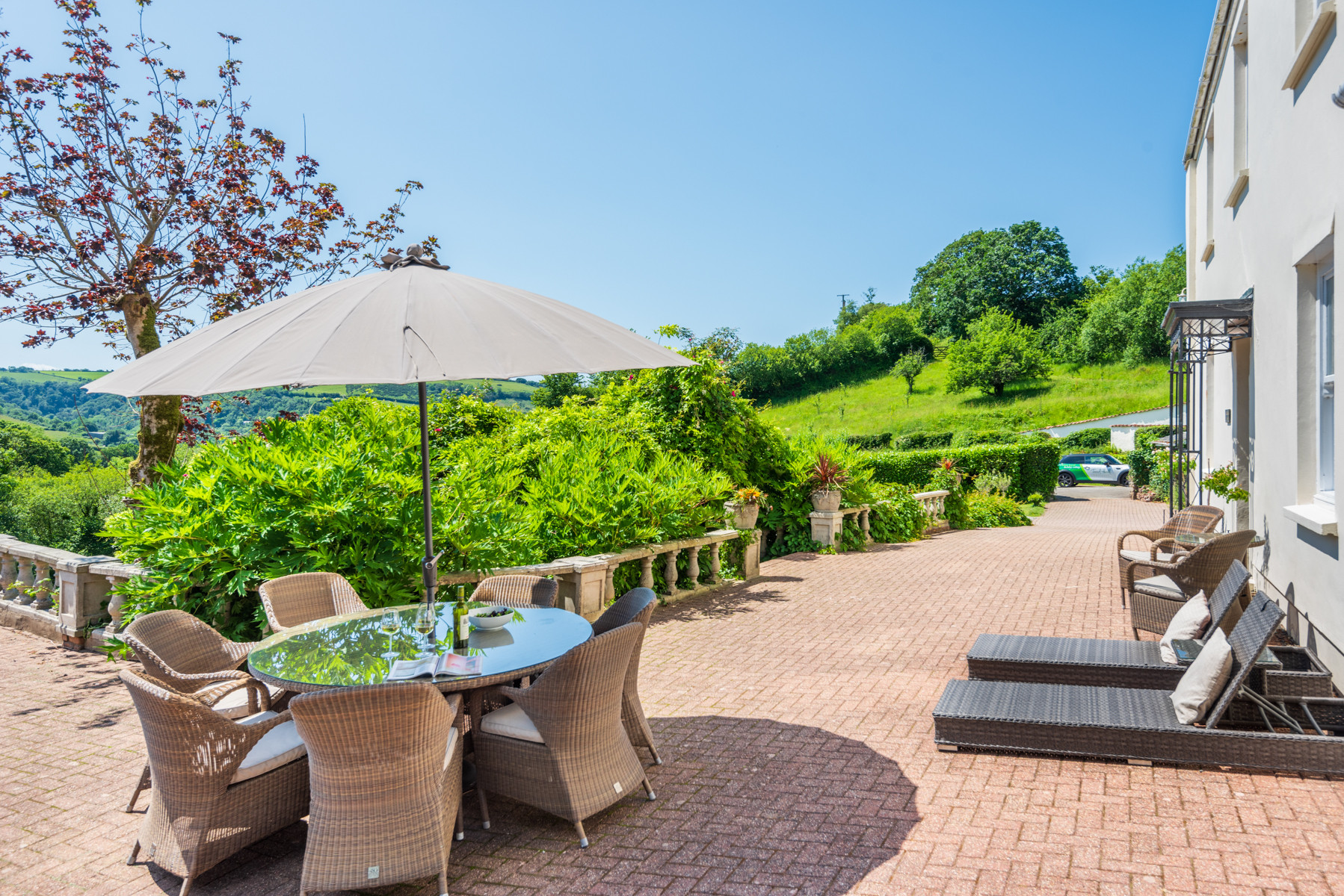 Private garden area and terrace with outdoor dining, sun loungers and charcoal barbecue. (shared grounds beyond).