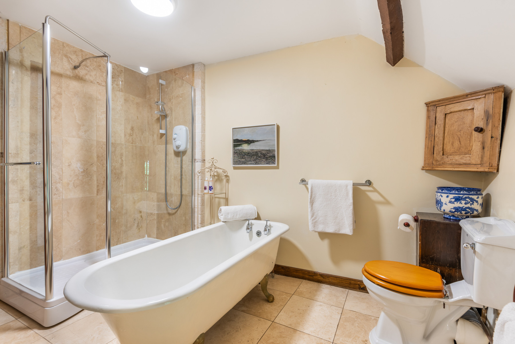 Large marble-lined family bathroom with beautiful roll-top bath and separate walk in shower, basin,WC