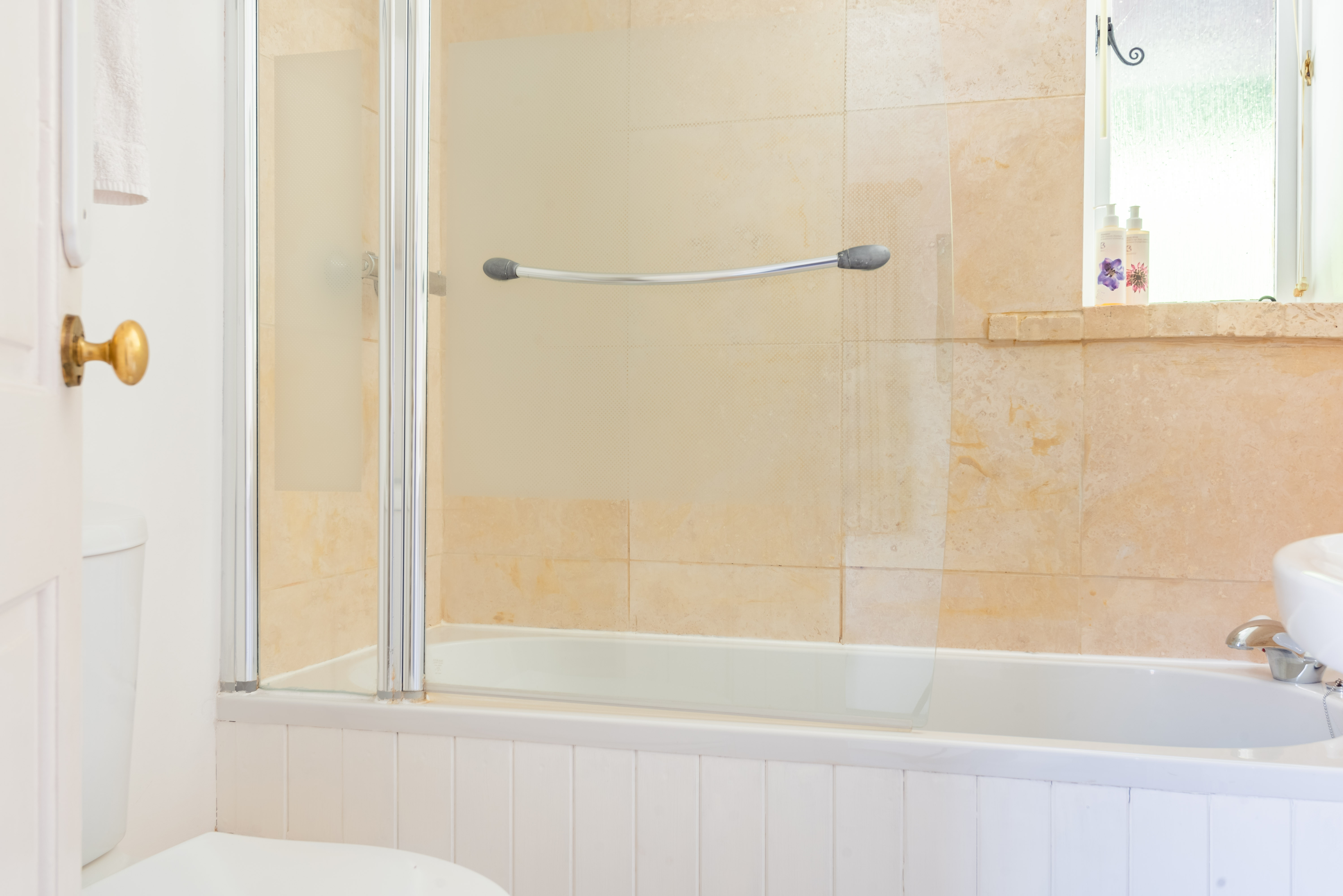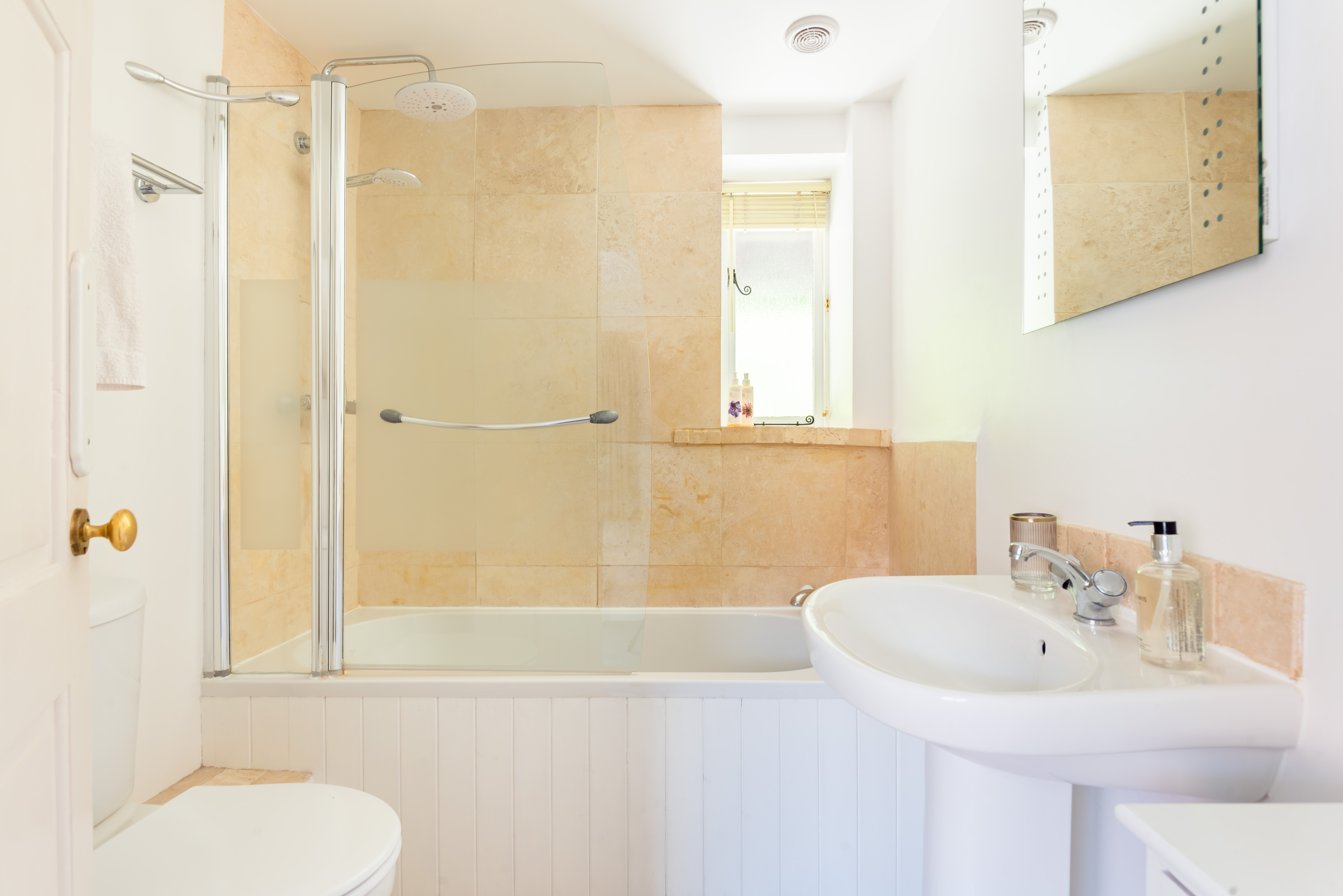 Family bathroom with bath and overhead shower, heated towel rail, basin, WC
