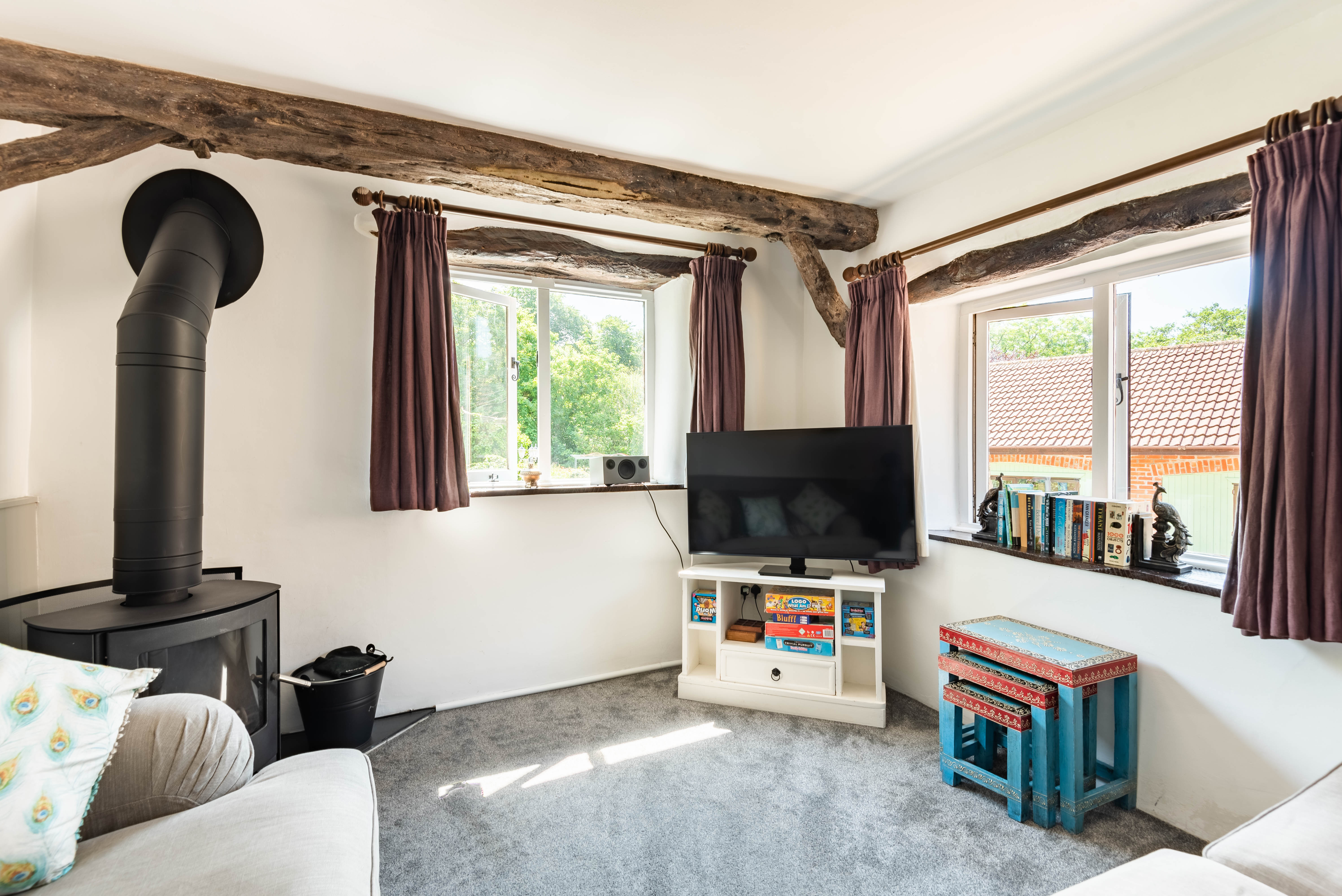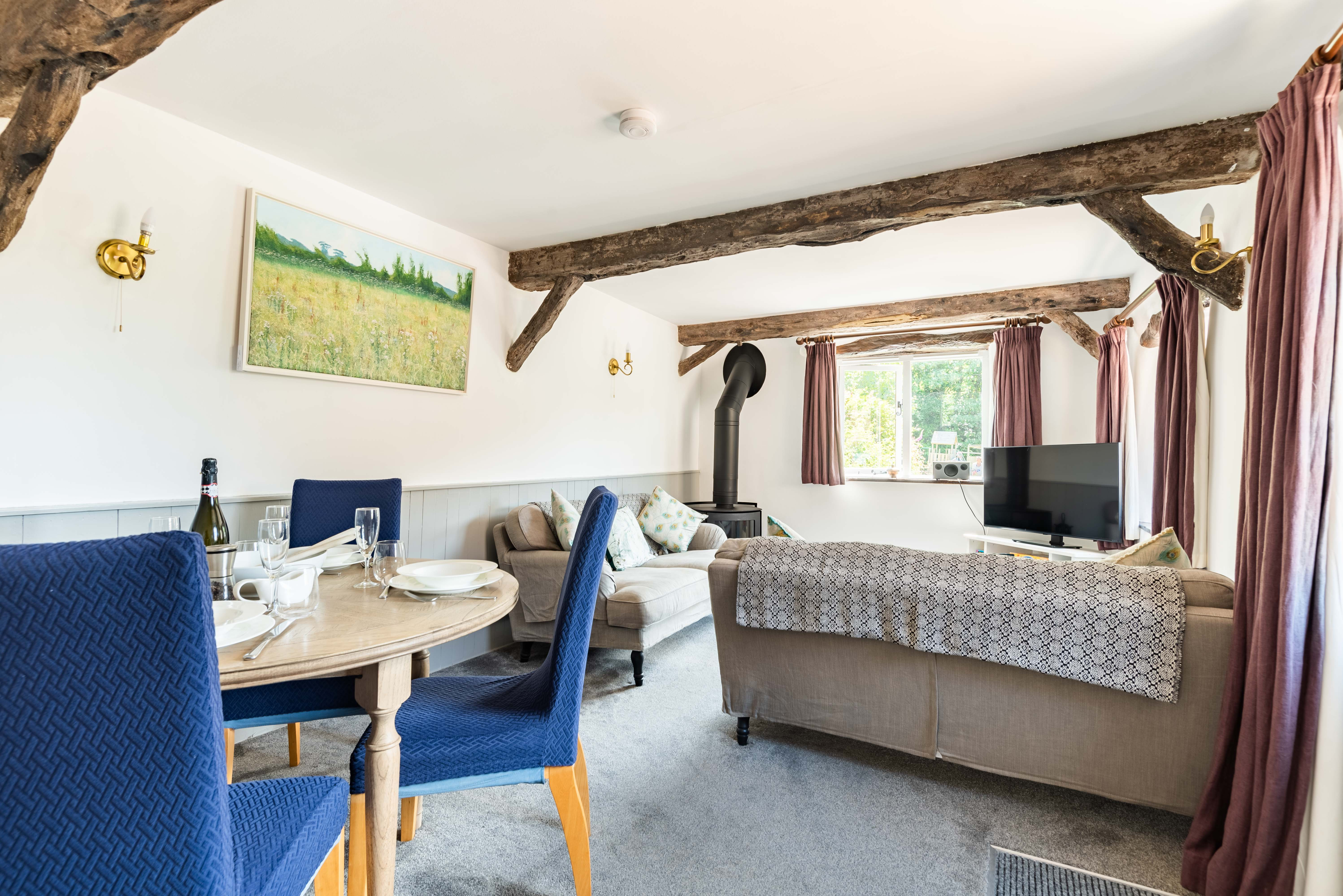 Spacious open-plan living with comfortable lounge area, two sofas, log-burning stove and Smart TV, bluetooth speaker. Dining area to seat four.