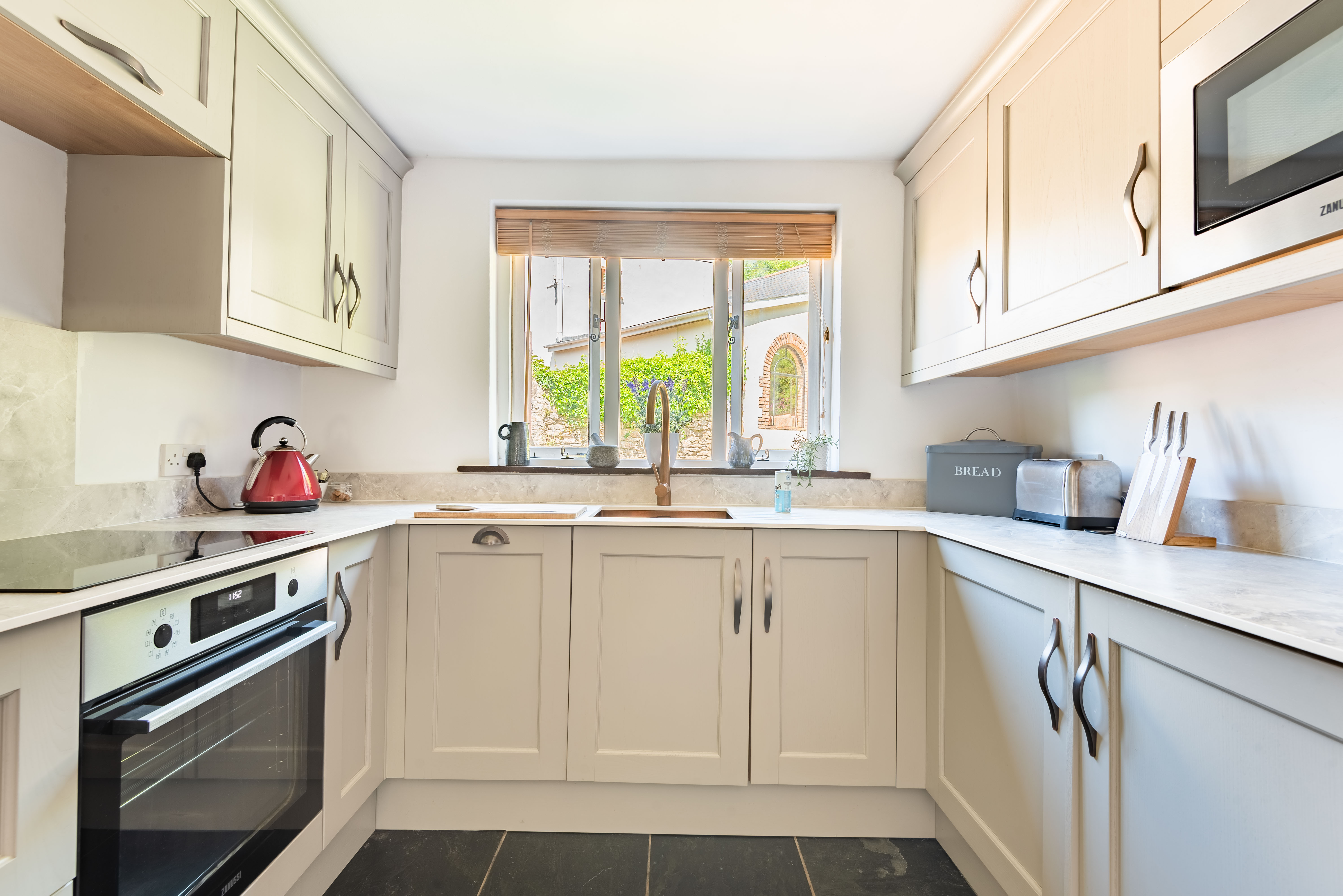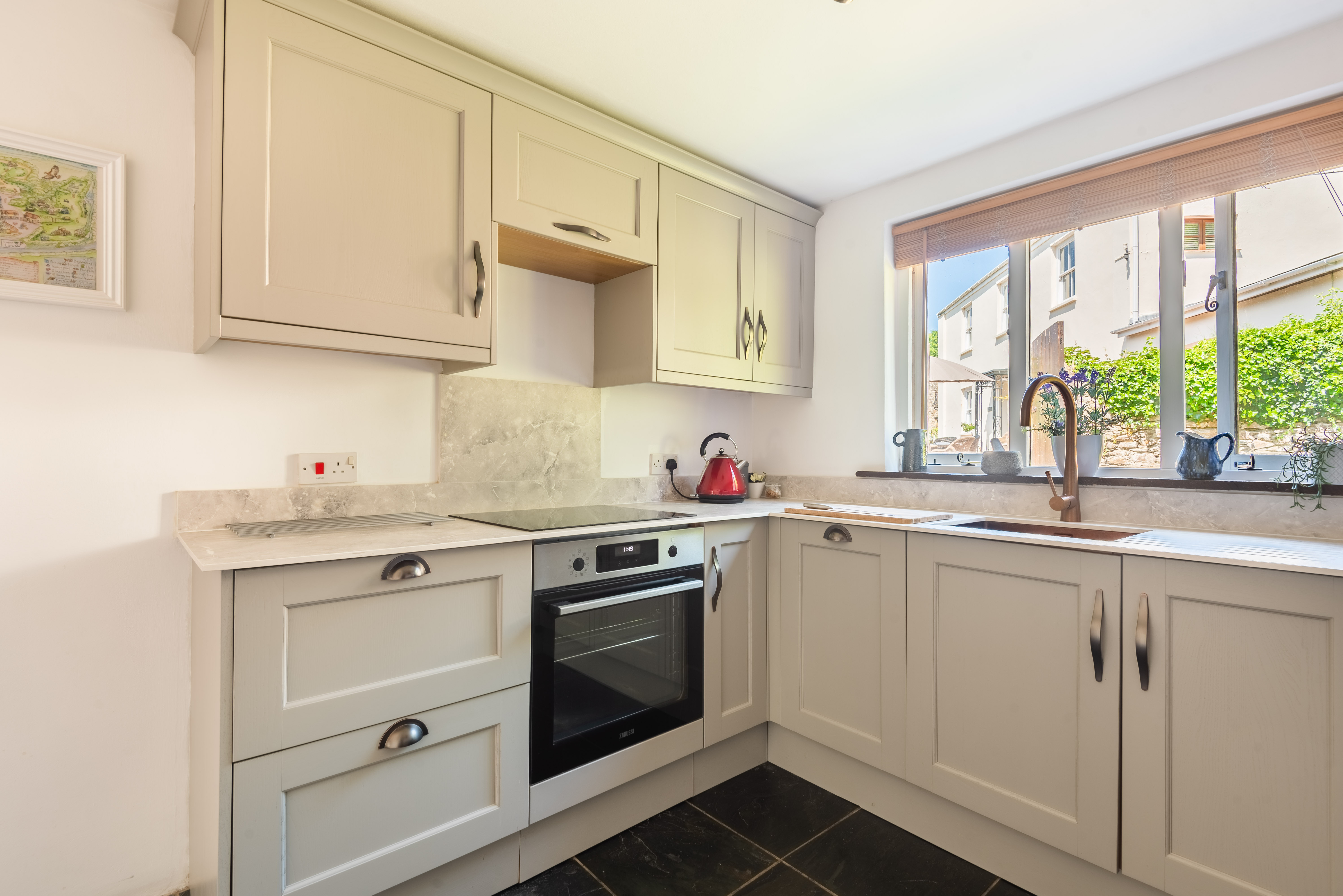 Three steps up to attractive fully equipped kitchen with electric oven and ceramic hob, microwave, dishwasher, under counter fridge with freezer compartment.