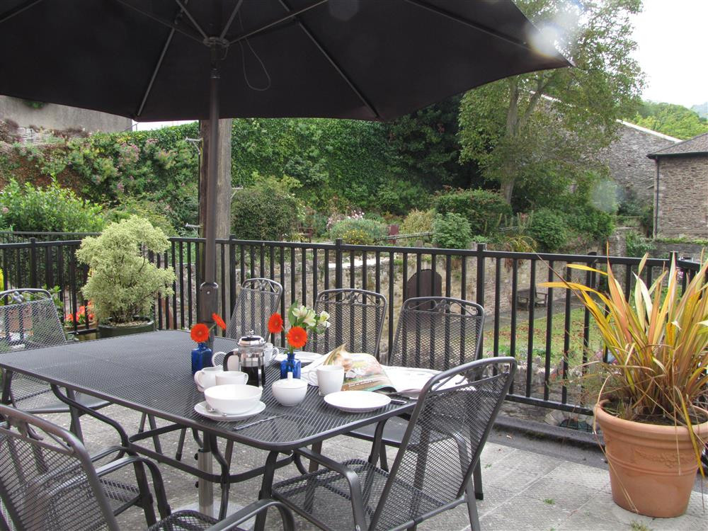 The sunny terrace at the rear of the property has a garden table and 8 chairs looking over gardens and wooded hillside beyond.
