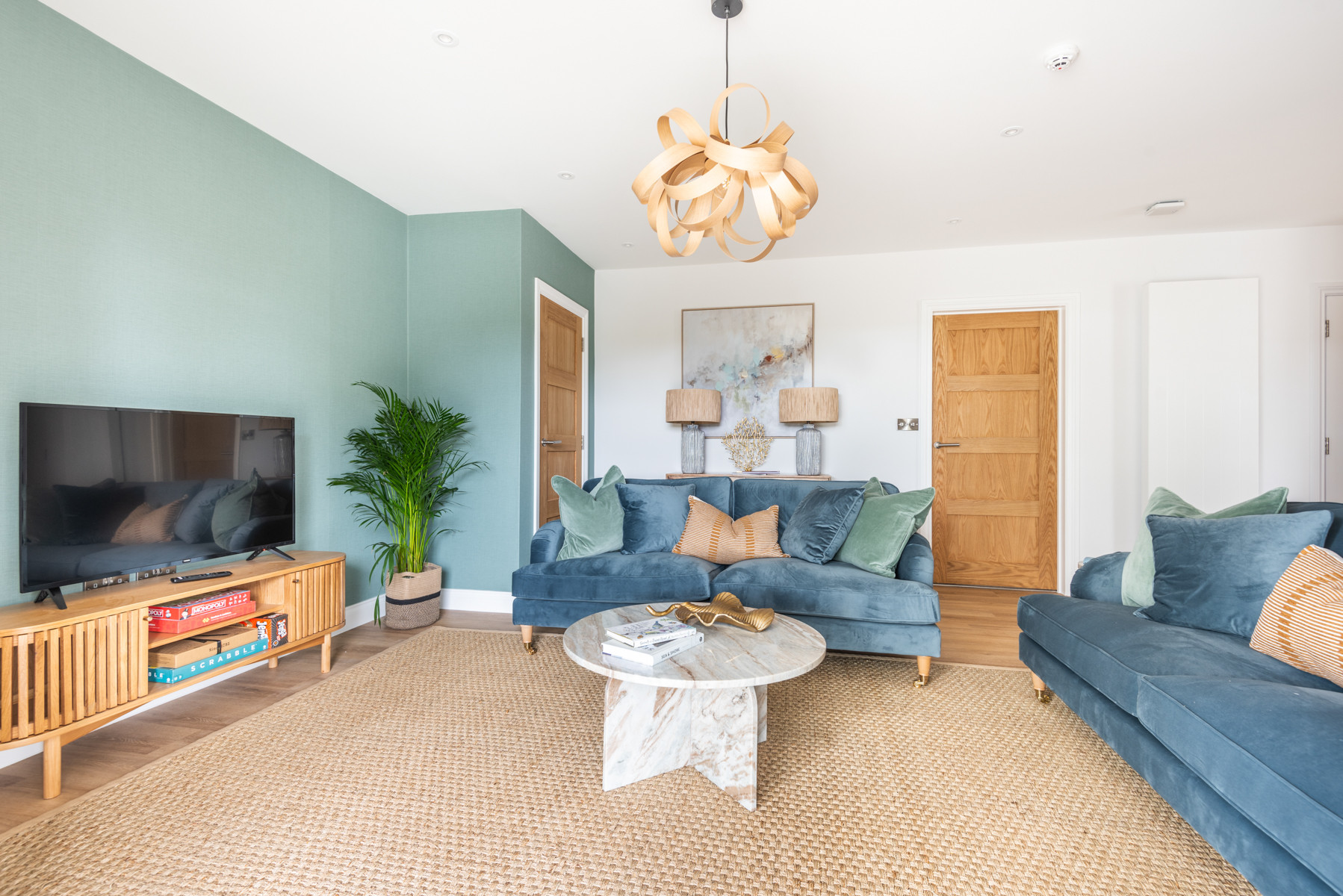 Lounge area with comfortable sofas, sideboard with books and games, Smart TV, patio doors to terrace.