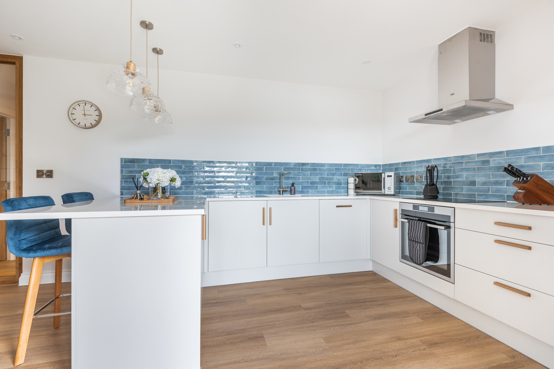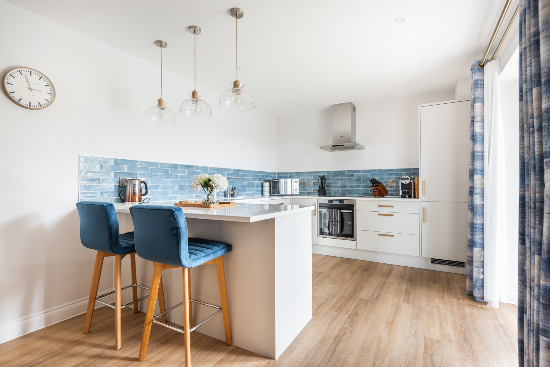 Open plan living room with elegant kitchen area., breakfast bar, fully equipped with electric oven and induction hob, microwave, Nespresso Virtuo coffee machine, dishwasher, washer dryer, patio doors to terrace.