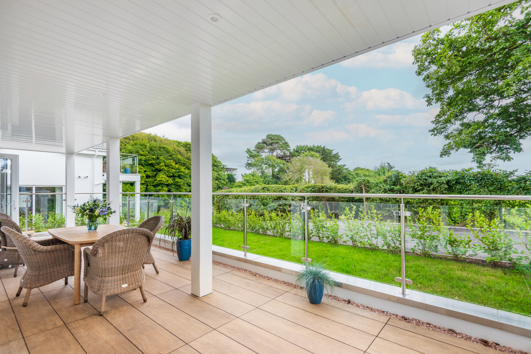 Outside: Full width private covered terrace furnished with garden table and chairs and comfortable outdoor seating.