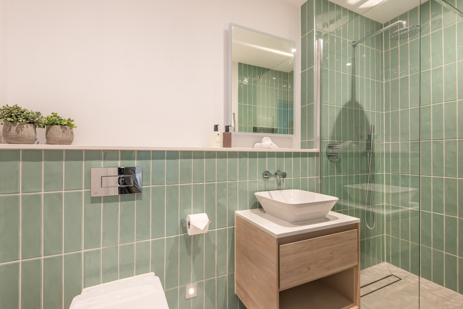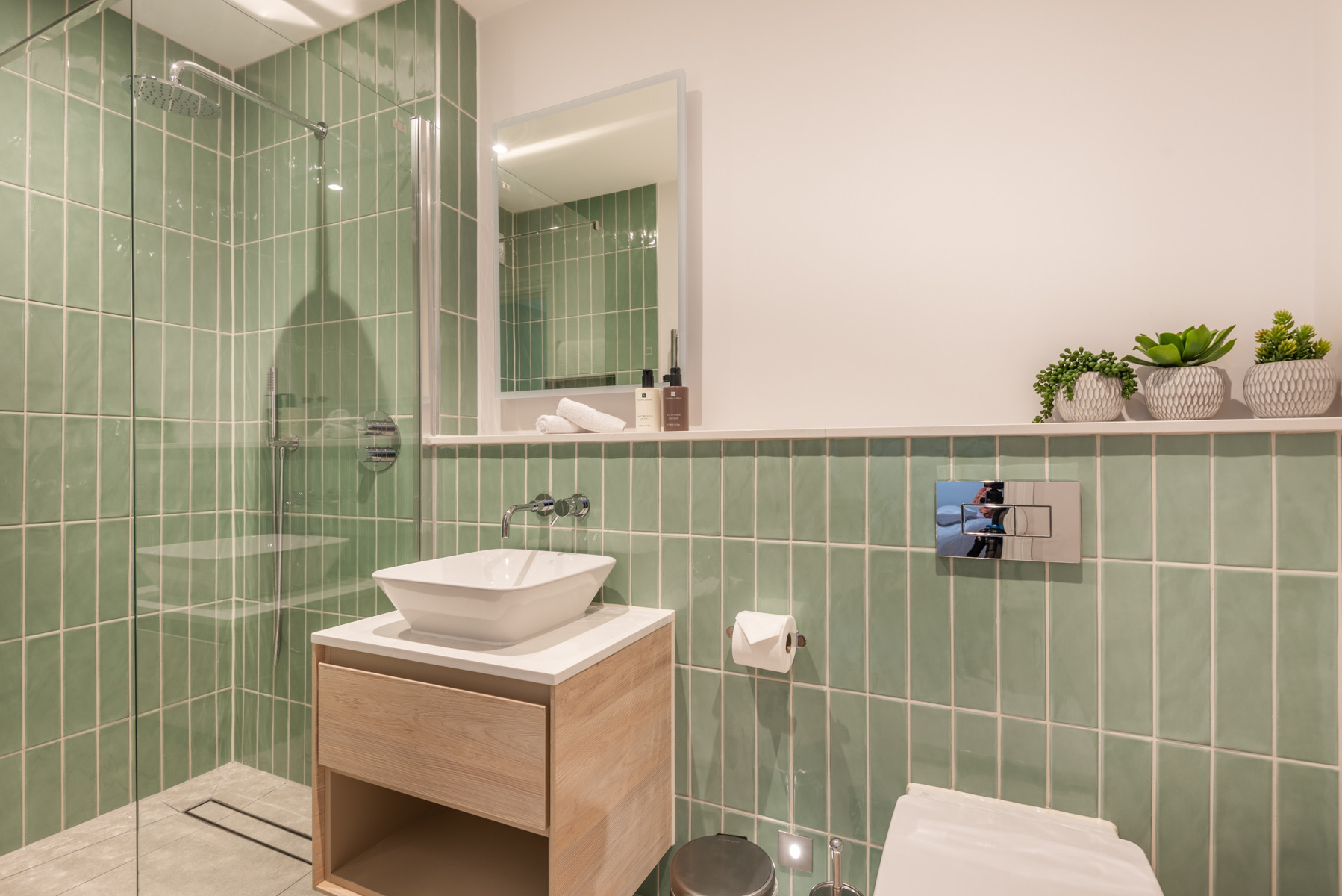 En suite shower room with large walk in shower, counter top basin, heated towel rail, WC