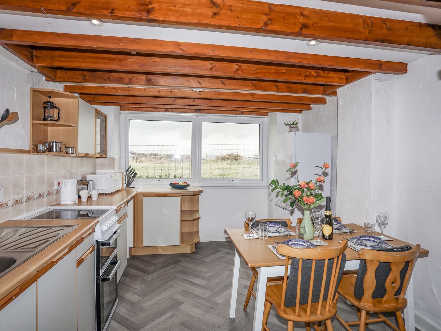 Electric storage heaters with electric stove. Electric oven and hob, microwave and fridge/freezer. TV with Freeview and WiFi. Fuel and power inc. in rent. Communal off-road parking with spaces for 2 cars. Two well-behaved pets welcome at a charge of £25 per dog per stay. Sorry, no smoking. Shop 1.7 miles, pub 0.7 miles, beach 0.4 miles. Note: Guests have access to on-site facilities, including: a laundrette with a washing machine and tumble dryer that take £1 coins and cost £3 per wash, a hosepipe and tap in a neighbouring field to rinse off wetsuits and dogs, along with a Play Barn area, games room, badminton and table tennis. Two electrical charging points for vehicles are available at Ty'n Don (payable via app).