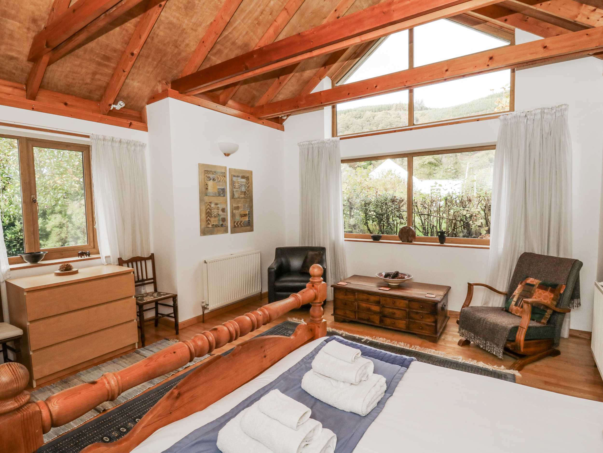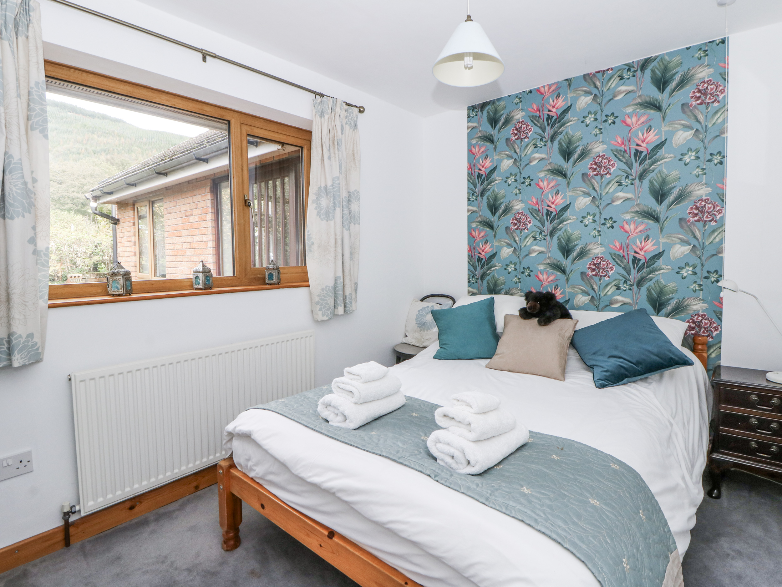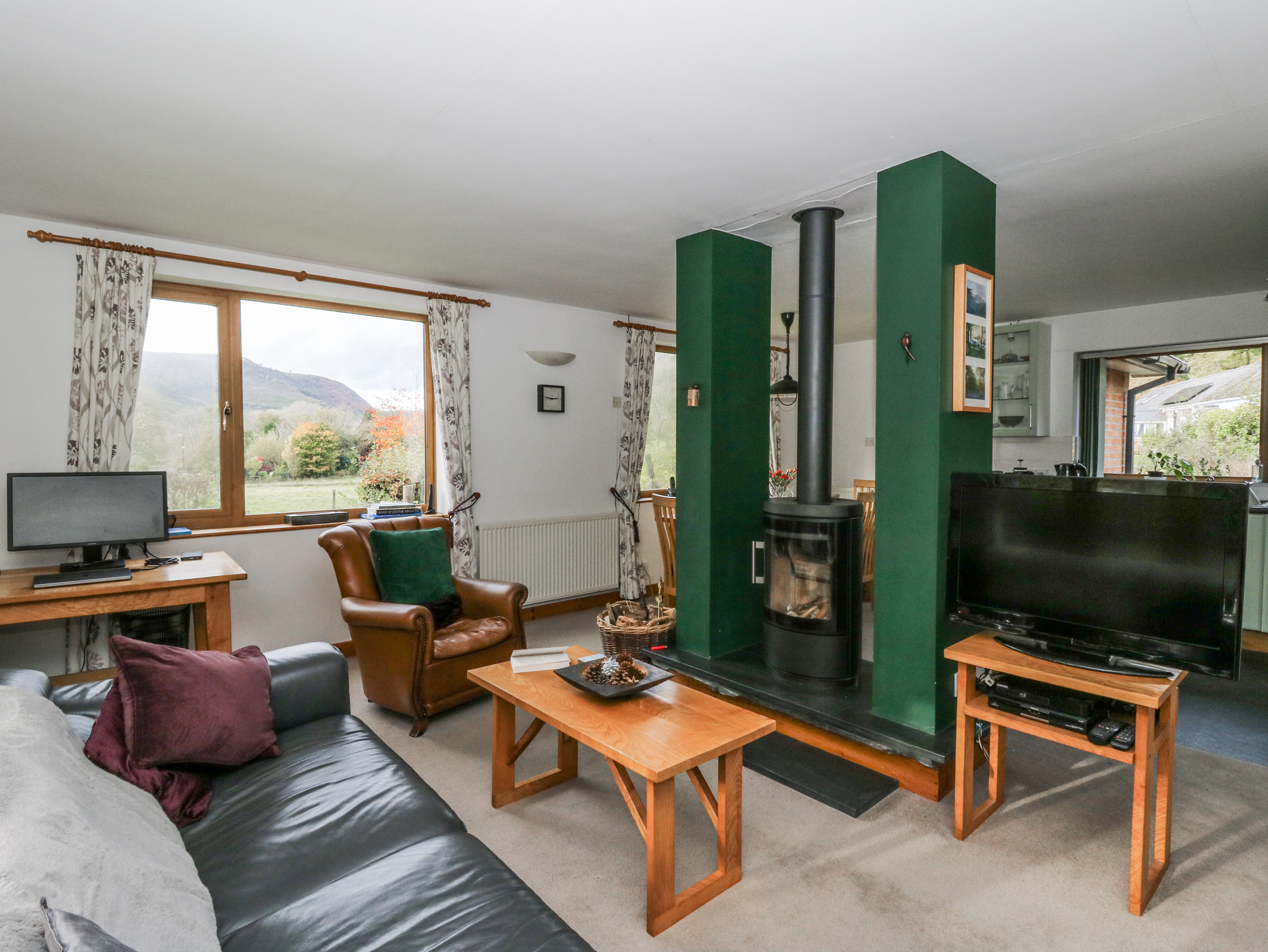 Oil central heating with woodburner. Electric oven and hob, microwave, fridge, washing machine, tumble dryer, TV with basic Sky package, DVD, WiFi, Apple Mac, telephone (on honesty box basis), selection of beach toys, board games and books. Fuel, power and wood for woodburner and chiminea inc. in rent. Bed linen and towels inc. in rent. Cot. Off road parking for 3 cars. Front lawned garden and patio with furniture, plus rear patio. One well-behaved dog welcome. Sorry, no smoking. Shop 7.4 miles, pub 0.3 miles. Note: There is no mobile signal in the valley. Note: Grounds bordered by streams on two sides, children and pets to be supervised. Note: Geryllan is for holiday rentals only
