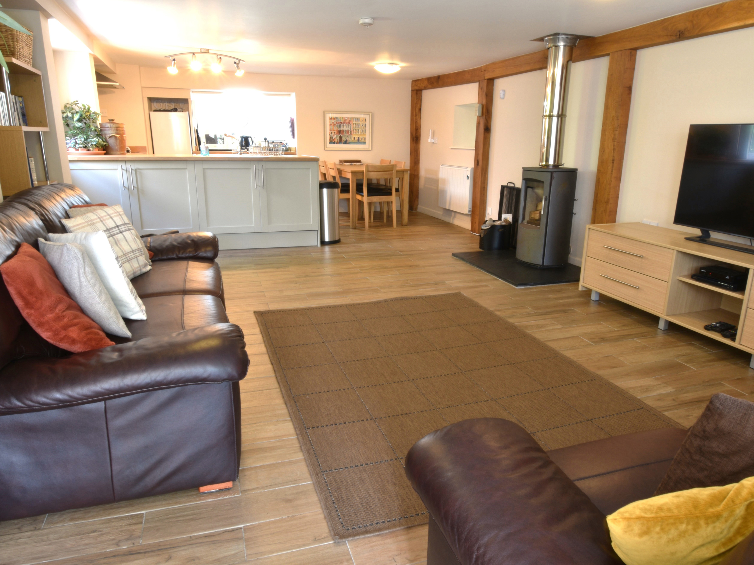 Electric heating with woodburner. Electric oven and hob, microwave, fridge and small freezer, dishwasher. Shared use of laundry room with washing machine and drying area. Smart TV, DVD, WiFi. Fuel, power, logs for wood burner inc. in rent. Bed linen and towels inc. in rent. Stairgate at the top and bottom of the stairs. Allocated off road parking for 2 cars, parked one behind the other. Electric vehicle charging point (payment for use direct to owners on site). Small riverside seating area at the front of the property, with shared access to the owner's extensive woodland riverside walk. Three well-behaved dogs welcome. Sorry, no smoking or vaping. Shop, pub and restaurants 7 miles. Note: Access to owners' dog wash area on request. Note: Due to valley location, poor mobile signal. Note: Dogs to be kept under control, due to being surrounded by working farmland. Please Note: Electric Vehicle Charging Point available at this property.
