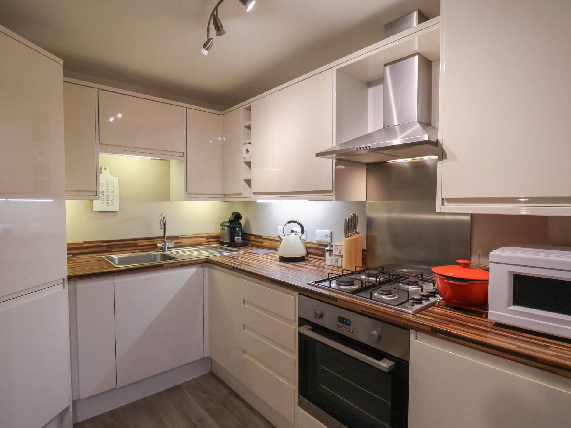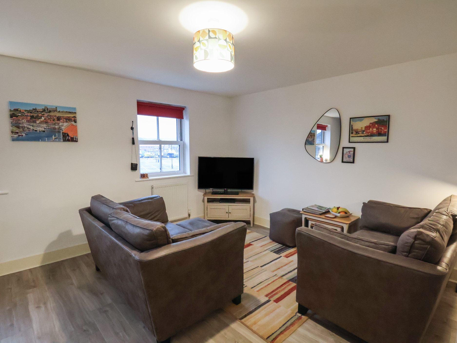 All Aboard is a modern, terraced cottage in Whitby, North Yorkshire. The cottage can sleep four people in two ground floor bedrooms; one king-size double and one twin, as well as a family bathroom which is also on the ground floor. The rest of the cottage is made up of a first floor open plan space with a kitchen, and a dining and sitting areas. There is also a first floor basin and WC. To the outside of the cottage is off road parking for one car and a front patio with furniture and a barbecue. All Aboard is in a quiet superb position, within easy reach of the coast, as well as the North Yorkshire Moors.Please note: As of January 2026 the bath with the overhead shower will be upgraded to a large walk in shower and no bath