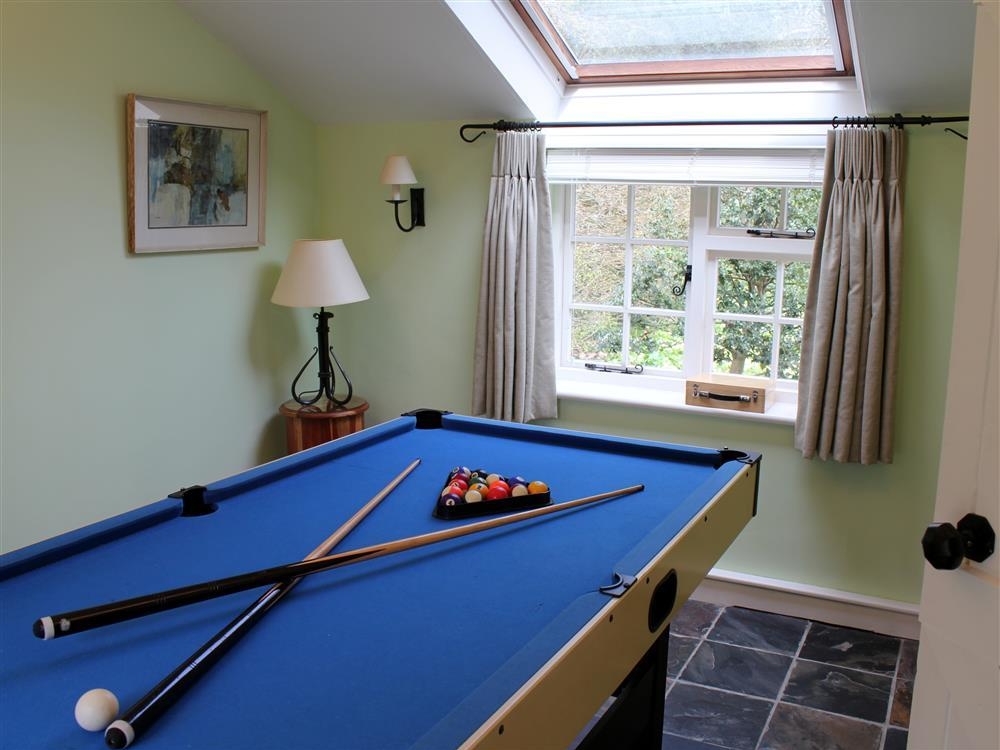 Central heating, Microwave, Washing machine, Tumble dryer (in shed), Fridge, TV with Freeview, WiFi. Log-burner starter pack of logs, kindling, firelighters and matches are included. Linen and towels inc. in rent. Cot (no mattress) and high chair available. Enclosed lawned garden with pond, shaw of light woodland, logstore. Vaulted games room with pool table. This is a no smoking property. One Small dog accepted - Charges apply. Unfenced pond is approx 1' deep, please supervise small children. Off road parking for 1 small to medium car and roadside parking for an additional one car The height of doorways and ceilings may not be suitable for very tall people.The entrance to the car parking space is tight. When approaching from the south it is advised to either drive slightly north of the entrance to reverse in, or to turn the car at the entrance to Swan Wood Lodge/House for a smooth nose-in approach. The lane is quiet in the evenings and for much of the day, but traffic can be fairly busy at peak times. A Good Housekeeping bond of £200 is required for this property.