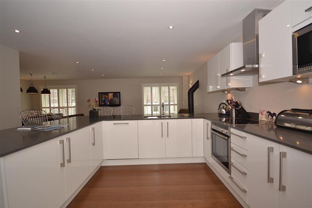 Accommodation: Open plan living space. Modern Kitchen with ceramic hob, built-in oven, microwave, fridge/freezer and dishwasher. Living room with woodburner, two sofas, armchair, 42" Freeview TV, Blu-ray player, Playstation 3 and dining table to seat six. Utility room with washing machine and dryer. First floor: Double bedroom with king size bed and en-suite shower room (shower cubicle, WC and basin). Double bedroom with king size bed. Twin bedroom with two 3ft single beds. Family bathroom with bath, shower over, WC and basin.