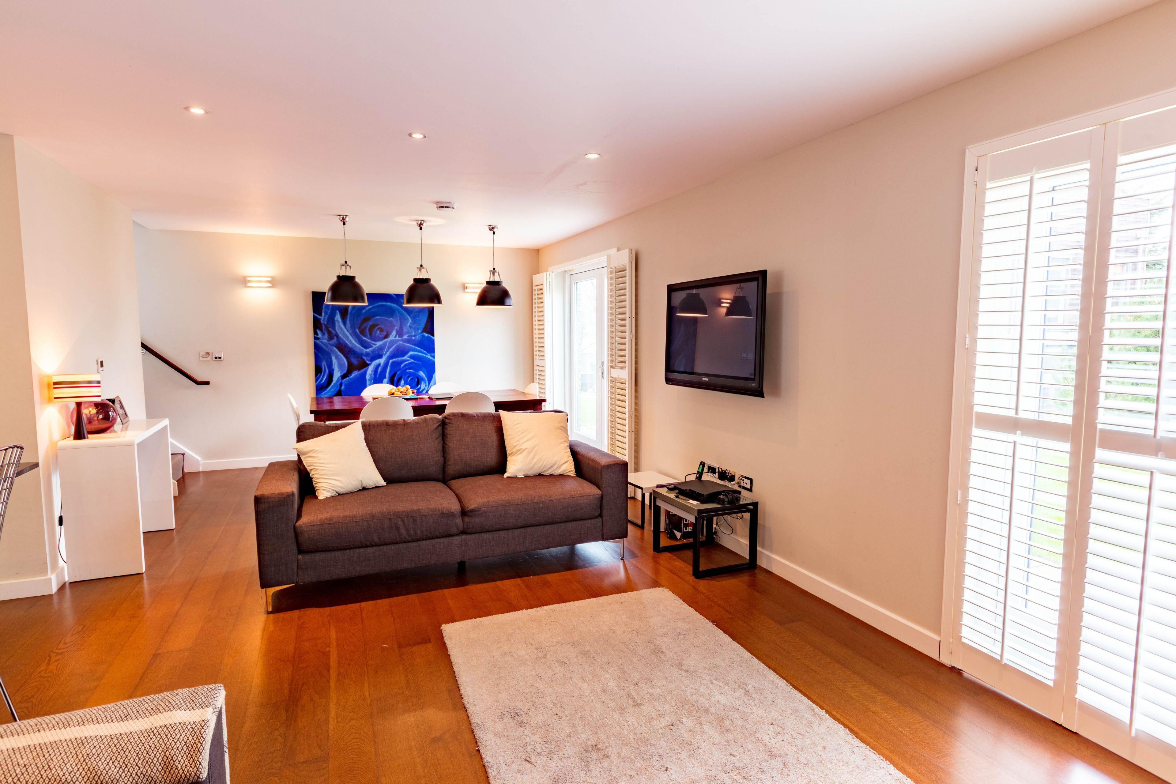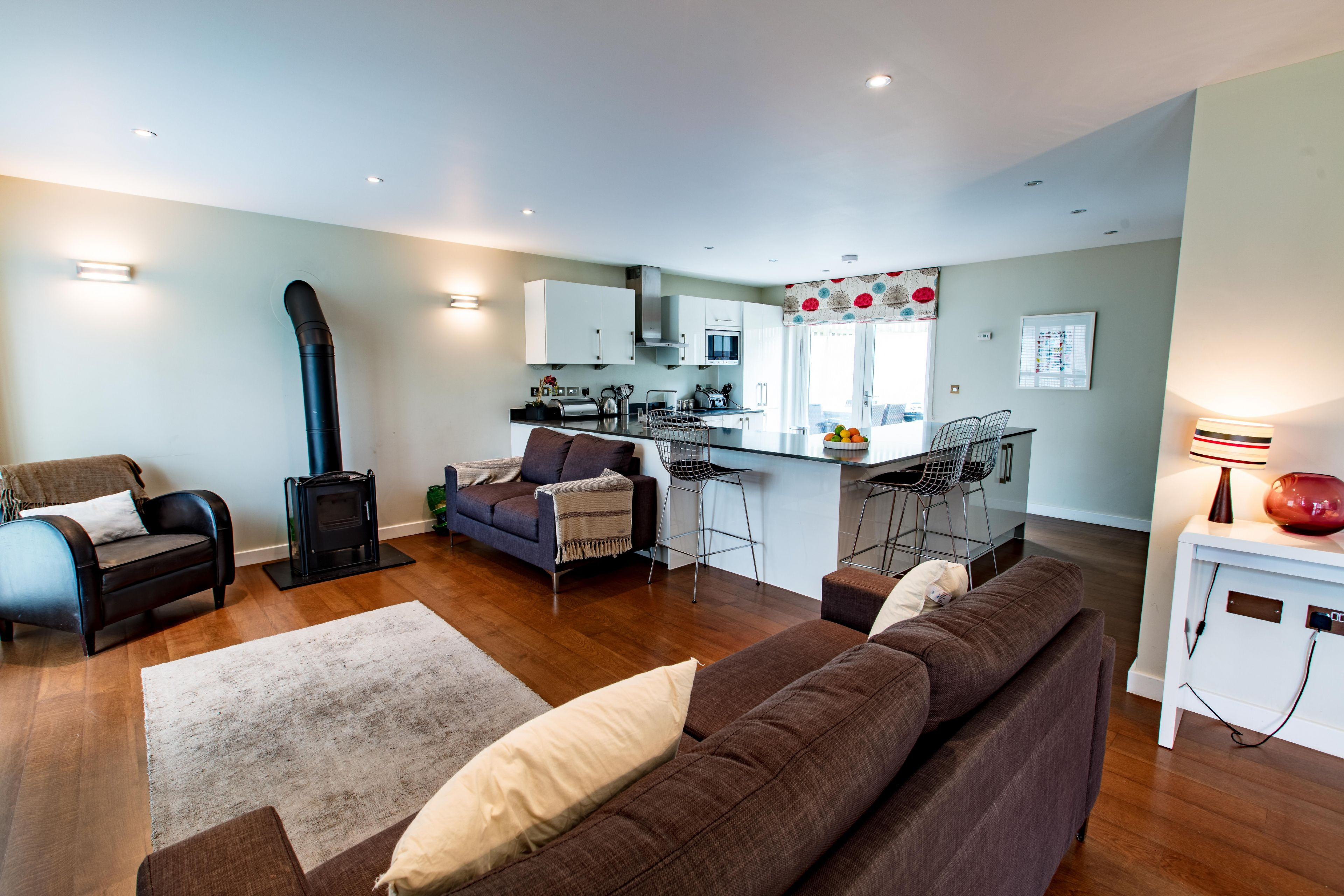 Open plan living space. Kitchen with all NEFF kitchen appliances, touch control ceramic hob, built-in oven, microwave, fridge/freezer and dishwasher. Living room with woodburner, two sofas, armchair, 42" Freeview TV, Blu-ray player, Playstation 3 and dining table to seat six. Separate utility room with washing machine and dryer. Stairs up to first floor. Double bedroom with 5ft king size bed and en-suite shower room (shower cubicle, WC and basin). Second double bedroom with 5ft king size bed. Twin room with two single 3ft beds. Family bathroom with bath, shower over, WC and basin.