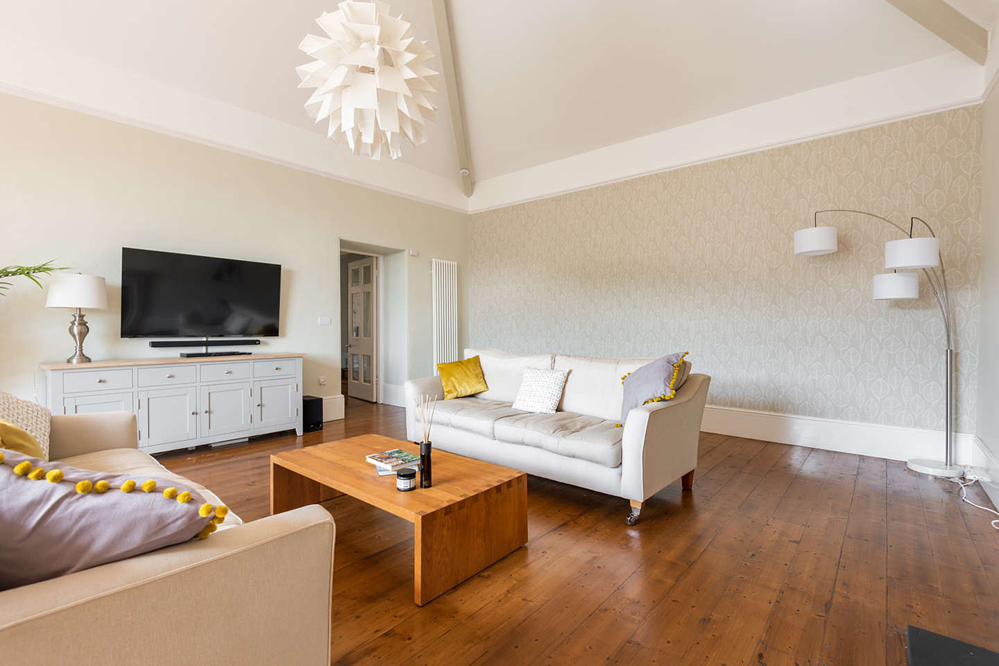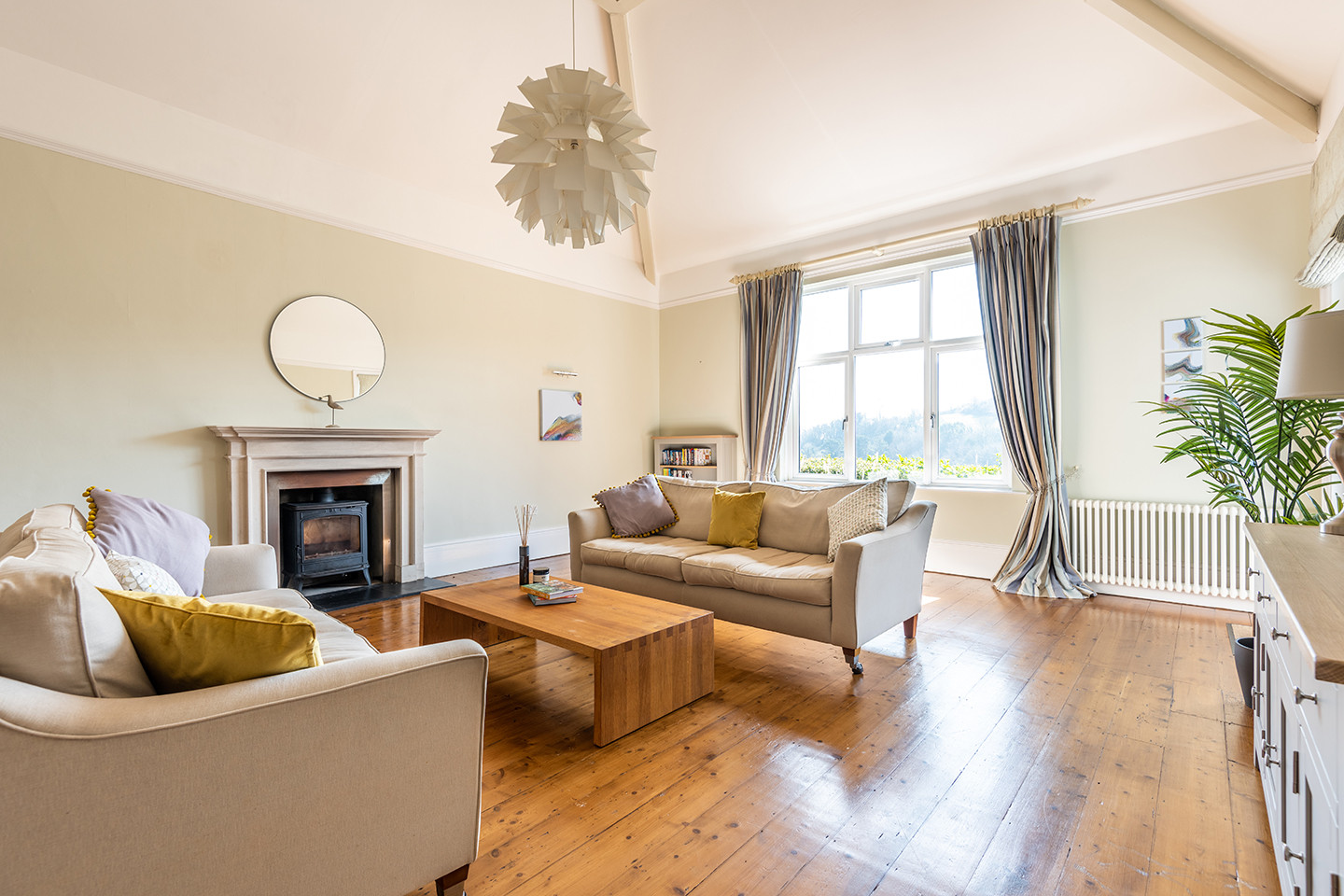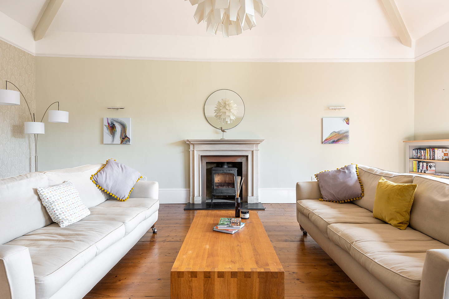 Sitting room with two 3-seater sofas, feature log burner, smart television, Bluetooth speaker and single door leading out to the front terrace with outside seating.