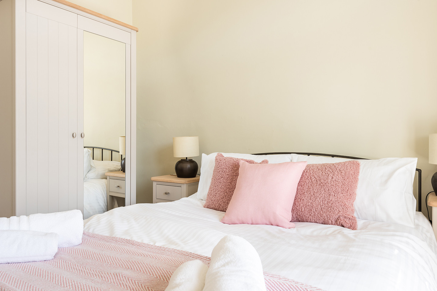 Bedroom 1 with 6ft super king size bed (can be made into twin 3ft beds on request at the time of booking), smart TV and patio doors to front terrace with outside seating.