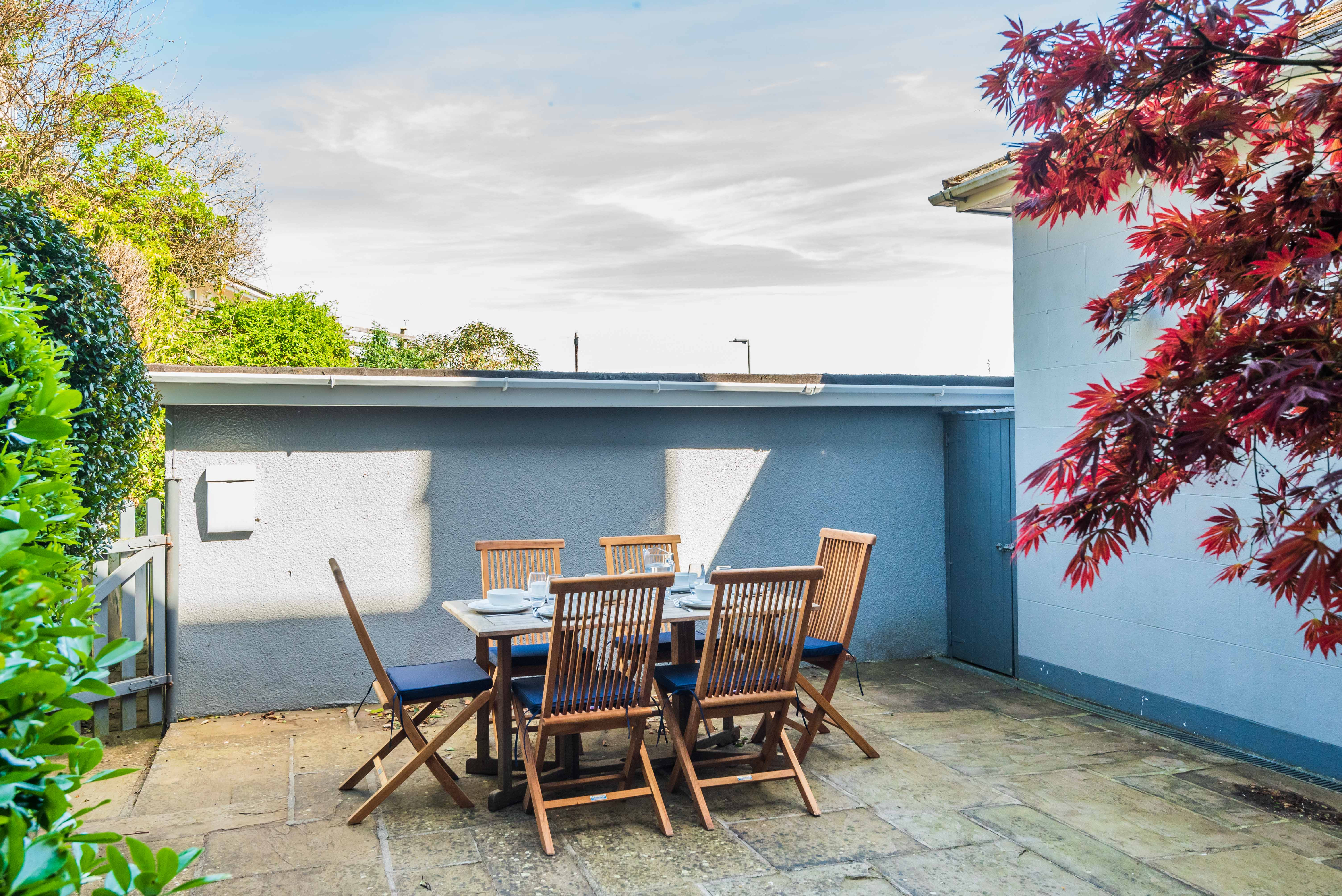 The property has a spacious tiled courtyard with table and seating for 6 and a front terrace area accessed from the sitting room and bedroom 1 and 2 with outside seating.