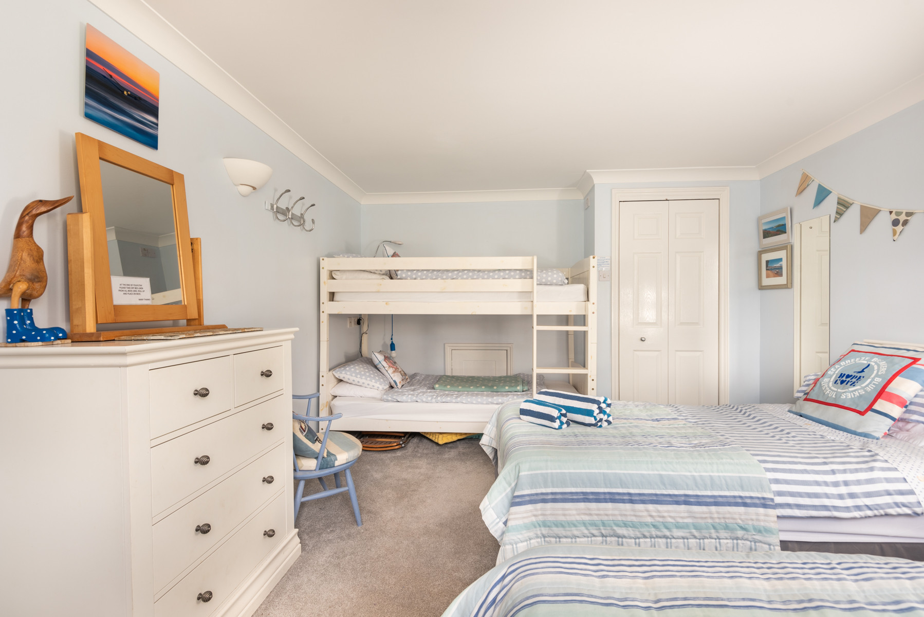 Bedroom 2 with 3ft twin beds and a set of bunk beds, ensuite shower room with shower, basin and WC