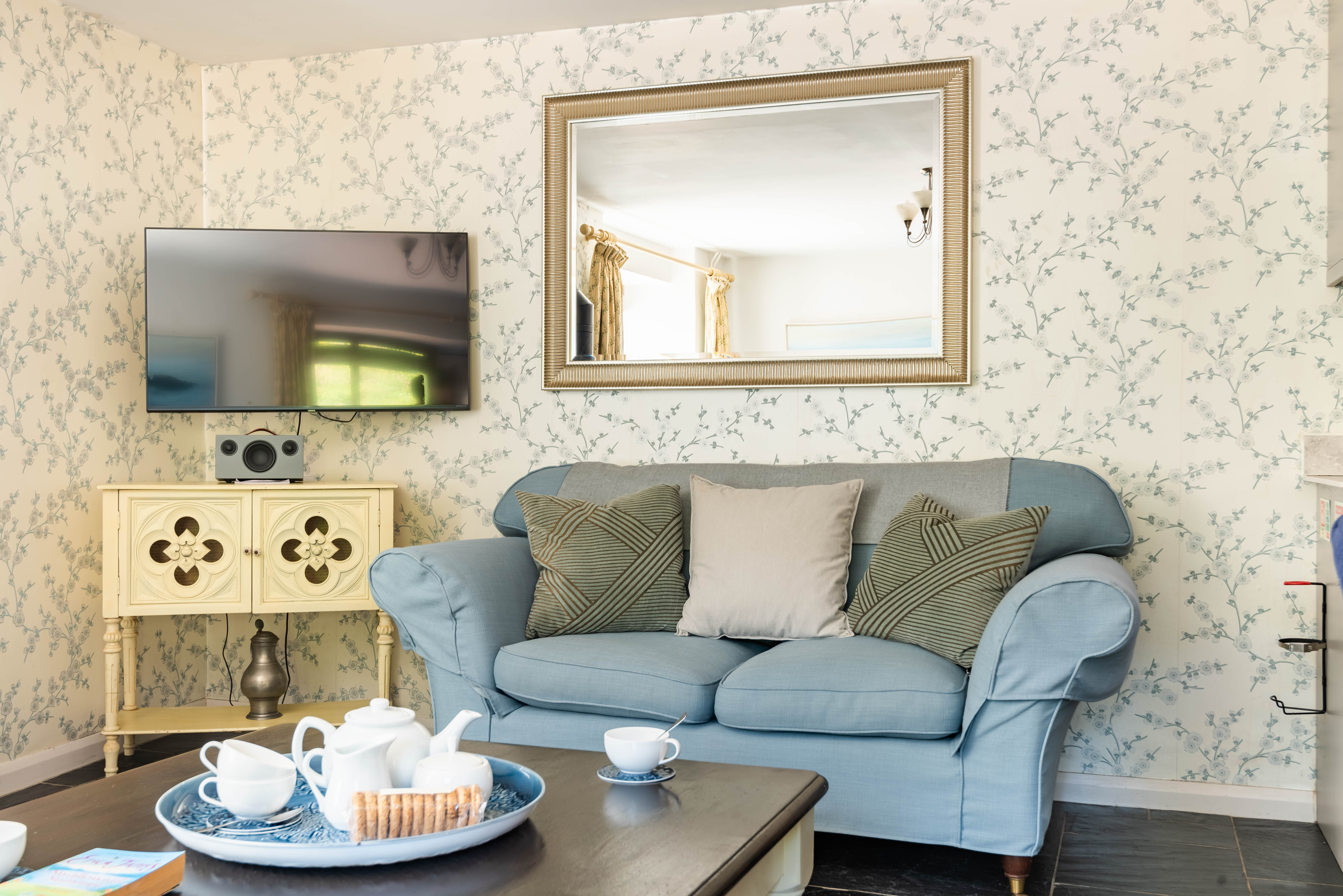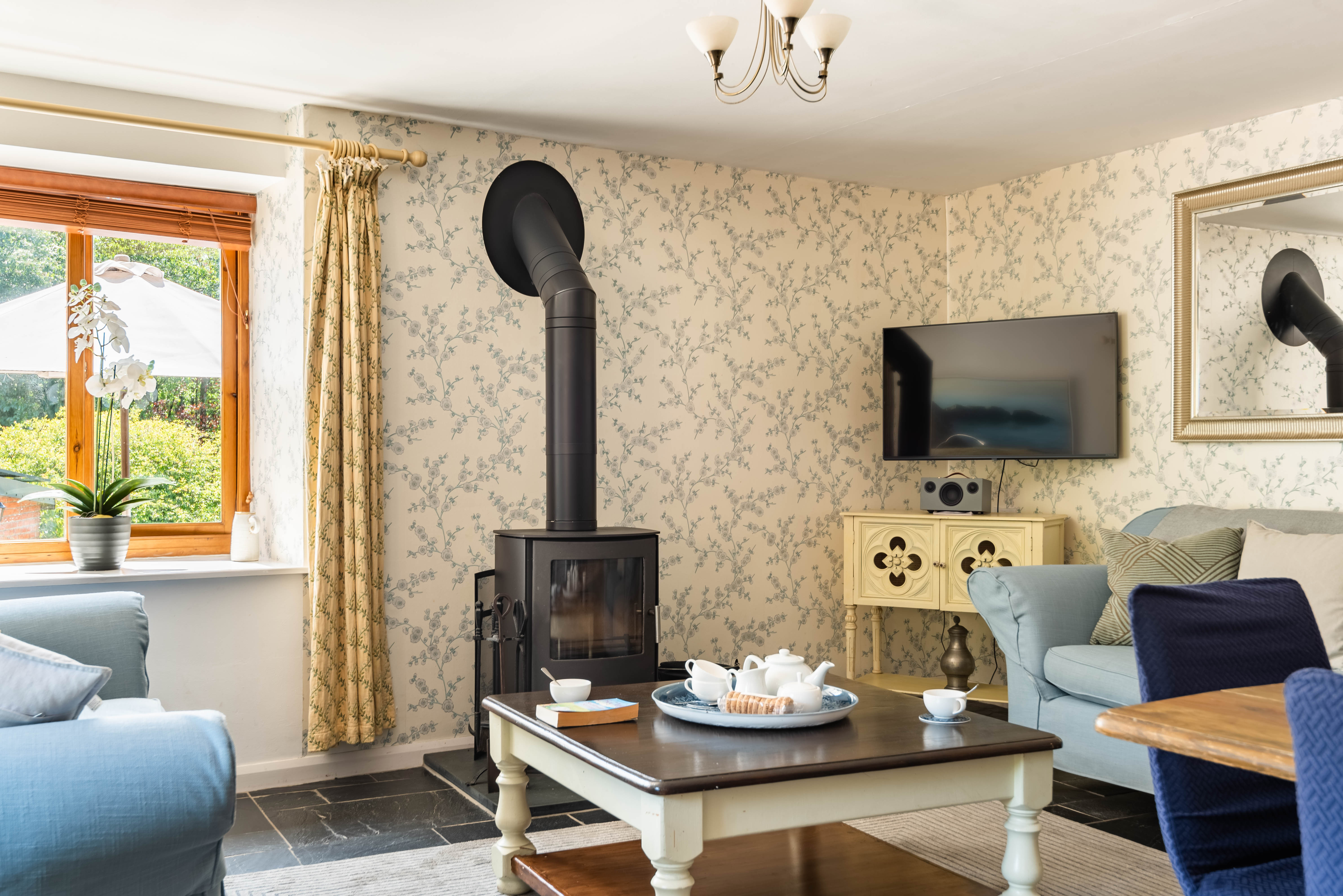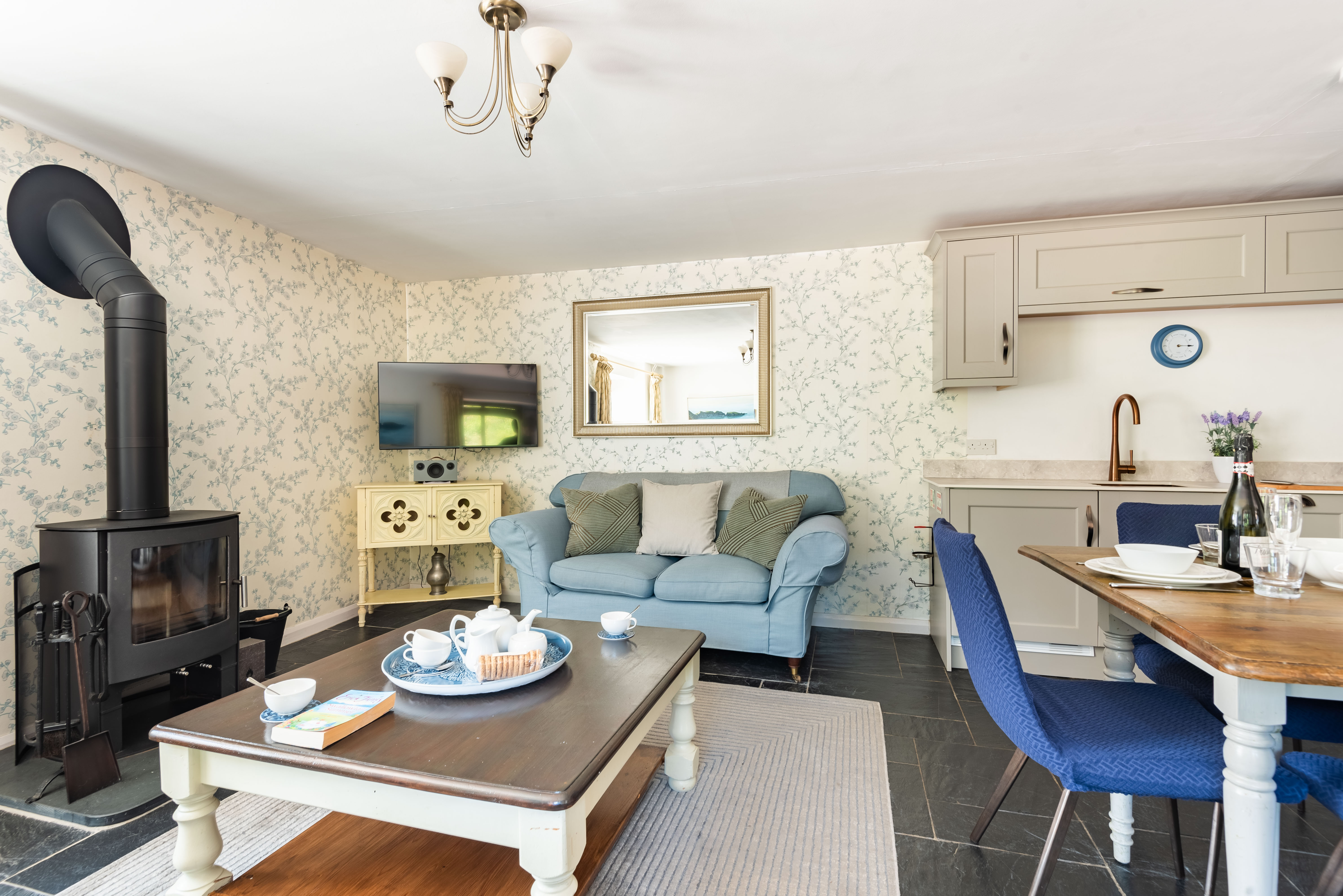 Open-plan living space. Lounge area with comfy sofas, Smart TV, bluetooth speaker and log burning stove.