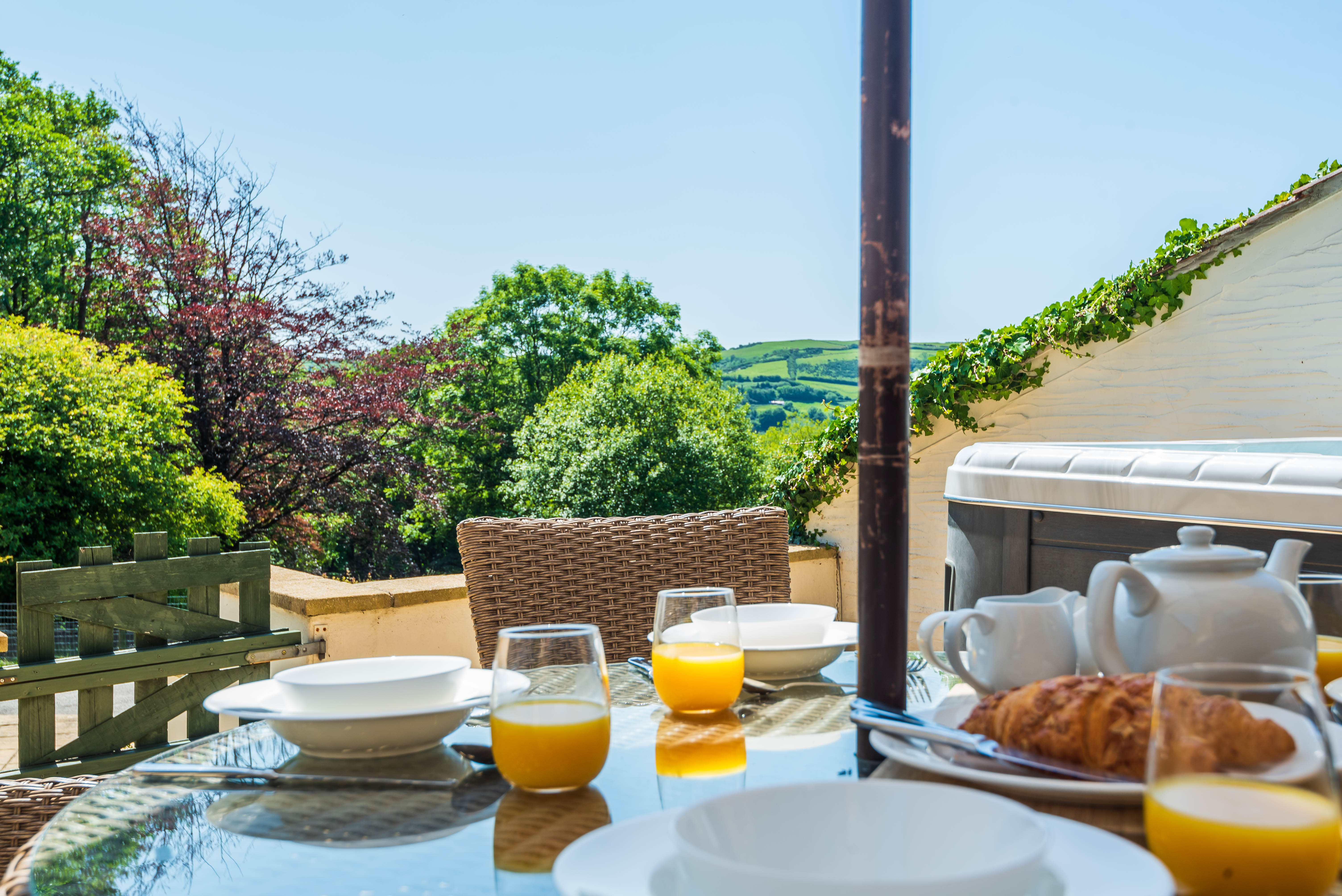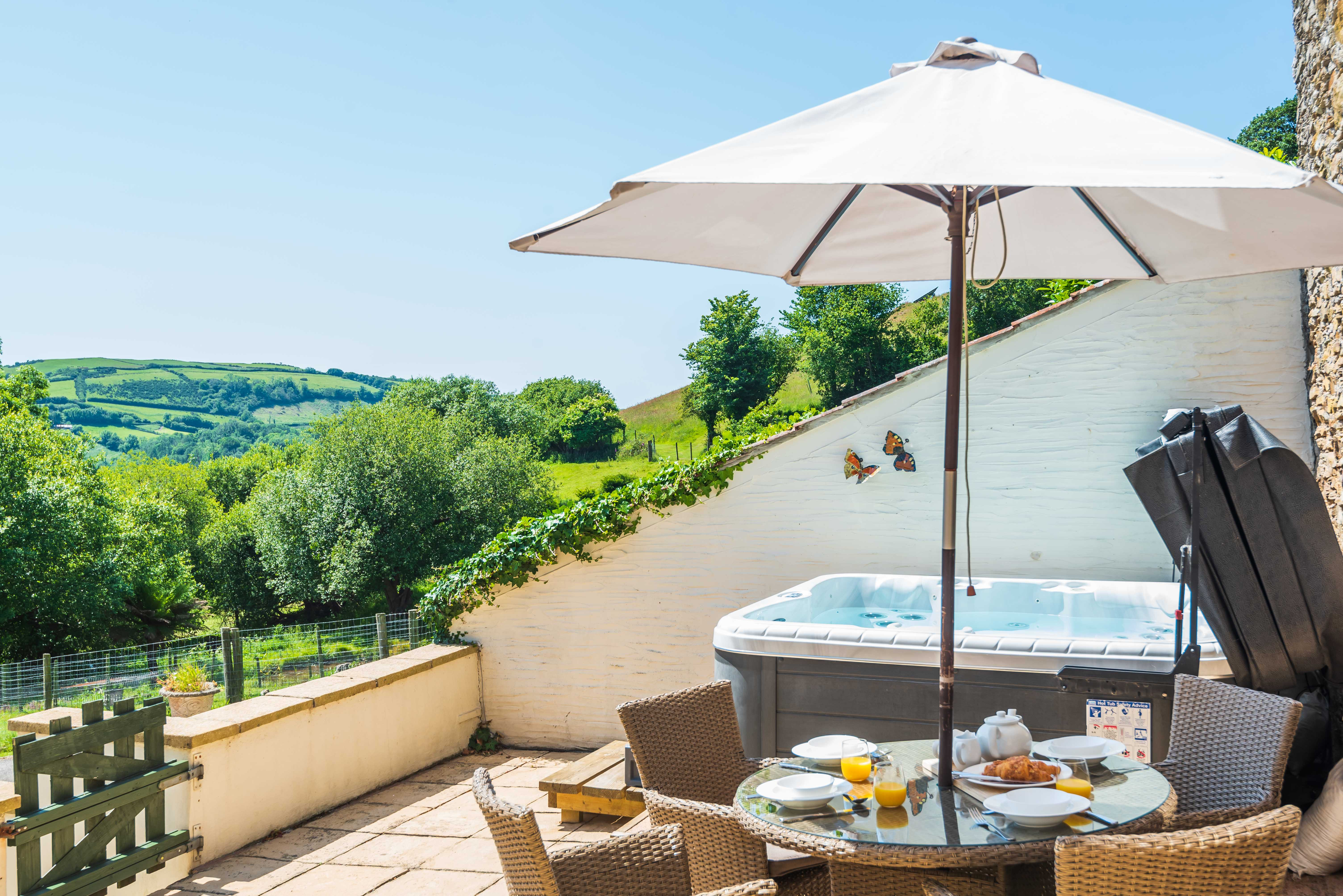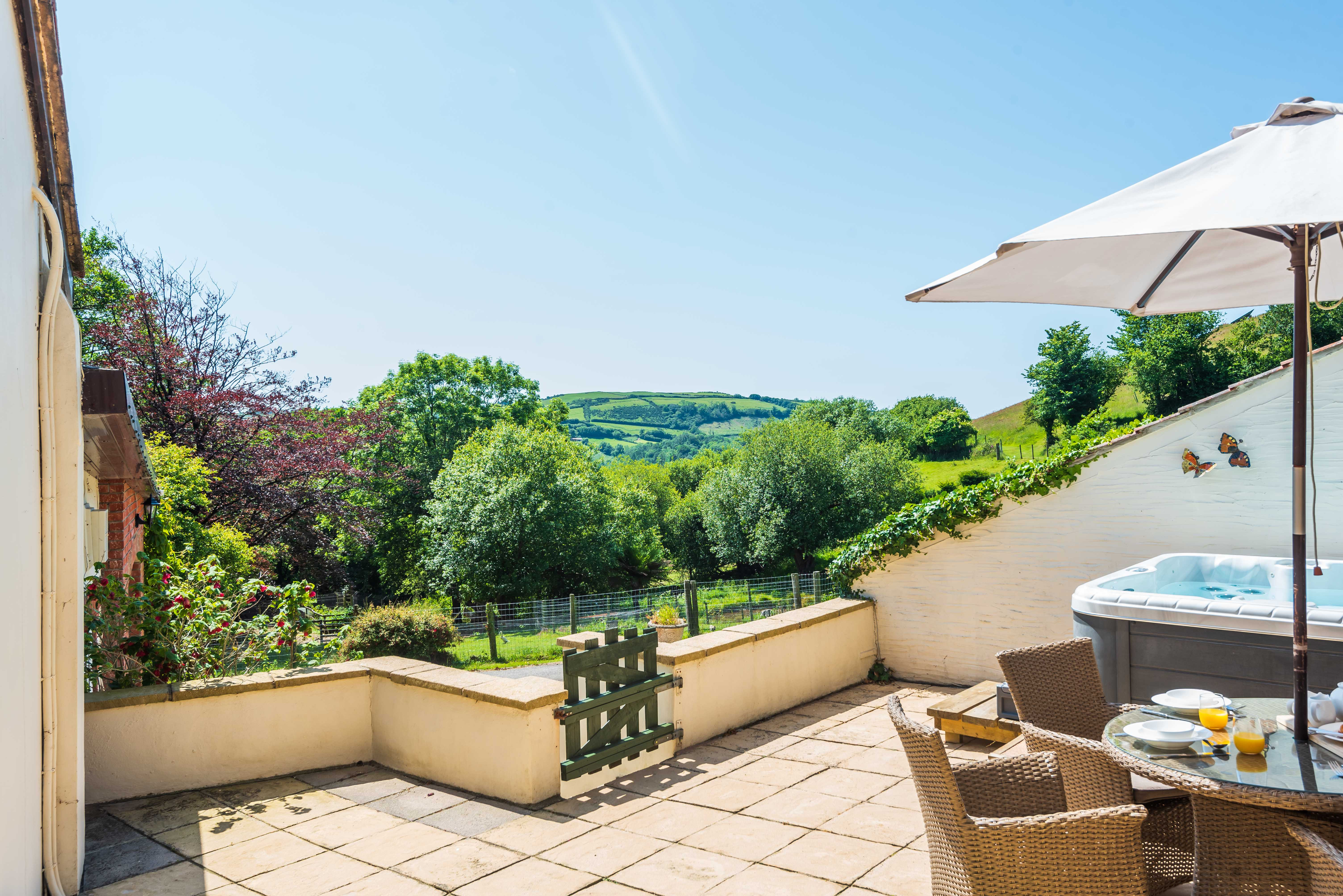 Outside is a private enclosed terrace with views over the animal paddocks and valley, with private hot tub, garden furniture, barbecue, chimenea and beautiful views.