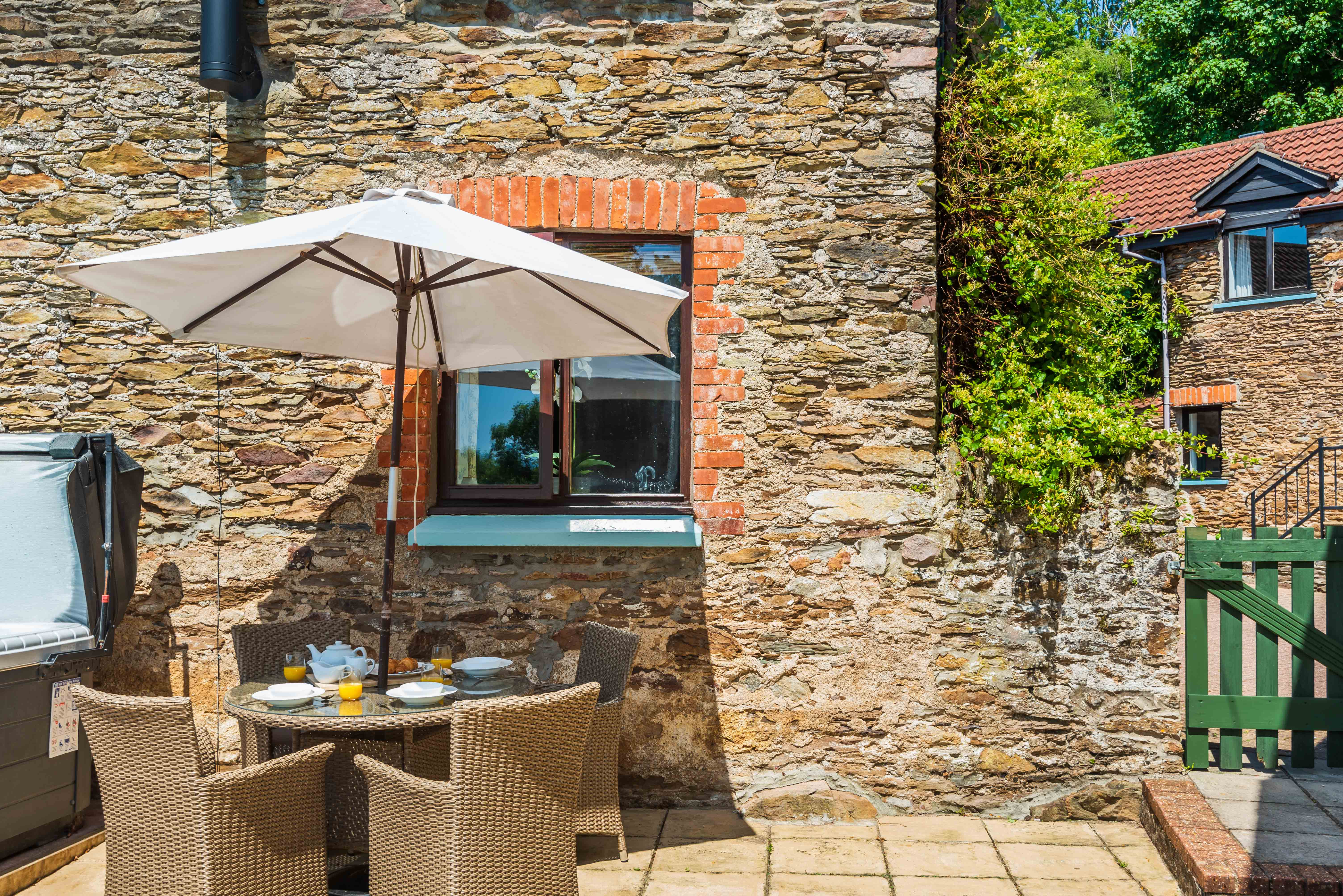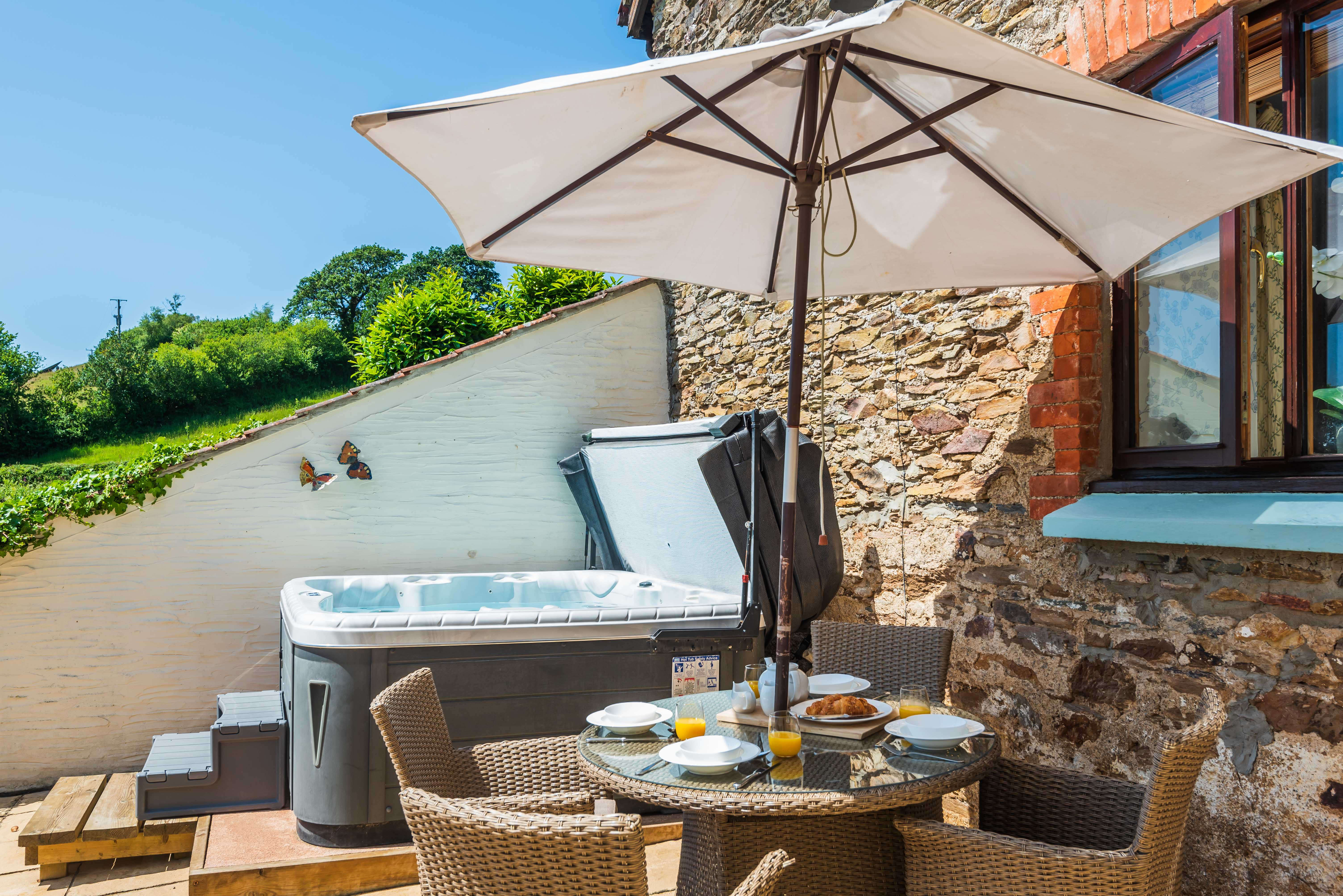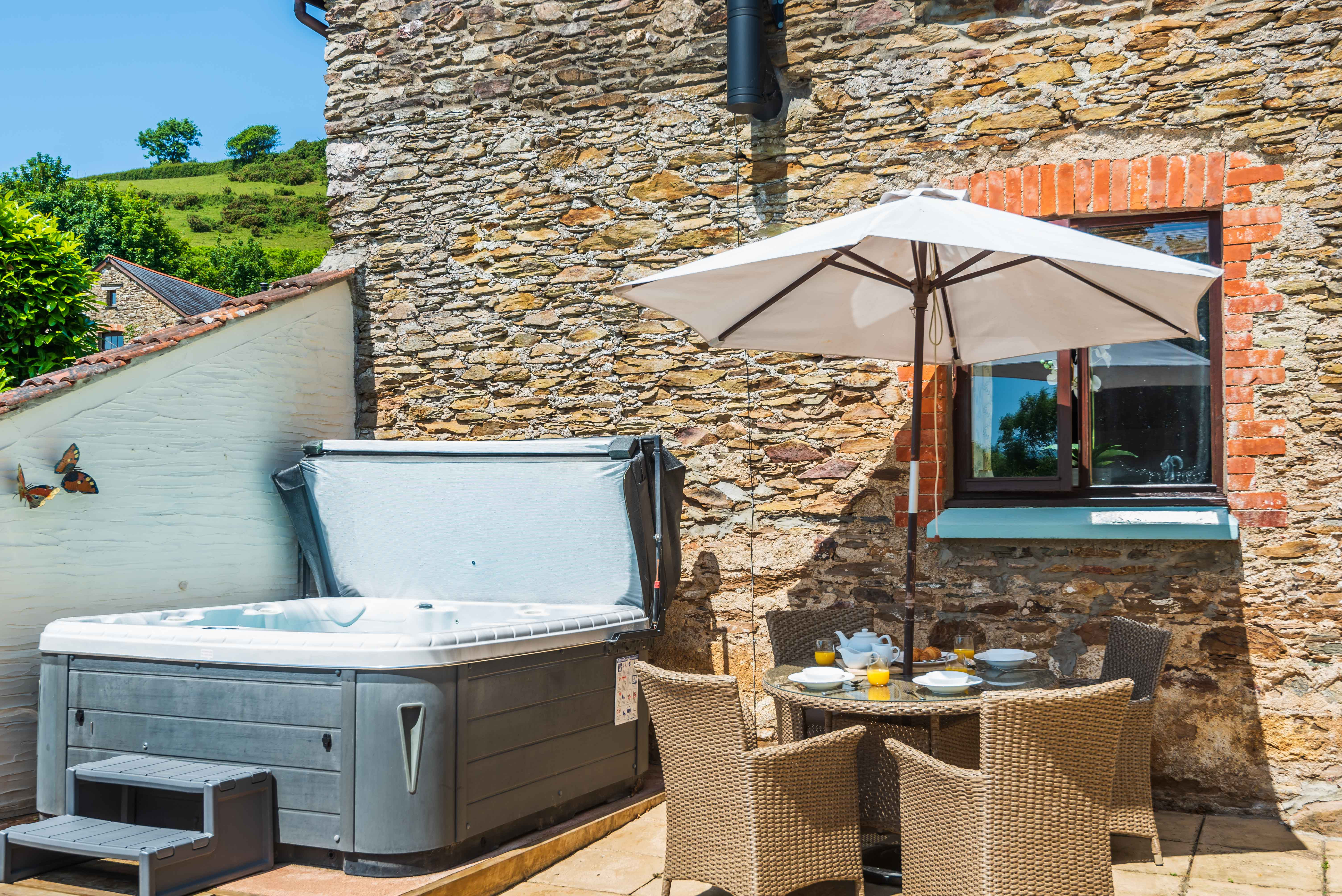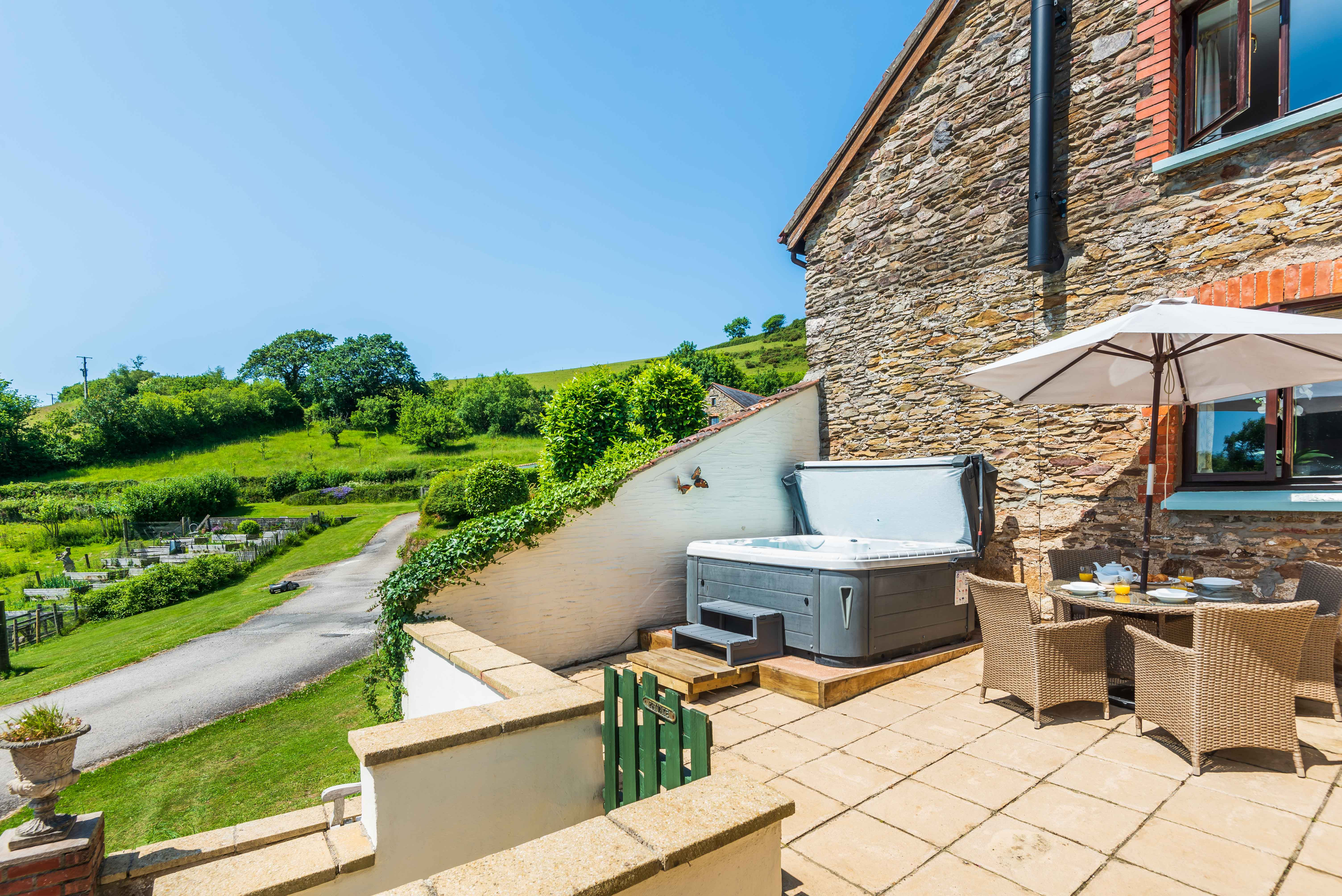 Outside is a private enclosed terrace with views over the animal paddocks and valley, with private hot tub, garden furniture, barbecue, chimenea and beautiful views.