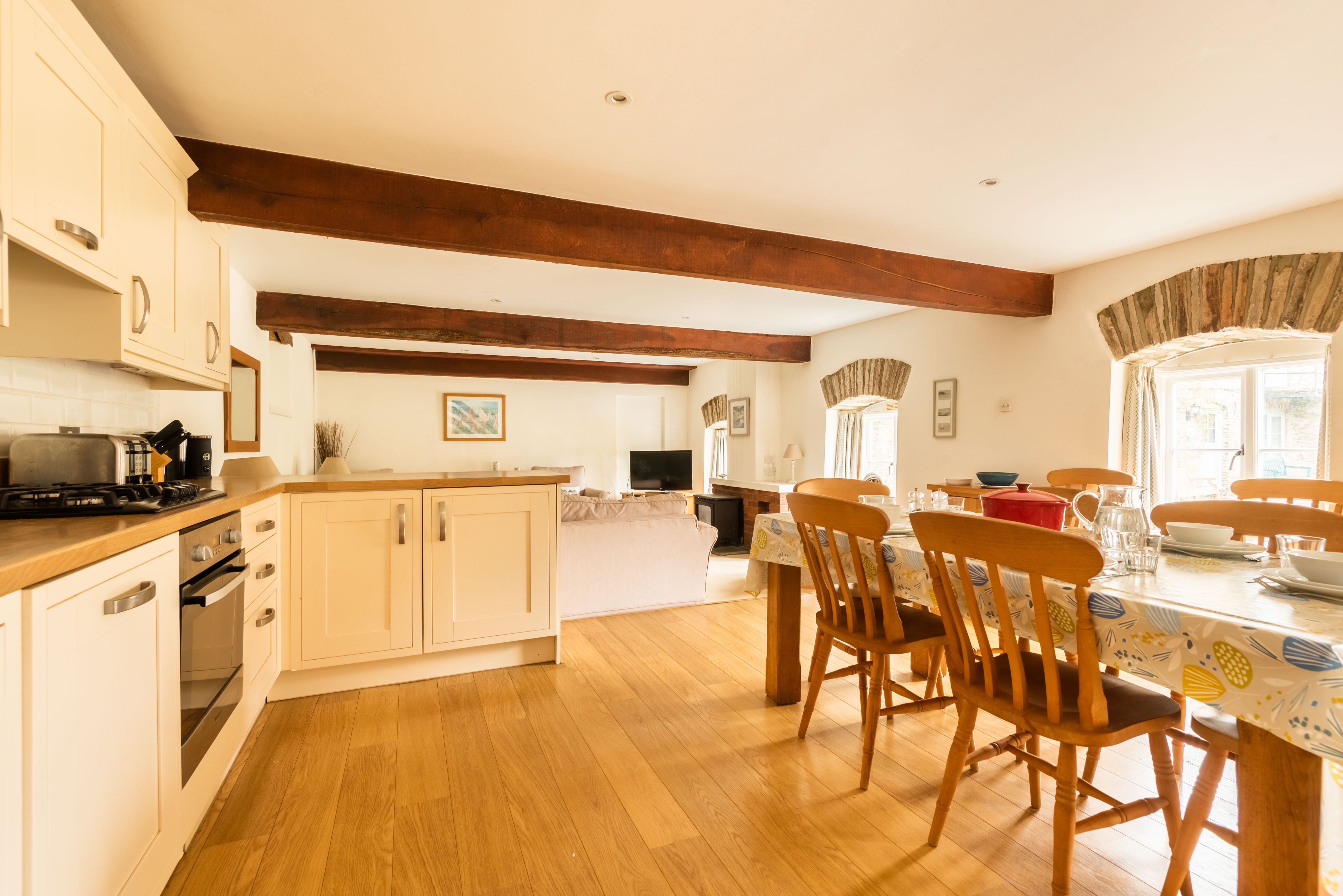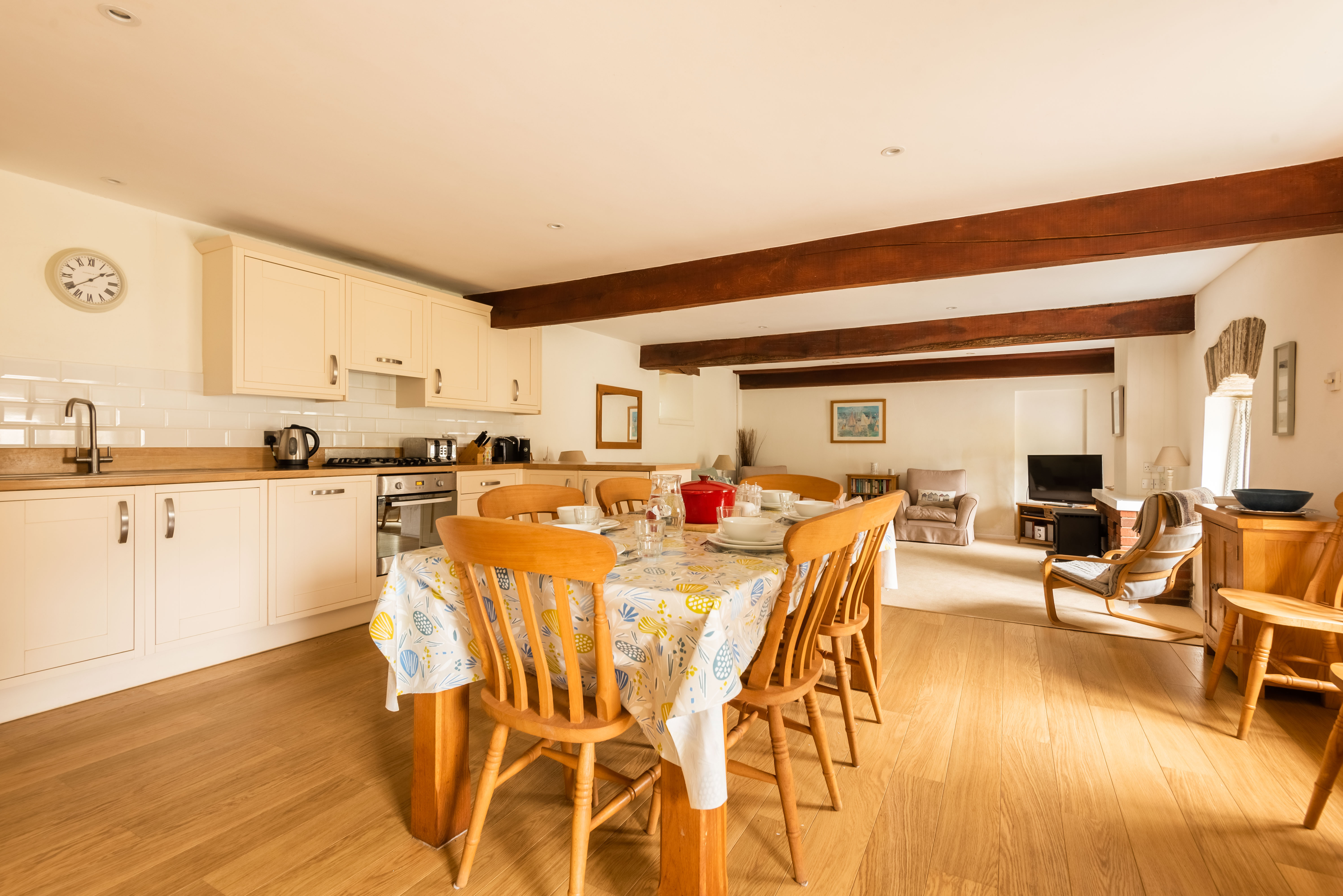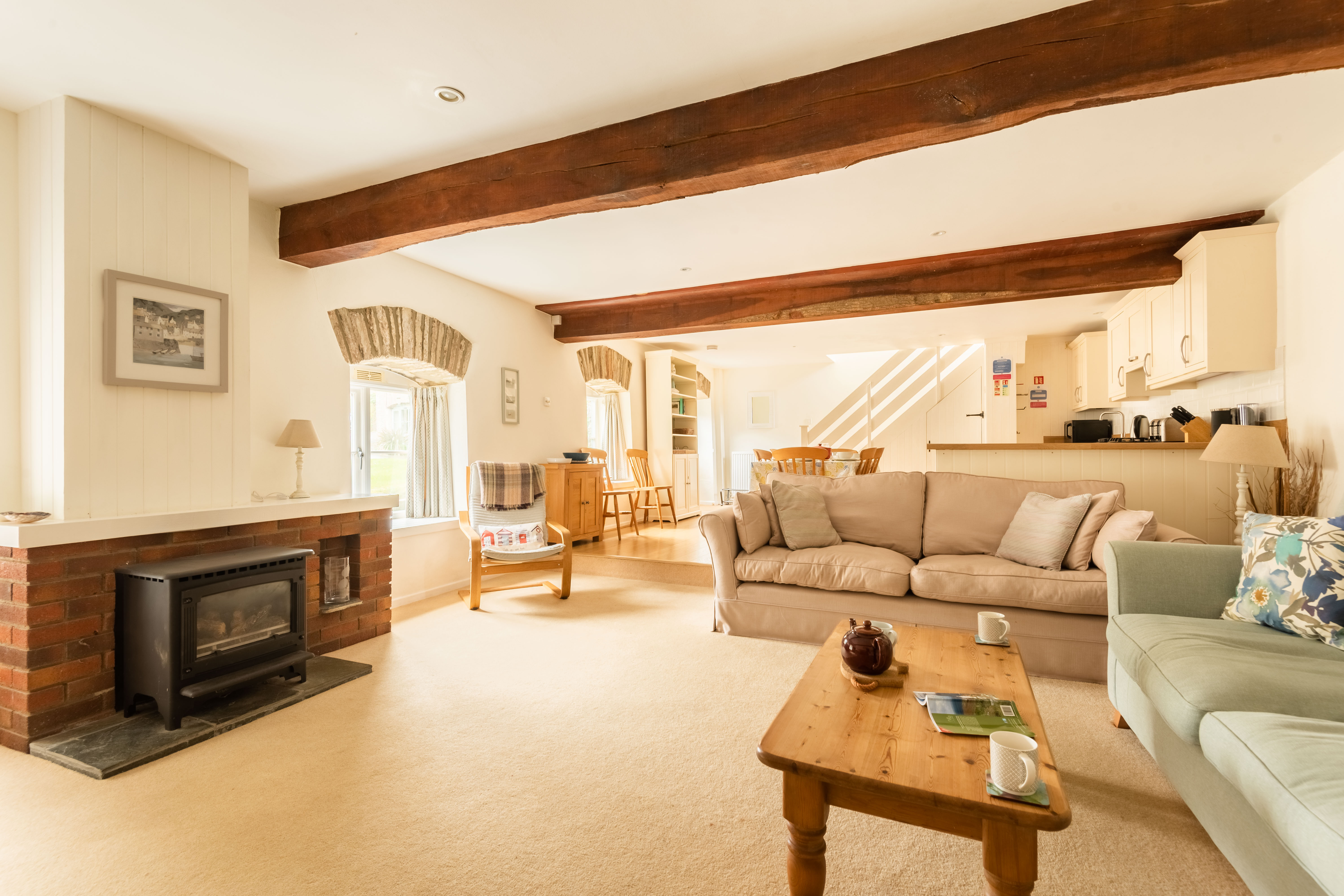 Beeches Cottage is the largest at Buckland Court, has full central heating and sleeps 6 to 8 people in three bedrooms with full-size beds, and a sofa bed in the living room. Downstairs, a striking feature of the cottage is its spacious open plan living and dining room.