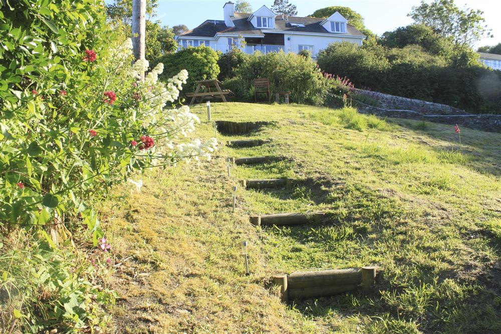 Outside: Steps up to sloping garden with picnic table and barbecue platform.