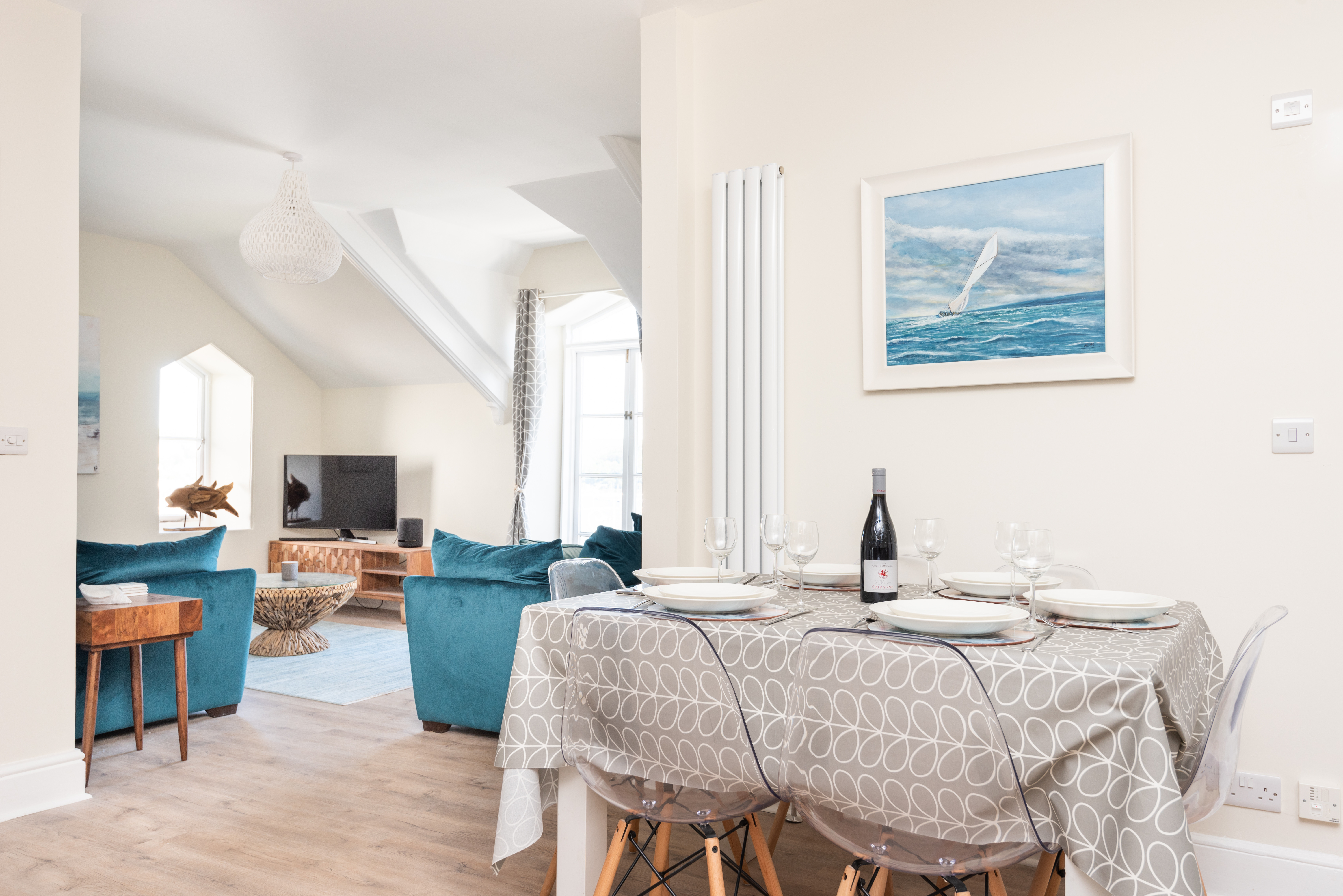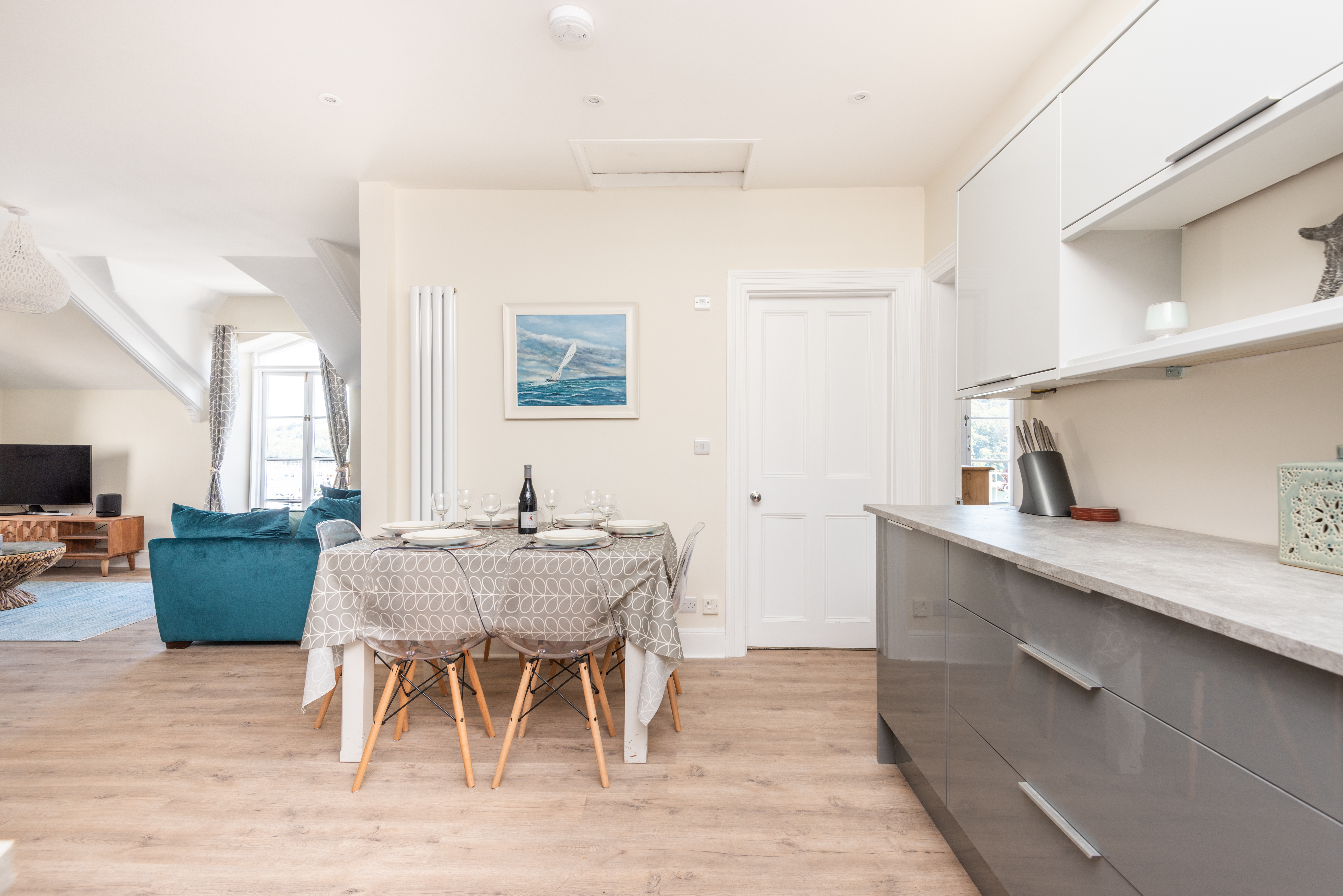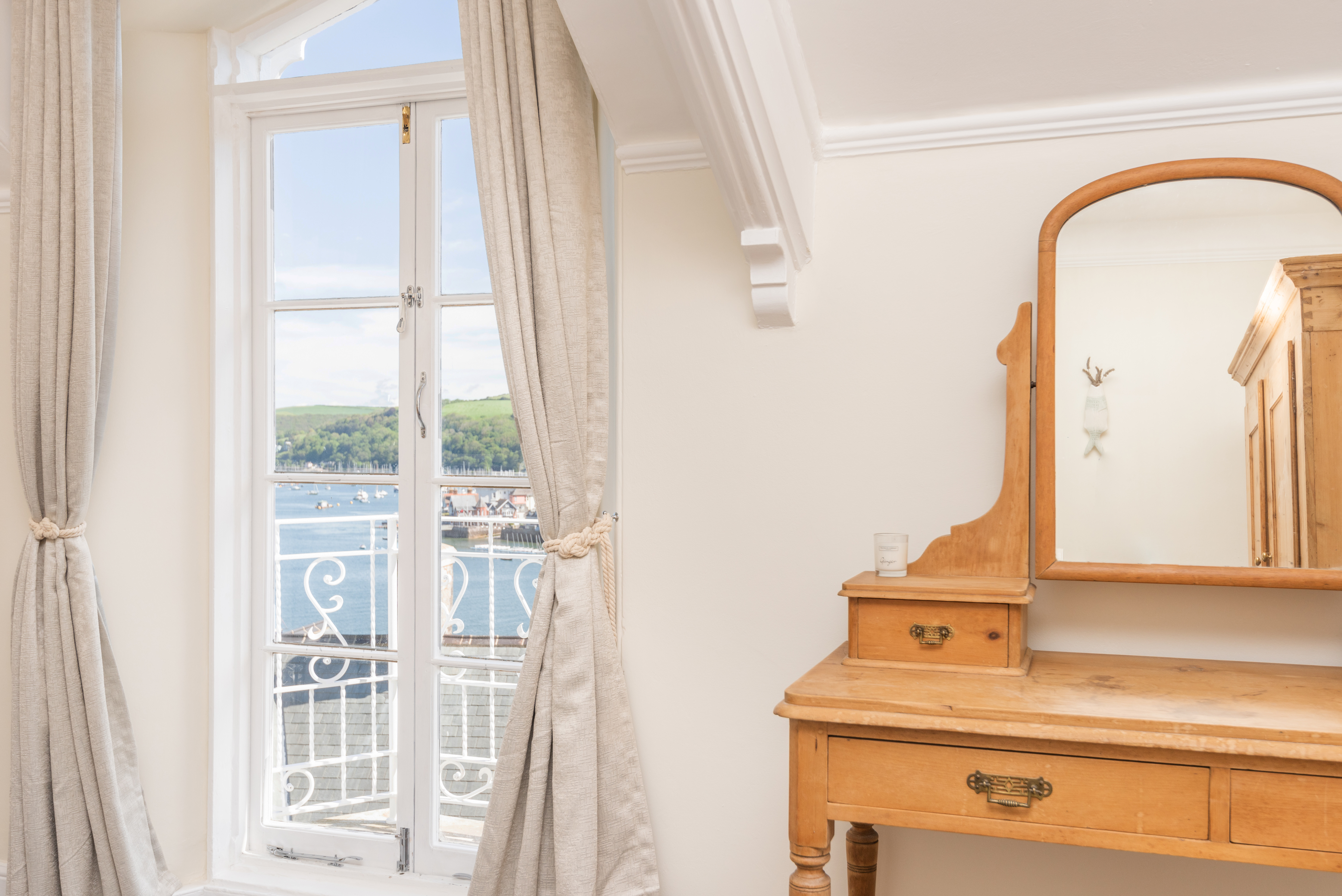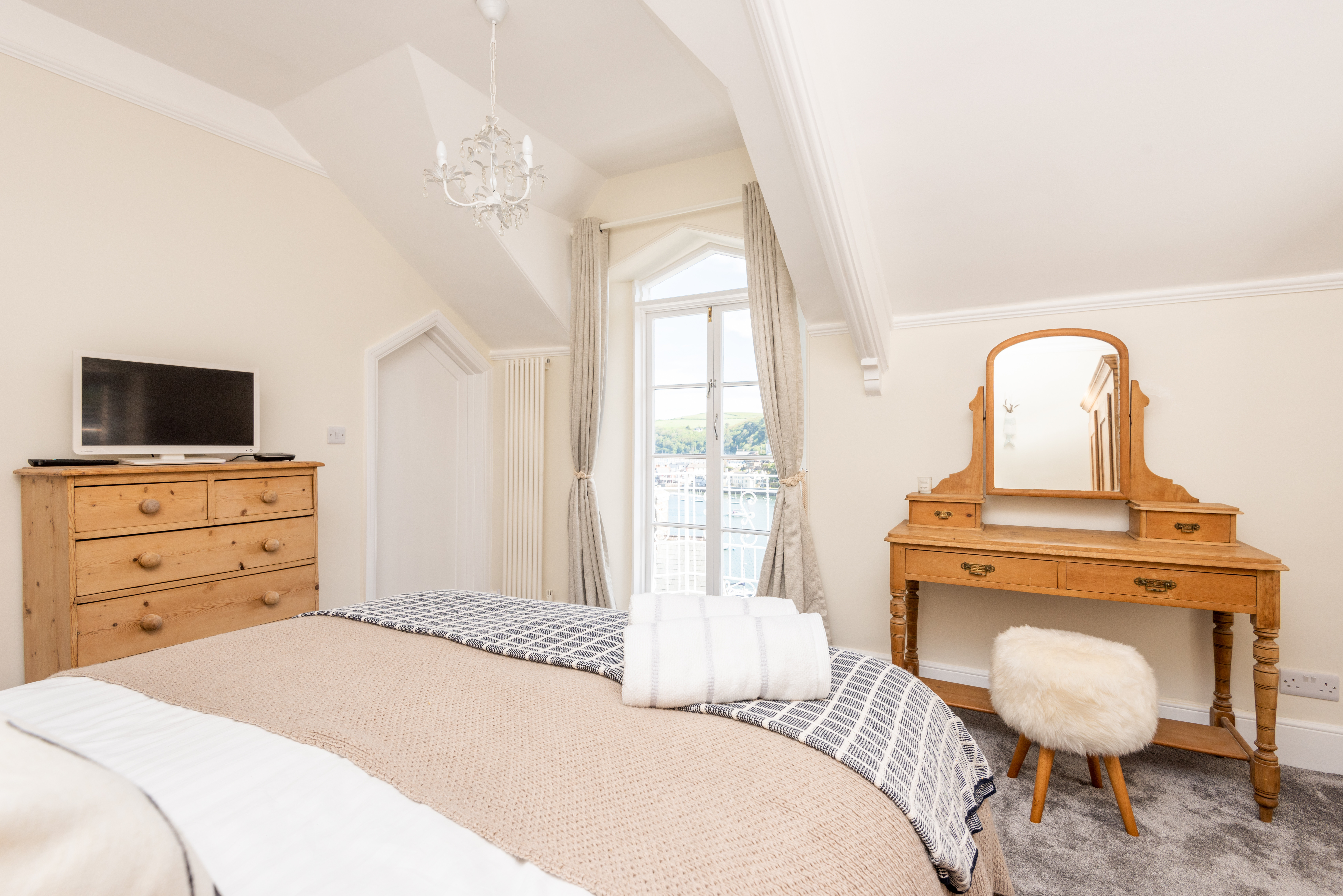 The Holt is an immaculately finished apartment situated on the top floor of an elegant yet grand period property (which may be rented as a 6 bedroom house), ideally located to appreciate the absolute best Dartmouth has to offer. Enjoy the delights of the town’s vibrant centre and riverside embankment which is just over a 10 minute stroll away and offers a wide range of interesting shops, galleries, cafes, restaurants and pubs. Alternatively walk for just a few minutes in the opposite direction and relax in the peaceful Warfleek Creek area which offers its visitors access to a quiet and secluded part of the river, benches on the water’s edge and a short footpath on to the historic Dartmouth castle and its well-run café. The little-known Gallant’s Bower and Sugary Cove’s delightful beach are also within easy walking distance, perfect for a picnic and some stone skimming. After a day out exploring, rest in comfort on the property’s raised patio with views of the Dart Valley or in the property itself which boasts two small balconies with enviable river views and a sweeping outlook across Kingswear, Dartmouth and the Royal Britannia Naval College. The property has been stylishly designed to a good spec and presented with the guest in mind, featuring tasteful and comfortable furnishings, a digital television with Netflix and more, as well as an Amazon Alexa for music streaming.